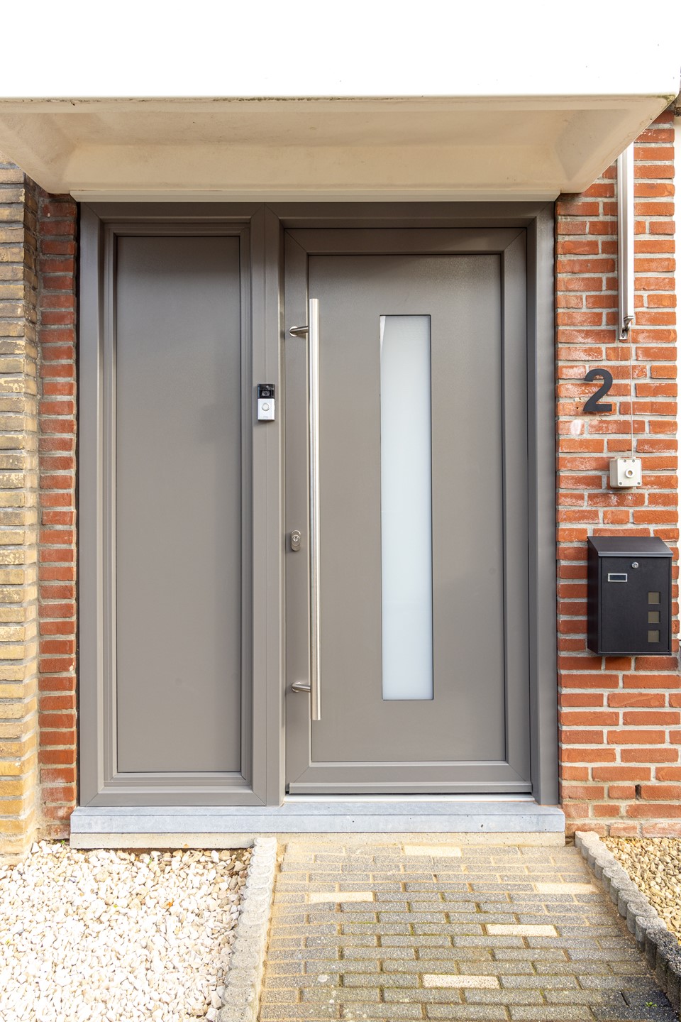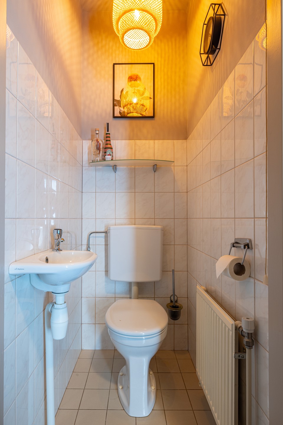 Je komt binnen via de ontvangsthal, waar meteen de verzorgde indruk van de woning opvalt. De hal is afgewerkt met een tegelvloer die doorloopt naar de woonkamer en keuken, wat zorgt voor een rustig geheel. Hier bevinden zich de garderobe, meterkast en het toilet met fonteintje. Vanuit de hal stap je de woonkamer binnen.