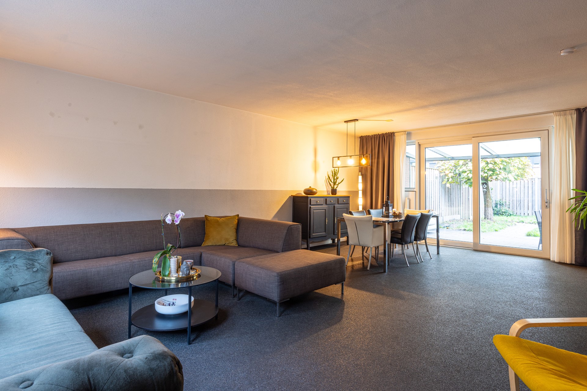 De doorzonwoonkamer is een fijne, lichte leefruimte die dankzij de grote ramen aan zowel de voor- als achterzijde baadt in natuurlijk daglicht. De grindvloer loopt hier mooi door en vormt een strakke basis voor iedere woonstijl van modern tot landelijk. De kunststof kozijnen met HR-glas zorgen voor goede isolatie en weinig onderhoud.