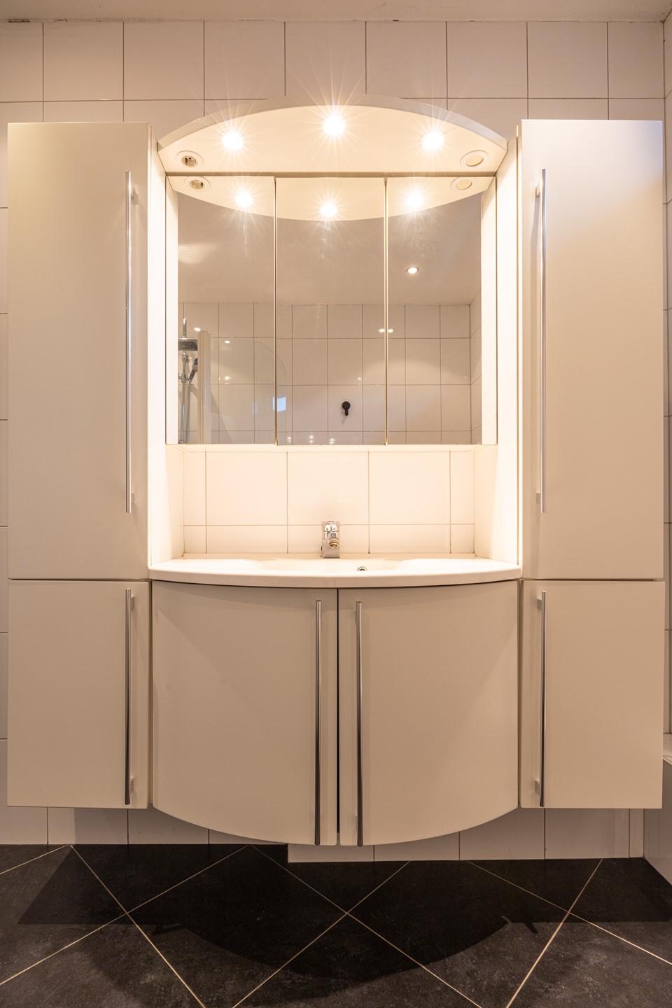 De badkamer is netjes en verzorgd afgewerkt met lichte wand- en vloertegels en een kunststof kozijn met HR-glas, wat zorgt voor een frisse en onderhoudsvriendelijke ruimte. Er is een zitbad met geïntegreerde douche, perfect voor wie graag de keuze heeft tussen snel douchen of ontspannen baden. Daarnaast vind je er een zwevend badkamermeubel met wastafel, een spiegel met verlichting en een designradiator die zorgt voor extra comfort op koelere dagen. Alles bij elkaar is het een praktische en verzorgde badkamer waar je alles bij de hand hebt.
