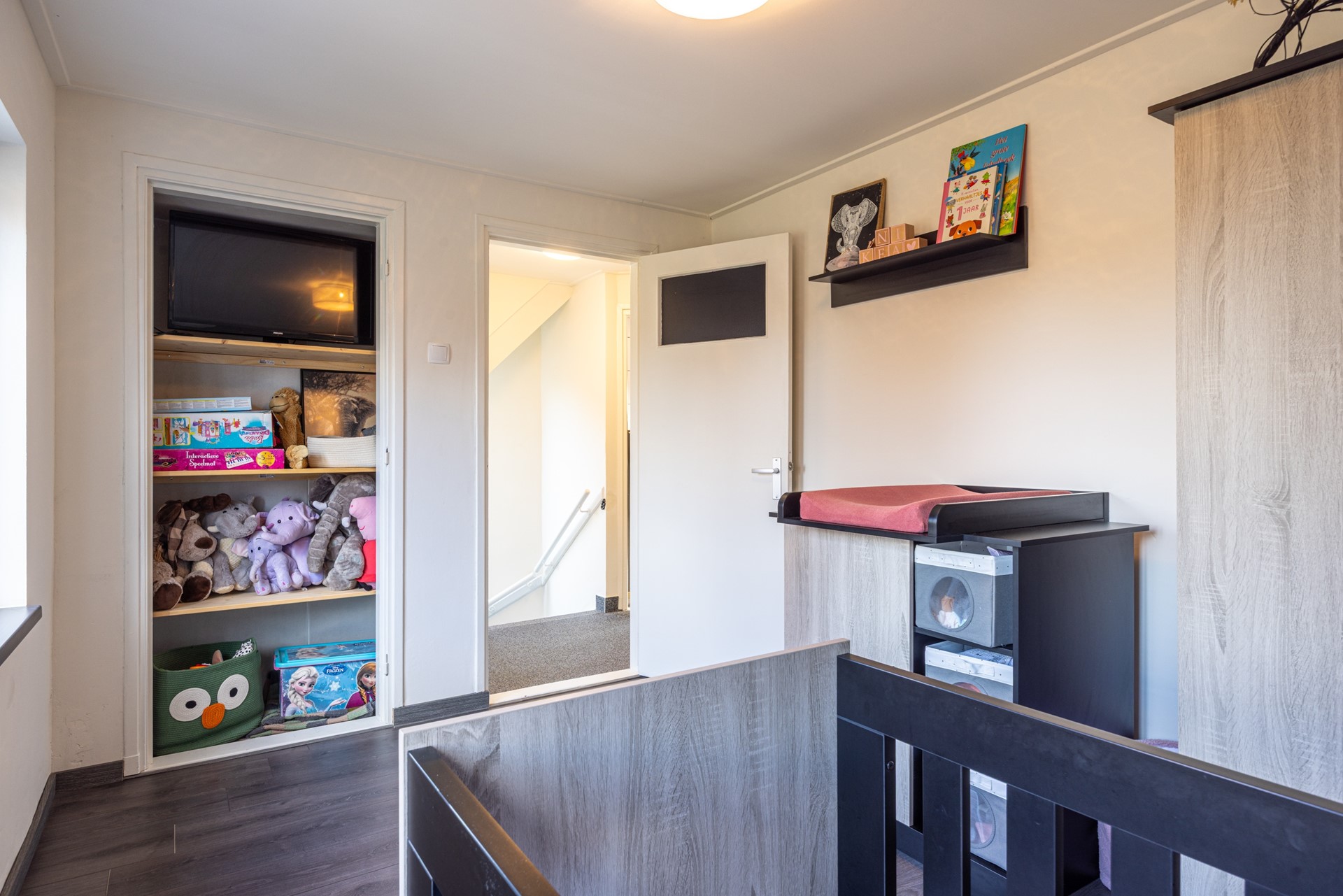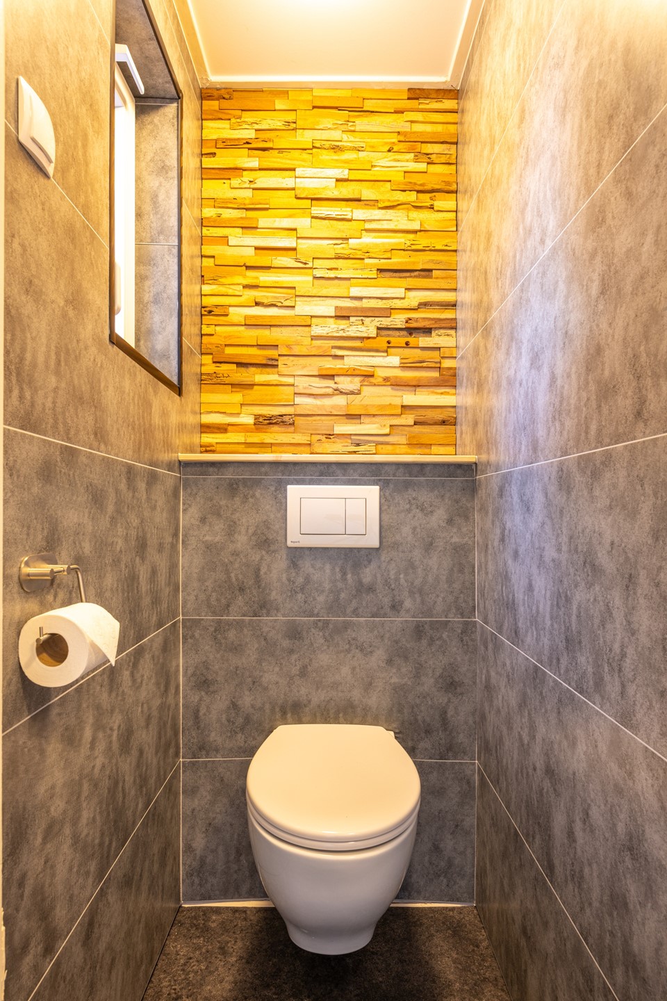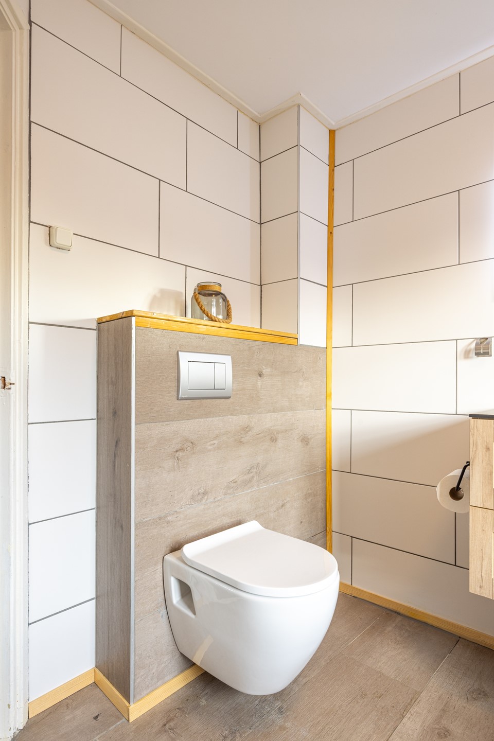 Bij aankomst valt direct de verzorgde uitstraling op. De brede oprit biedt plaats aan meerdere auto’s en via de dubbele houten poort is de tuin bereikbaar. Binnen word je verwelkomd in een nette hal met grindvloer, garderoberuimte en de vernieuwde meterkast uit 2024. Vanuit de hal is er toegang tot het toilet, dat is uitgerust met een zwevend closet en afgewerkt met sfeervolle wandbetegeling. Onder de trap bevindt zich de provisiekelder met witgoedaansluitingen, ideaal voor extra opslag of het plaatsen van wasmachine en droger.
