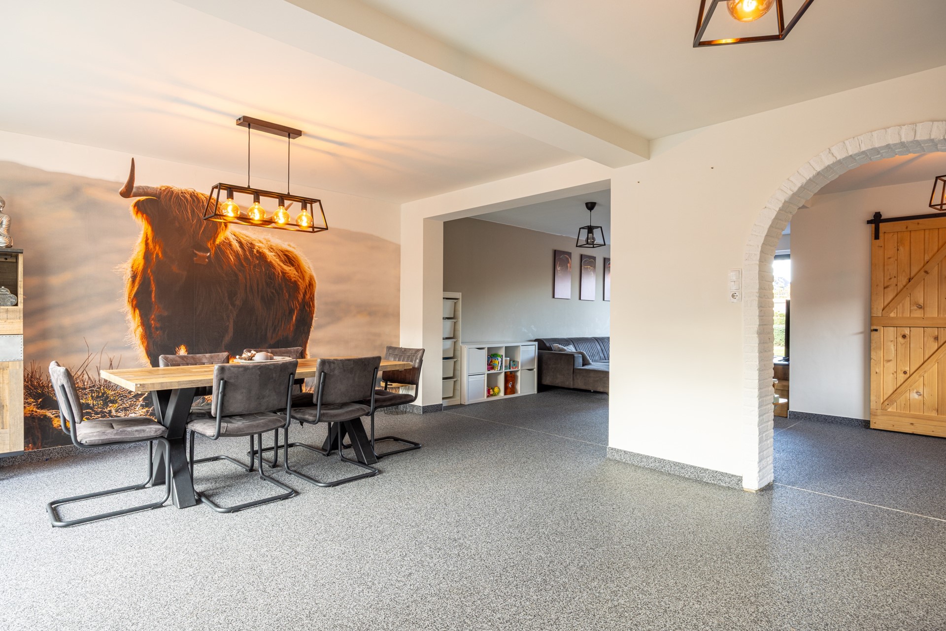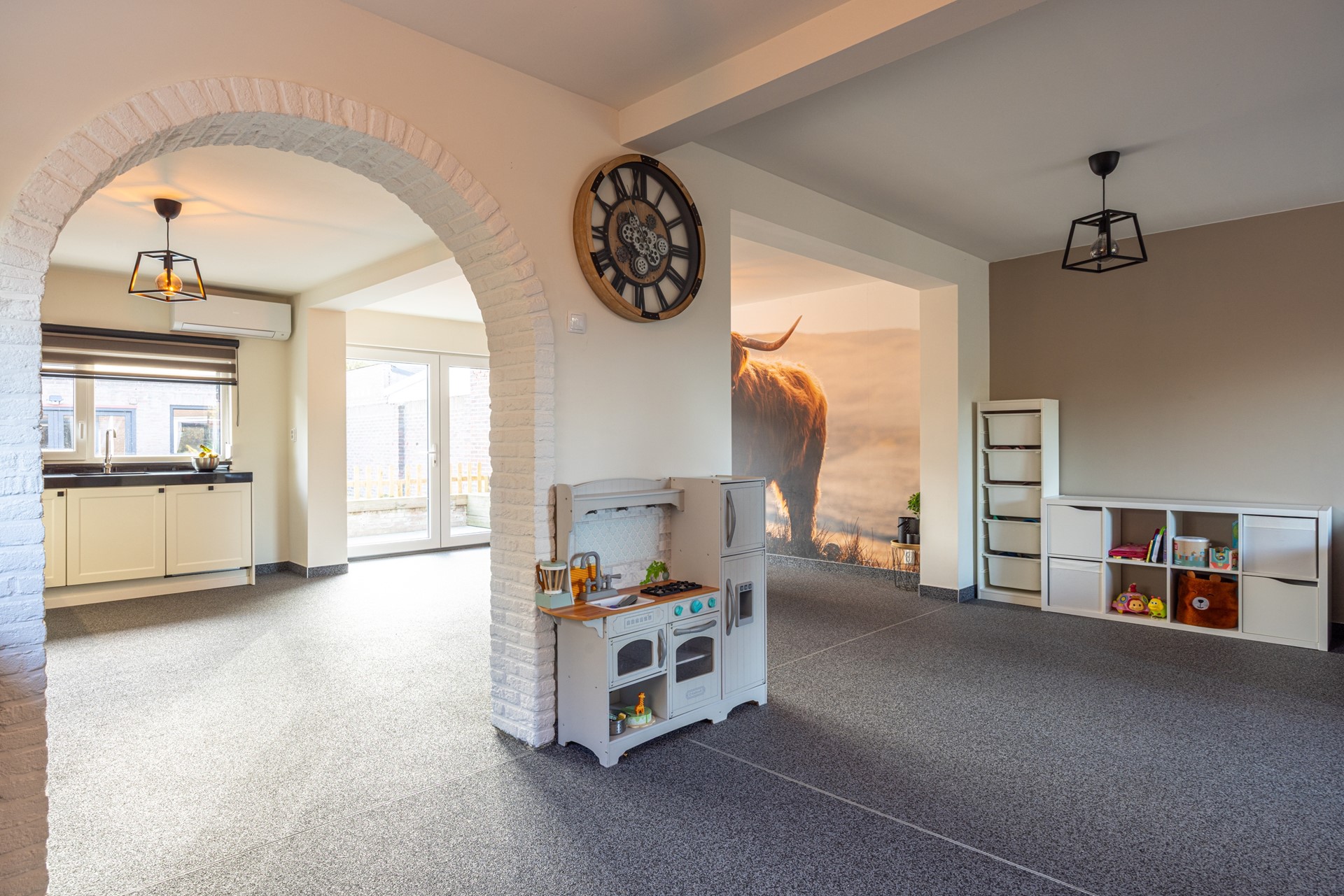 De woonkamer is verrassend ruim en licht, met grote ramen aan de voor- en zijkant die veel daglicht binnenlaten. Dankzij de grindvloer die doorloopt over de gehele begane grond ontstaat een mooi geheel. Aan de voorzijde zorgen elektrische rolluiken voor extra comfort en privacy. De airco-installatie biedt zowel verkoeling in de zomer als verwarming in de winter.