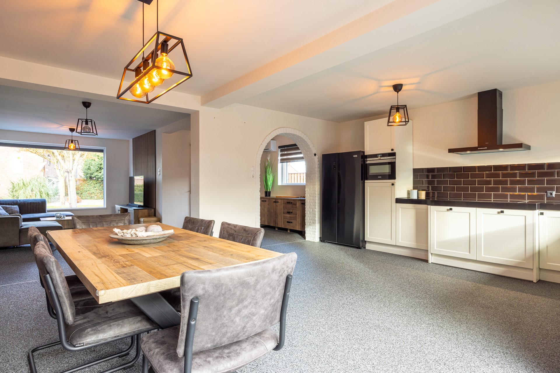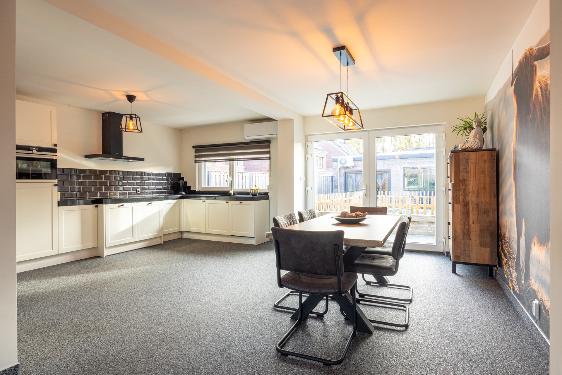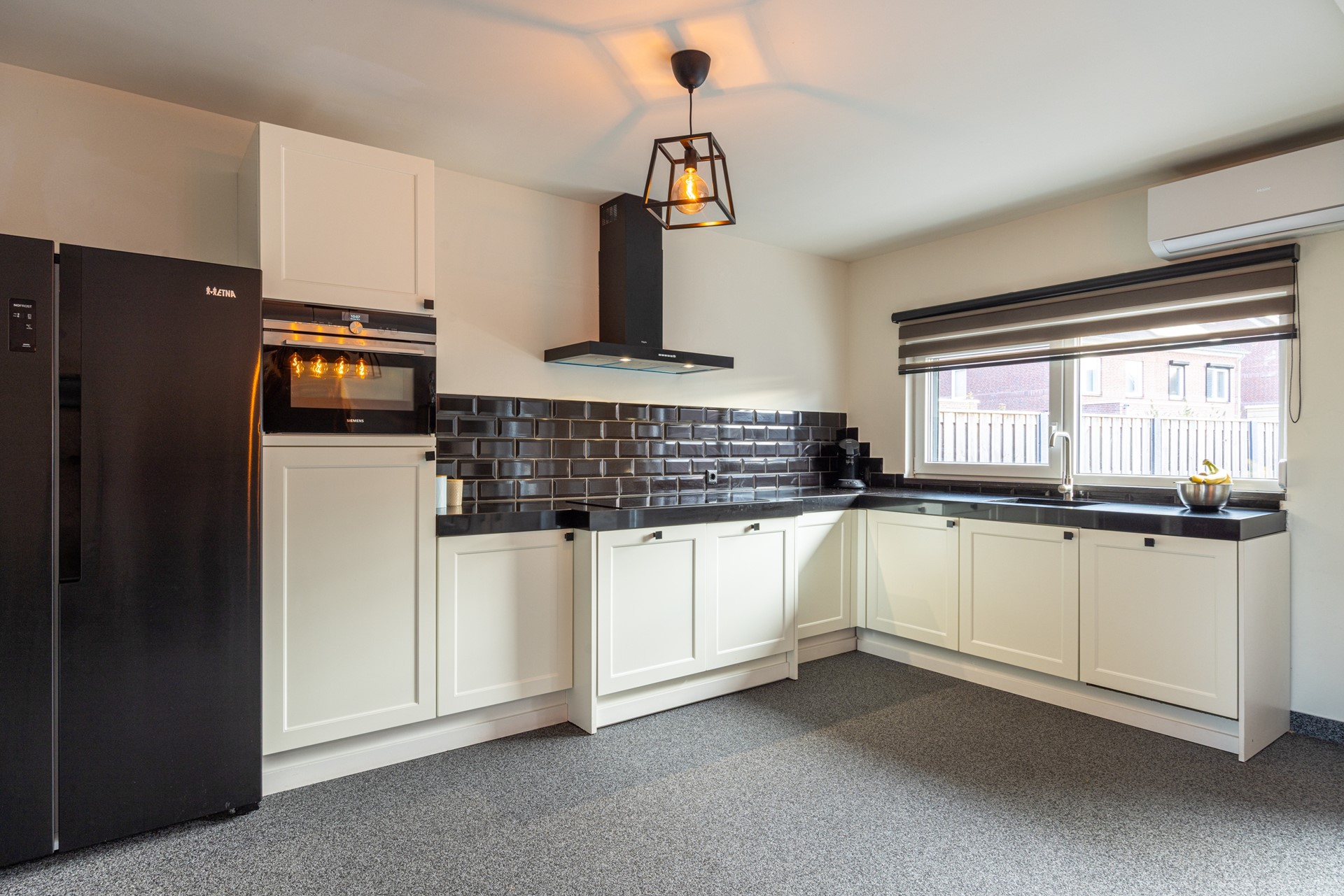 De open leefkeuken aan de achterzijde vormt het hart van de woning. De hoekopstelling biedt volop werk- en bergruimte en is uitgerust met alle wenselijke inbouwapparatuur, waaronder een inductiekookplaat met vijf zones, een combi-heteluchtoven, een Amerikaanse koelkast met vriezer en een vaatwasser. Ook hier is een airco aanwezig die kan verwarmen en koelen. Via de dubbele openslaande deuren stroomt het daglicht binnen en is er direct toegang tot de achtertuin met verwarmd zwembad.