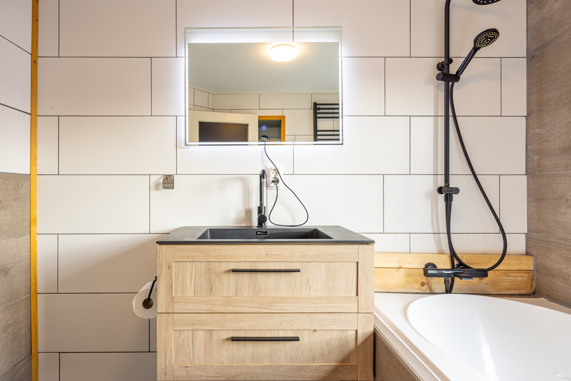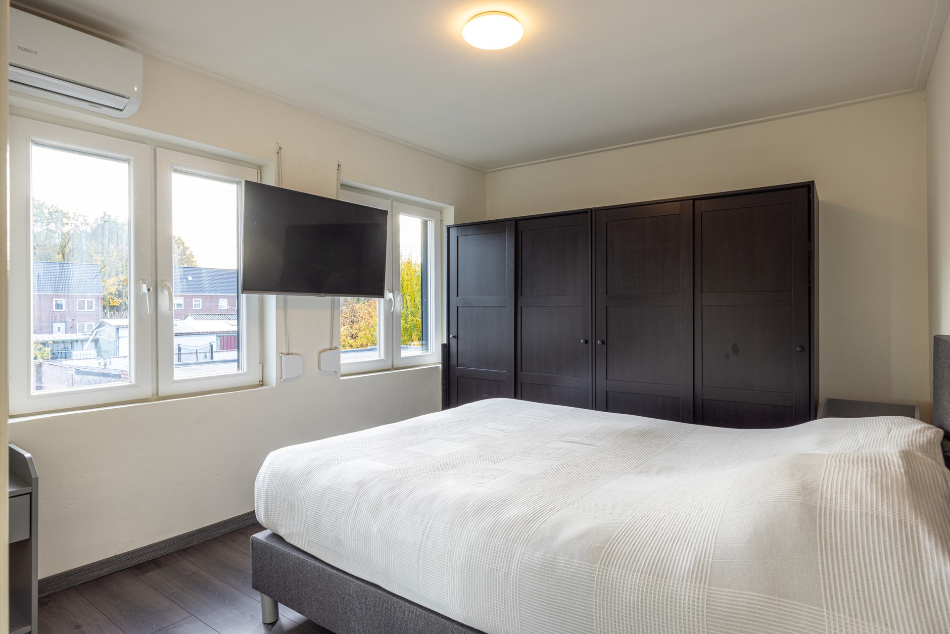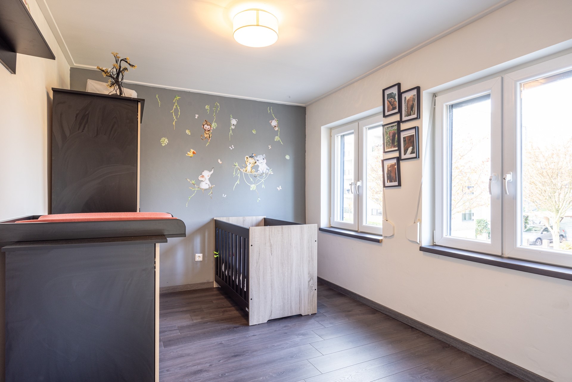 Op de eerste verdieping liggen twee ruime slaapkamers en de badkamer. De overloop en beide trappen zijn voorzien van een grindvloer, wat zorgt voor een nette en onderhoudsvriendelijke afwerking. Ook hier is een airco aanwezig die zowel kan verwarmen als koelen. De slaapkamers zijn keurig afgewerkt met laminaatvloeren, hebben rolluiken en profiteren van veel daglicht. De hoofdslaapkamer aan de achterzijde beschikt bovendien over een eigen airco-unit, ideaal voor warme zomernachten. De badkamer heeft een tegelvloer en is netjes afgewerkt met een ligbad met douche, een wastafelmeubel met spiegel, een tweede toilet en een raam met rolluik voor extra privacy en natuurlijke ventilatie.