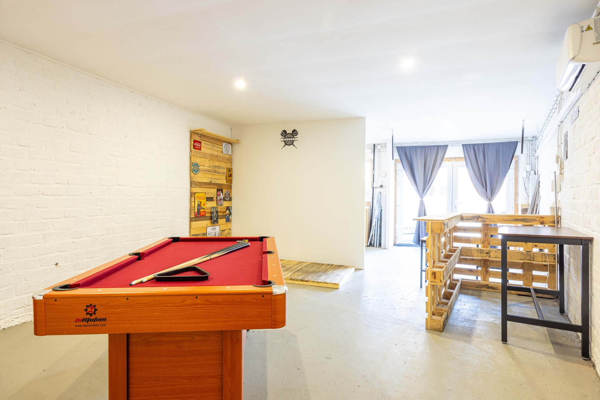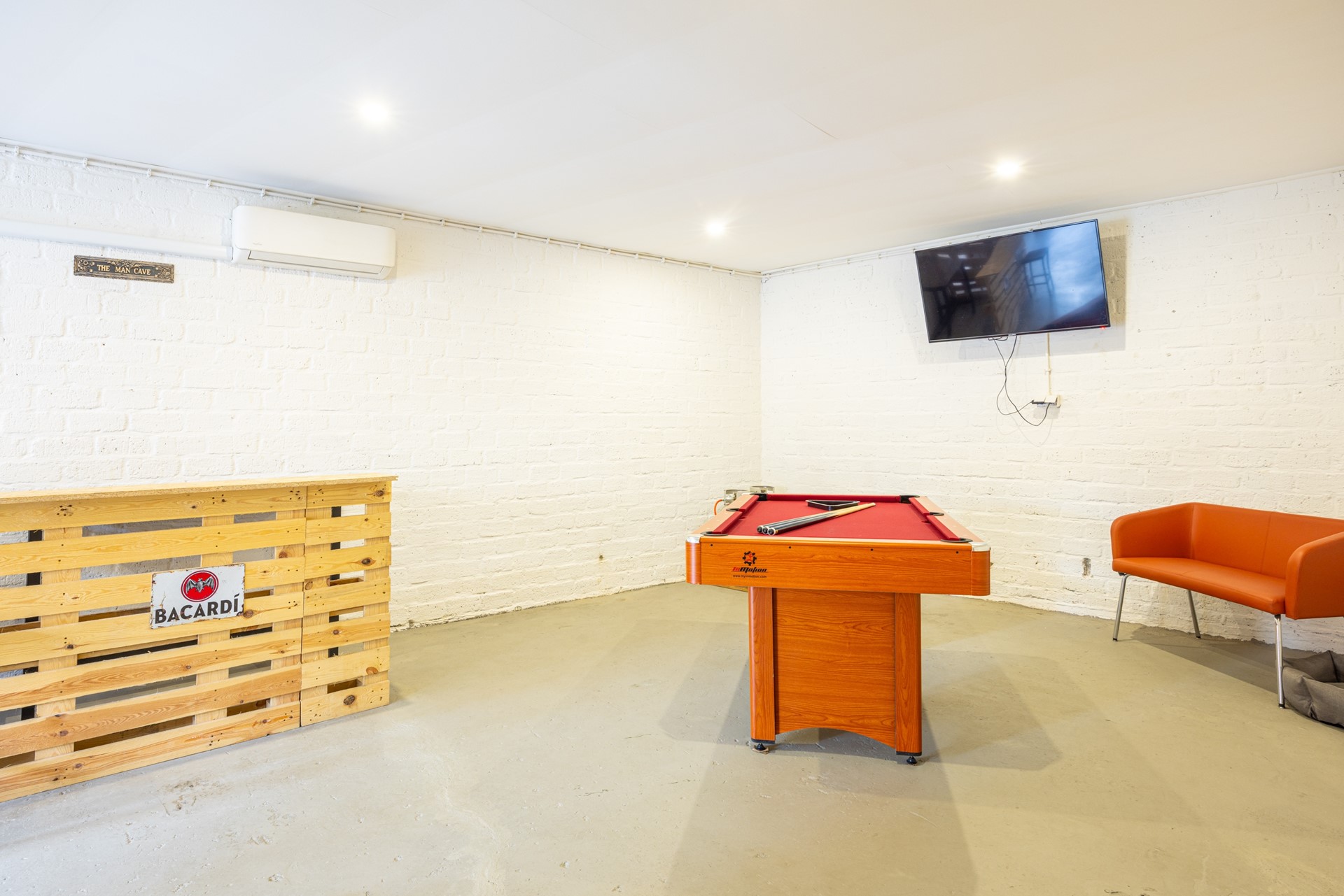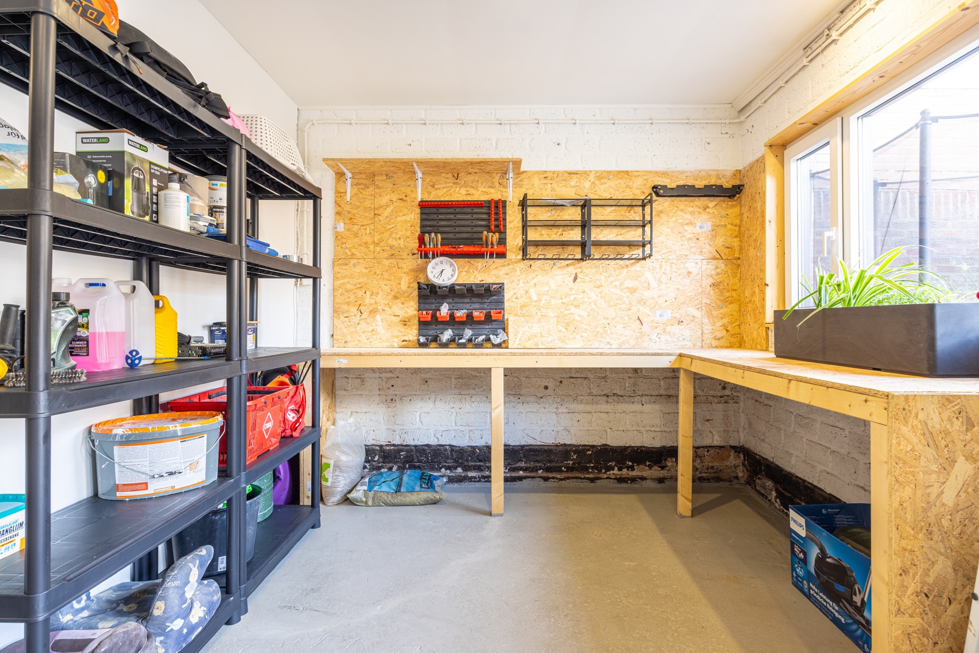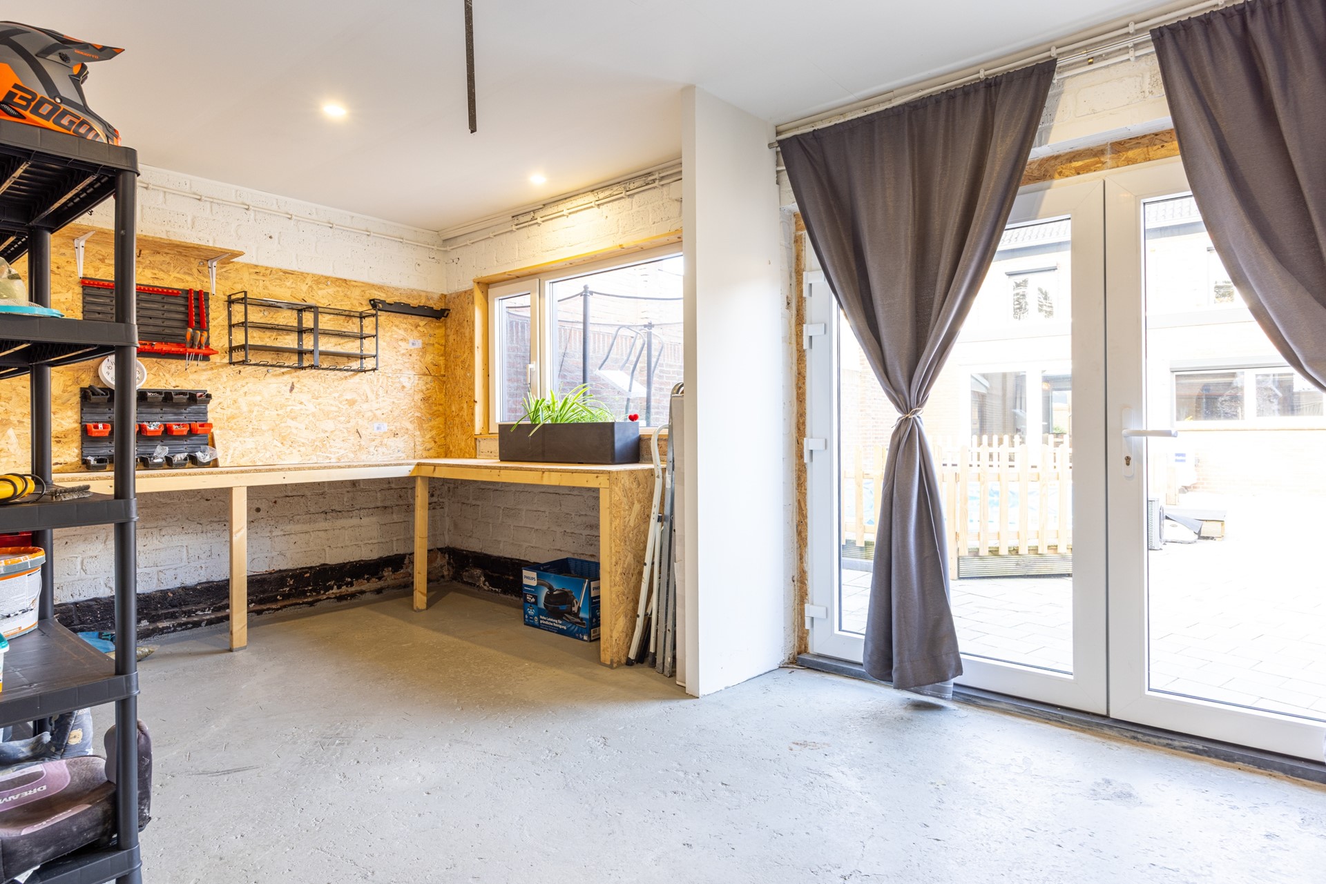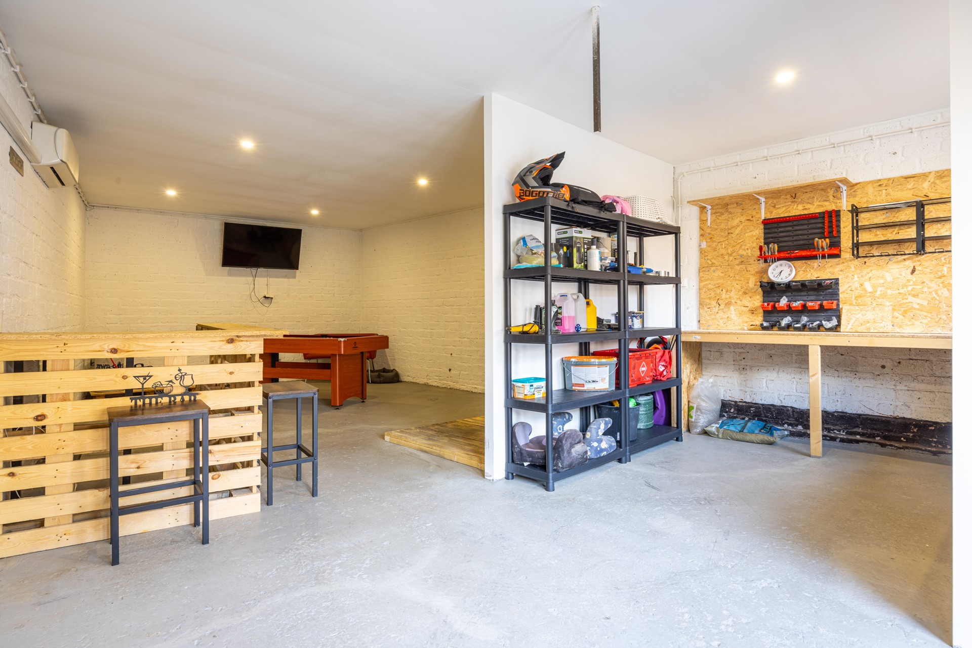 Achter in de tuin bevindt zich een royale garage die is omgebouwd tot volwaardige mancave of hobbyruimte. Deze is voorzien van kunststof kozijnen met triple glas, inbouwspots, een eigen meterkast uit 2024 en een airco-installatie die zowel kan koelen als verwarmen.