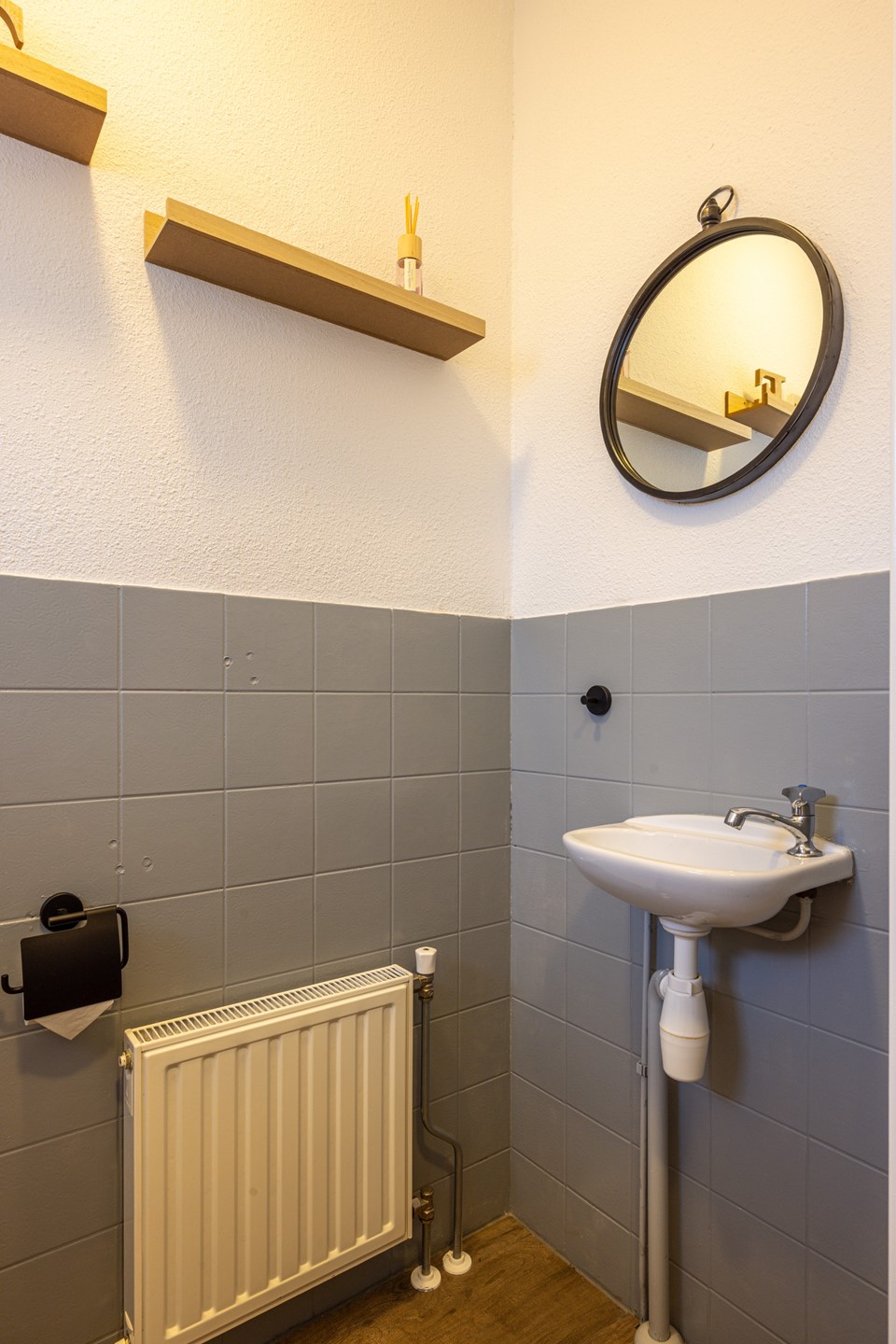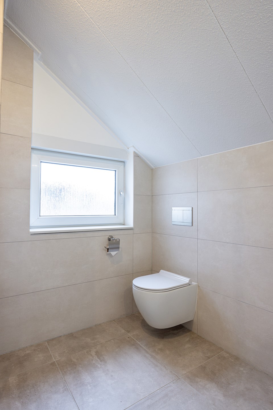 De badkamer is in 2020 vernieuwd en volledig betegeld in lichte tinten. De ruimte is voorzien van een inloopdouche met regendouche, een badkamermeubel met waskom en spiegel en een zwevend closet. De afwerking is netjes en modern.