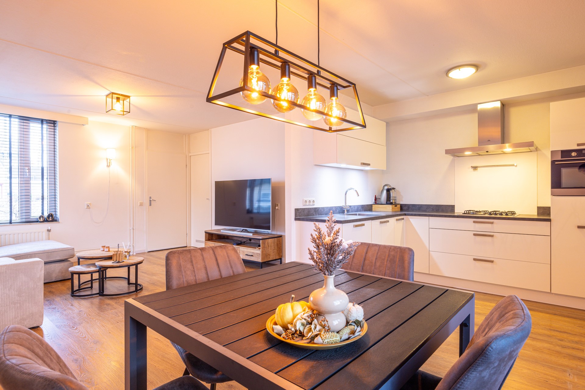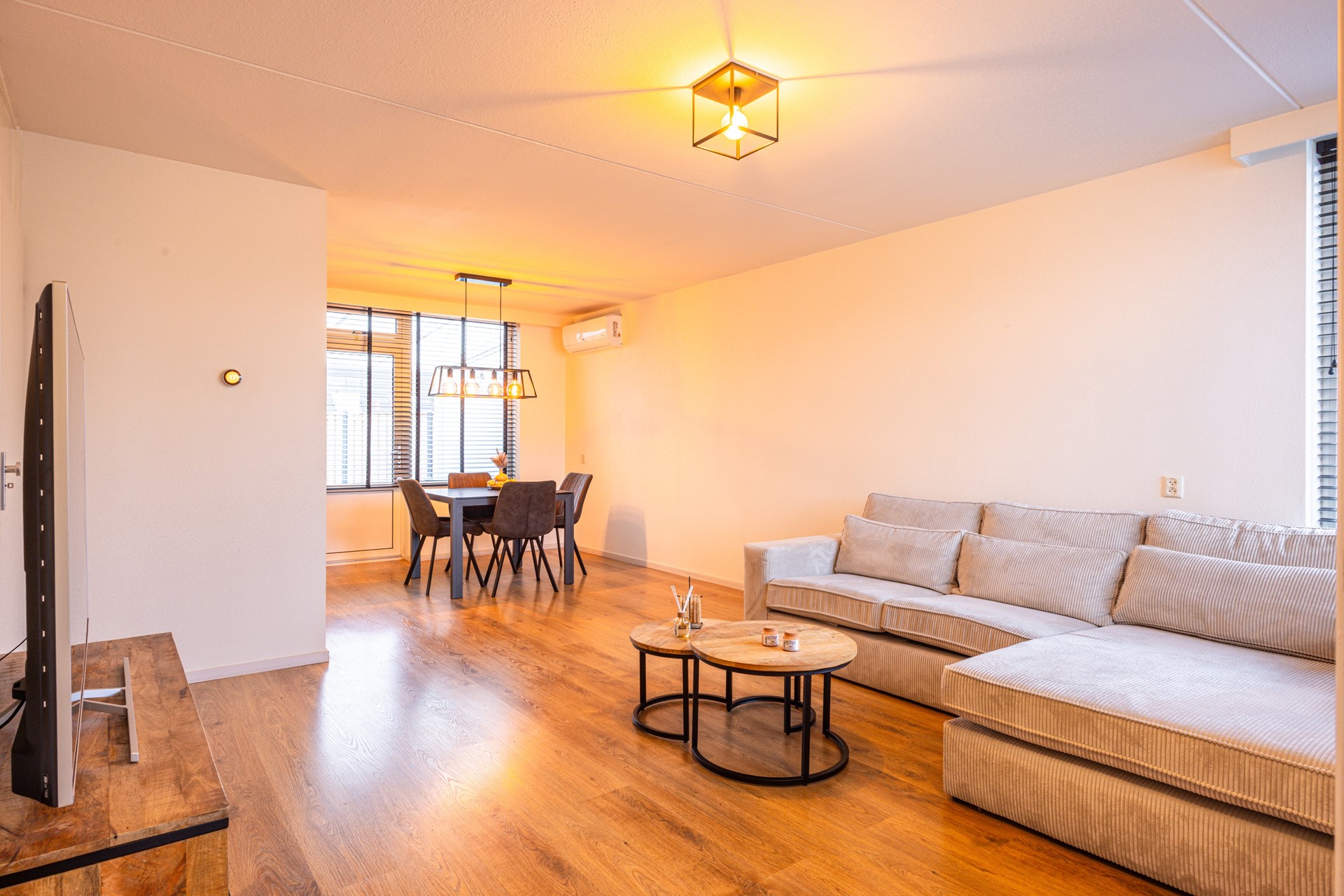 De woonkamer is licht door de grote raampartijen aan de voor- en achterzijde. De ruimte biedt voldoende plek voor een zit- en eethoek. Onder de trap bevindt zich een trapkast voor extra bergruimte. De aanwezige LG airconditioning zorgt niet alleen voor verkoeling in de zomer, maar kan tevens verwarmen in koudere periodes. Vanuit de woonkamer is er direct toegang tot het overdekte terras in de achtertuin. Via een tussenportaal bereik je de trap naar de eerste verdieping.