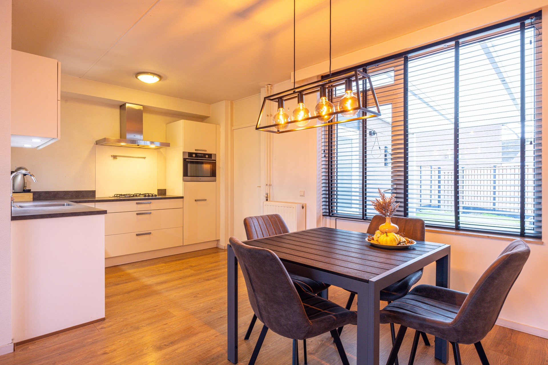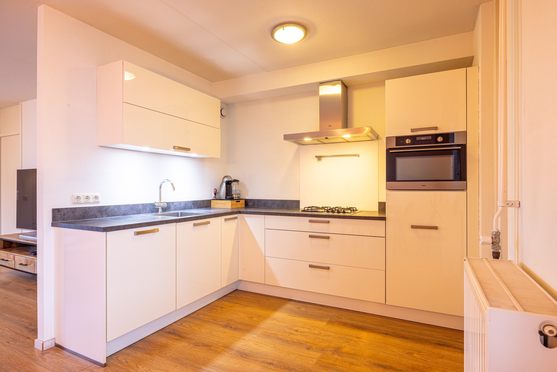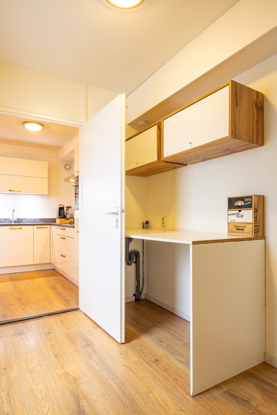 De open keuken staat in verbinding met de woonkamer en beschikt over voldoende kast- en werkruimte. De keuken is uitgerust met een gasfornuis, afzuigkap, combi heteluchtoven, koelkast en vaatwasser. Aansluitend ligt de bijkeuken met witgoedaansluitingen en extra ruimte voor opslag. Zowel vanuit de keuken als vanuit de bijkeuken is het terras in de achtertuin bereikbaar.