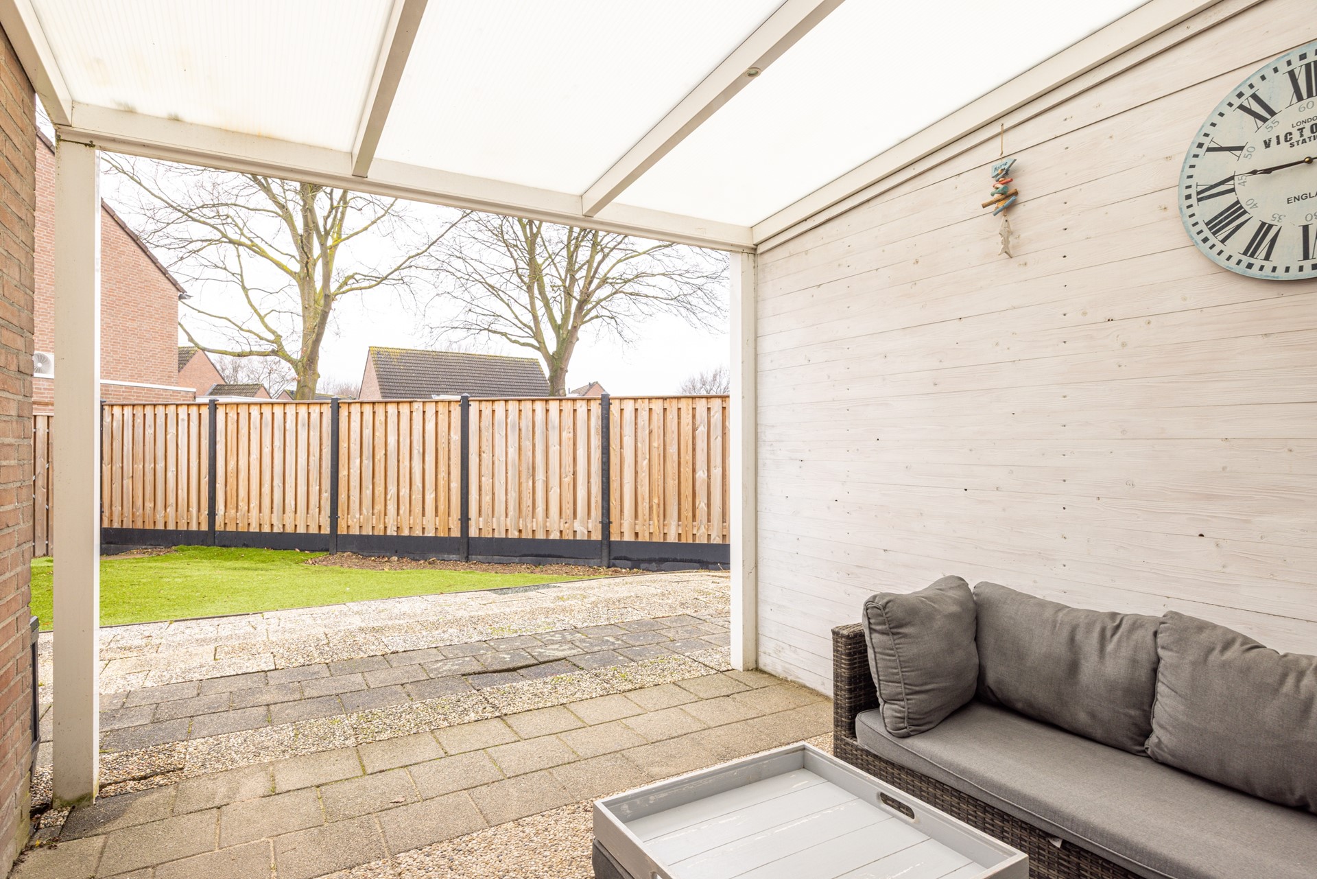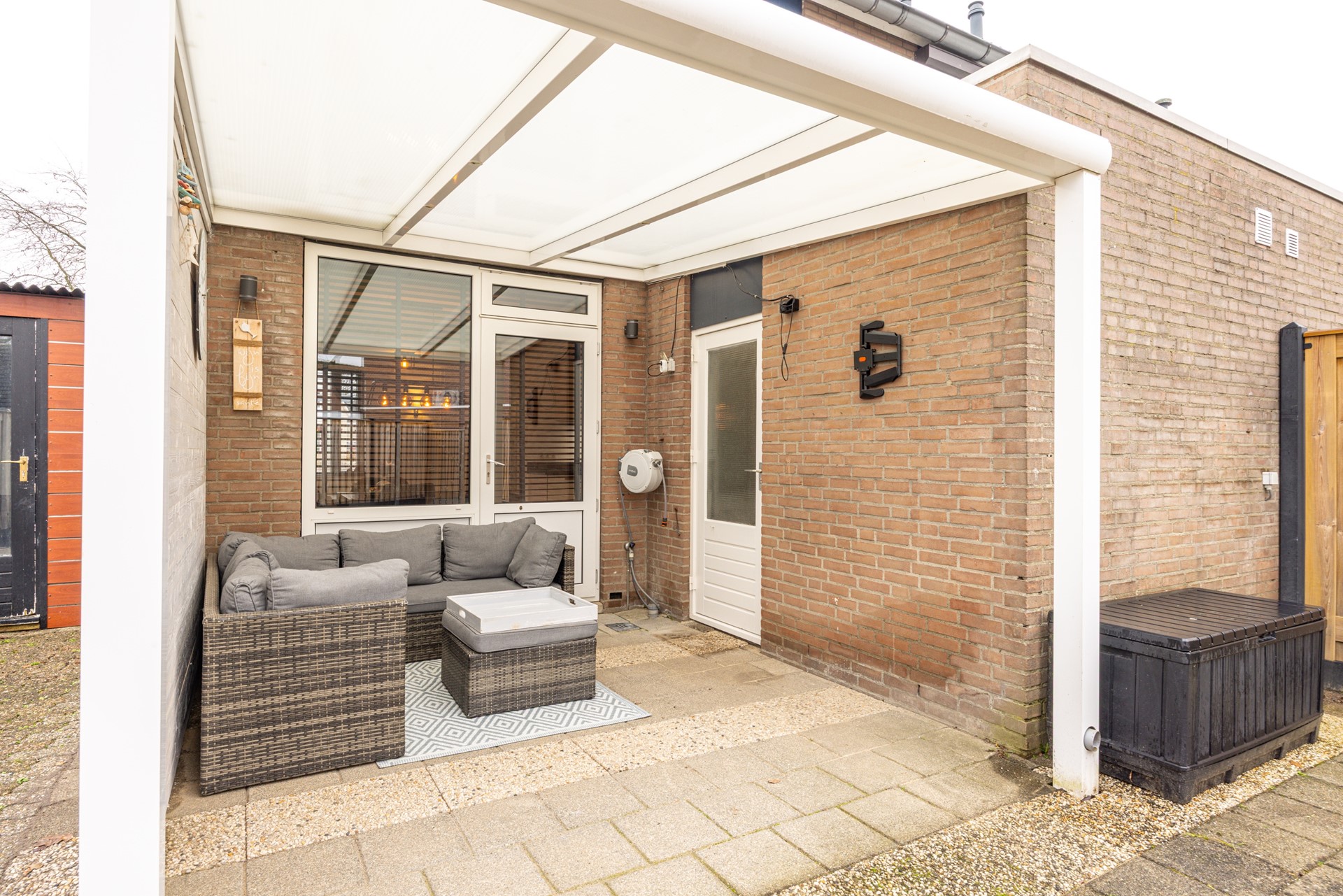 De achtertuin is voorzien van een terras met overkapping en verlichting. Hierdoor ontstaat een prettige plek om buiten te zitten, ook wanneer het weer wat minder is. De tuin is overzichtelijk ingericht en biedt voldoende ruimte voor diverse indelingsmogelijkheden. De huidige opzet vormt een goede basis en kan verder naar eigen smaak worden ingevuld of aangepast. Aan de zijkant van de woning bevindt zich de berging, geschikt voor het stallen van fietsen en het opbergen van tuinspullen. Daarnaast is er een achterom aanwezig, wat extra gemak biedt.