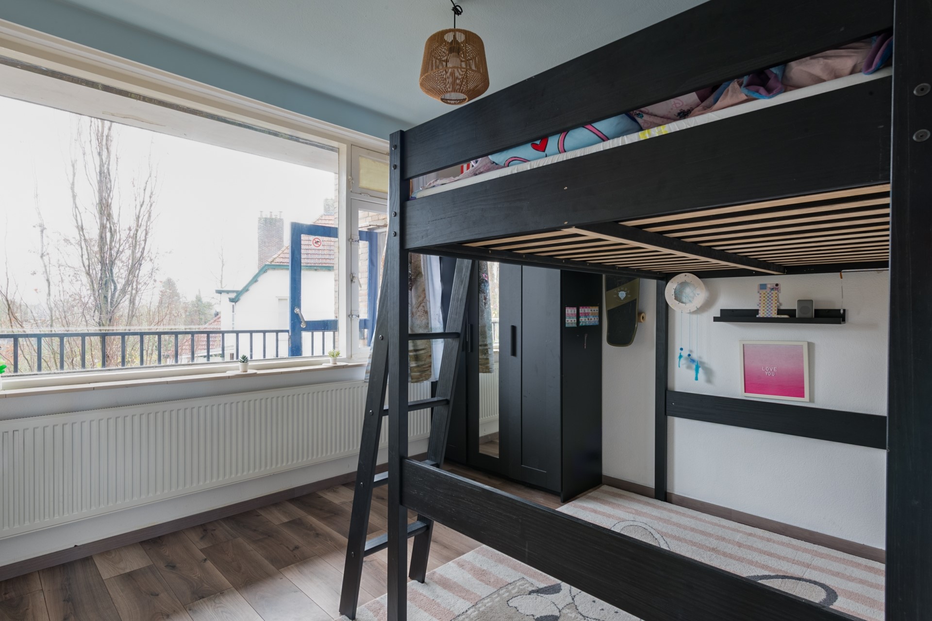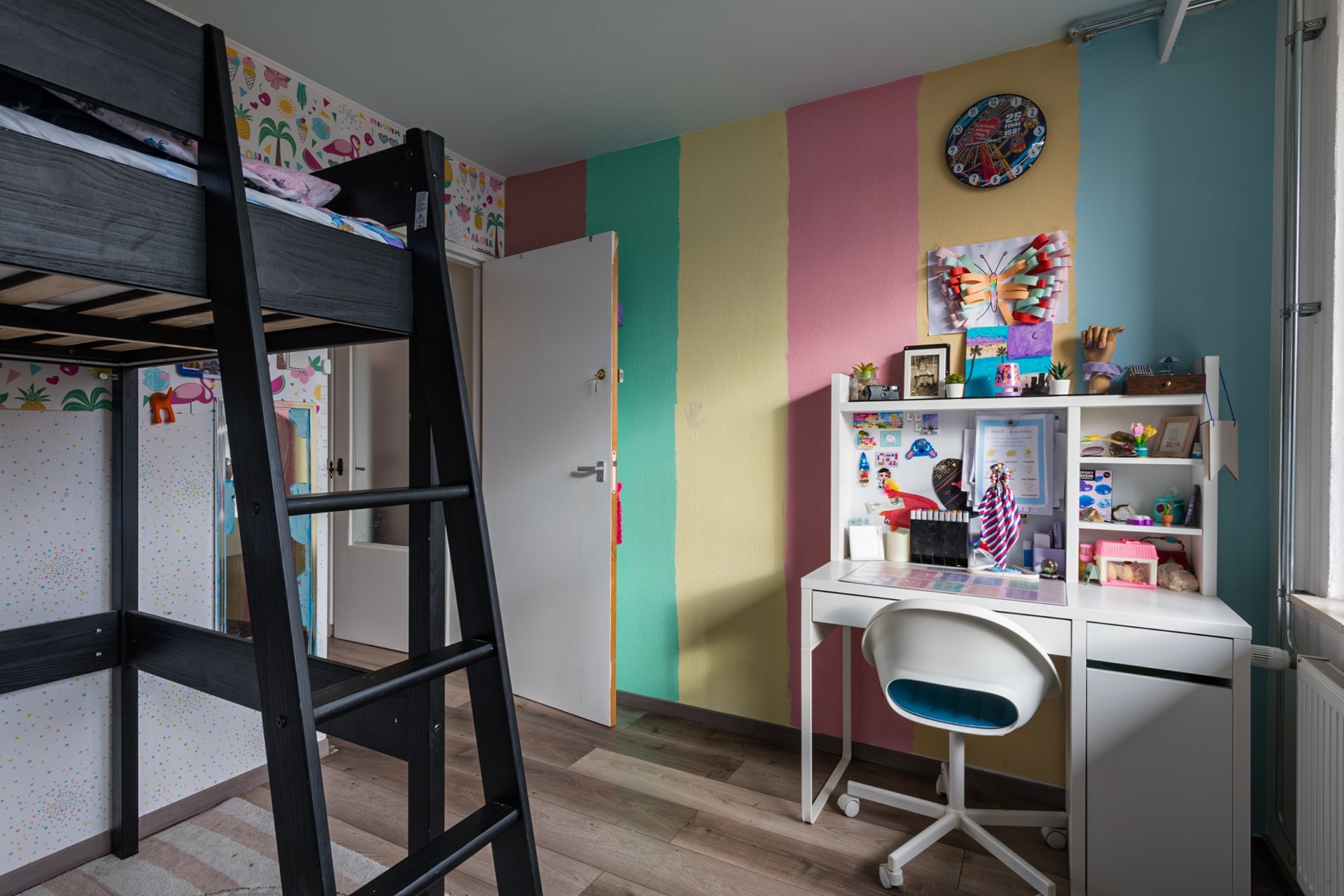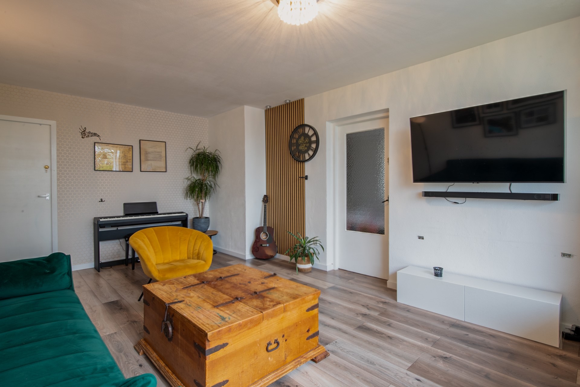 De woonkamer is licht en prettig van formaat, met grote raampartijen die zorgen voor veel daglicht. De ruimte is afgewerkt met een laminaatvloer en biedt voldoende plek voor een comfortabele zithoek én een eethoek. Vanuit de woonkamer heb je toegang tot het balkon aan de voorzijde, waar ook een kleine berging aanwezig is, handig voor extra spullen. Daarnaast biedt de woonkamer toegang tot twee van de vier slaapkamers.