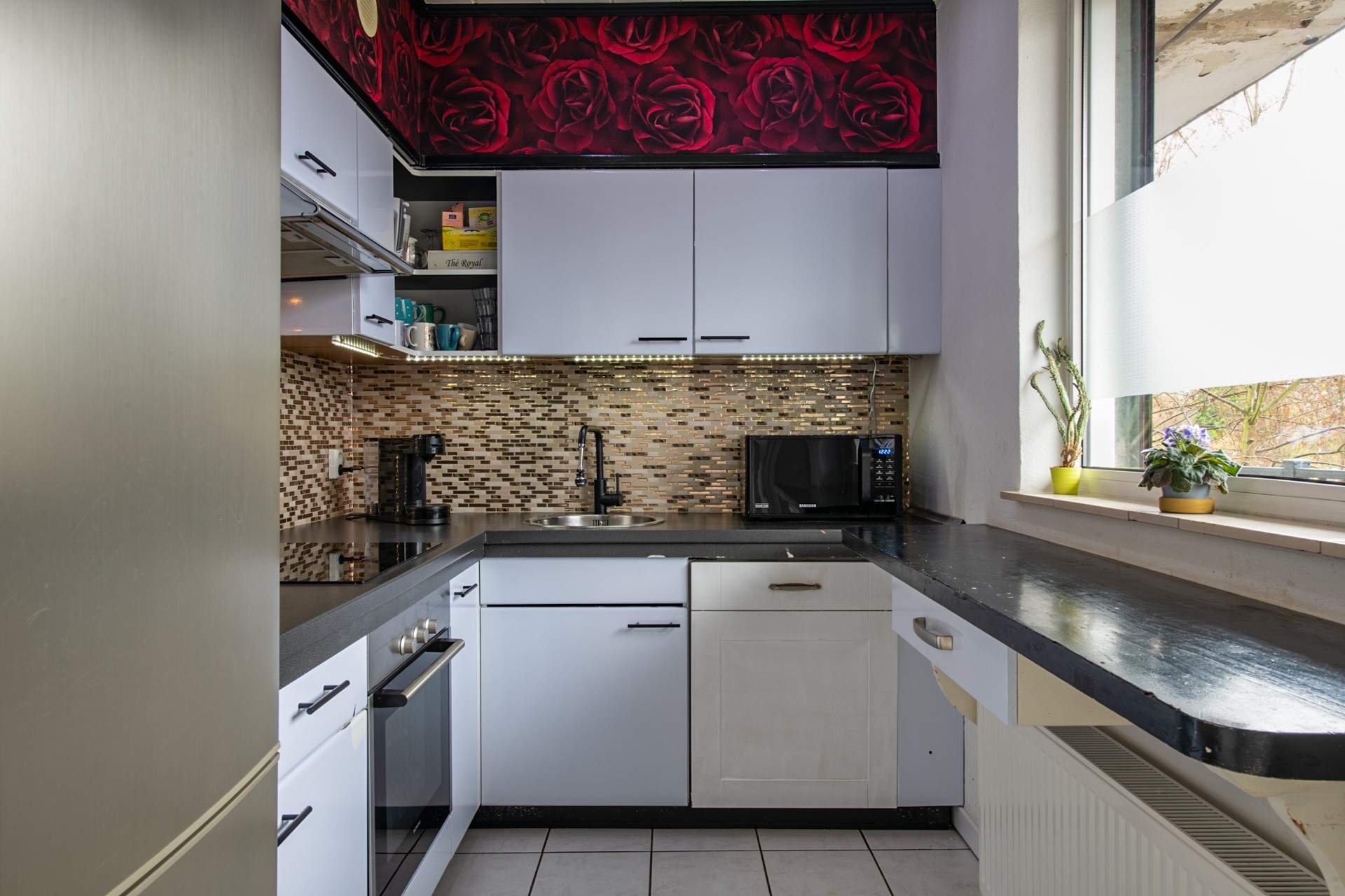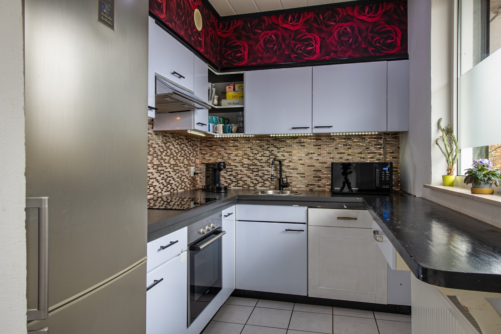 De keuken is afgesloten en voorzien van een tegelvloer en natuurlijk daglicht. Je beschikt hier over een hoekopstelling met diverse inbouwapparatuur, waaronder een inductiekookplaat, afzuigkap en vaatwasser. De keuken biedt voldoende werk- en kastruimte.