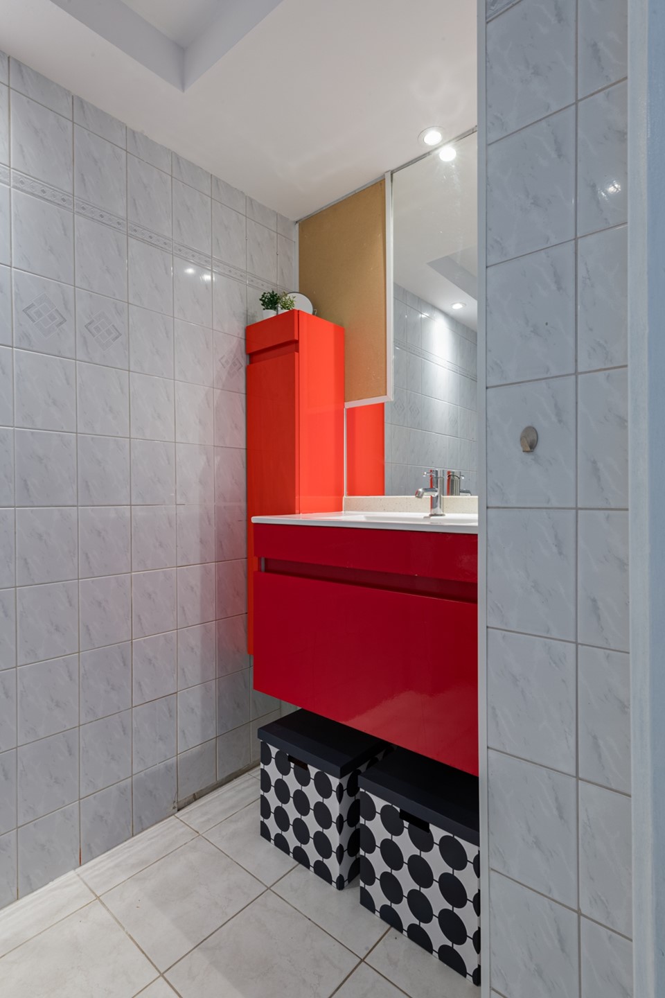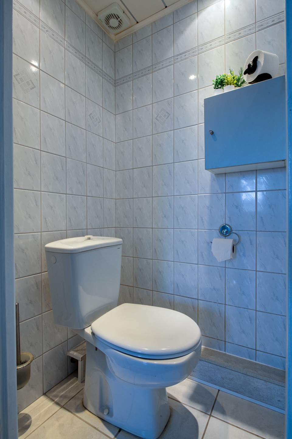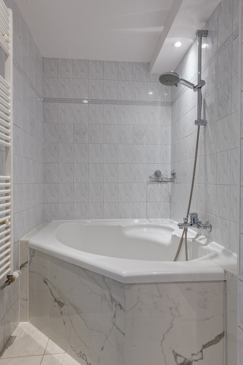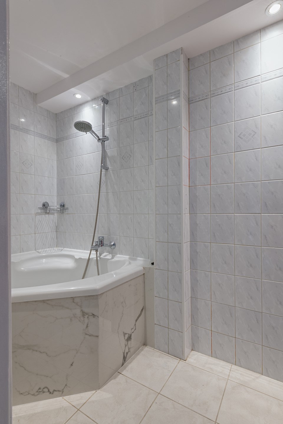 De badkamer is functioneel ingericht en voorzien van een hoekbad met douche, een badkamermeubel met wastafel en een spiegel. Het toilet is separaat, bereikbaar vanaf de hal.
