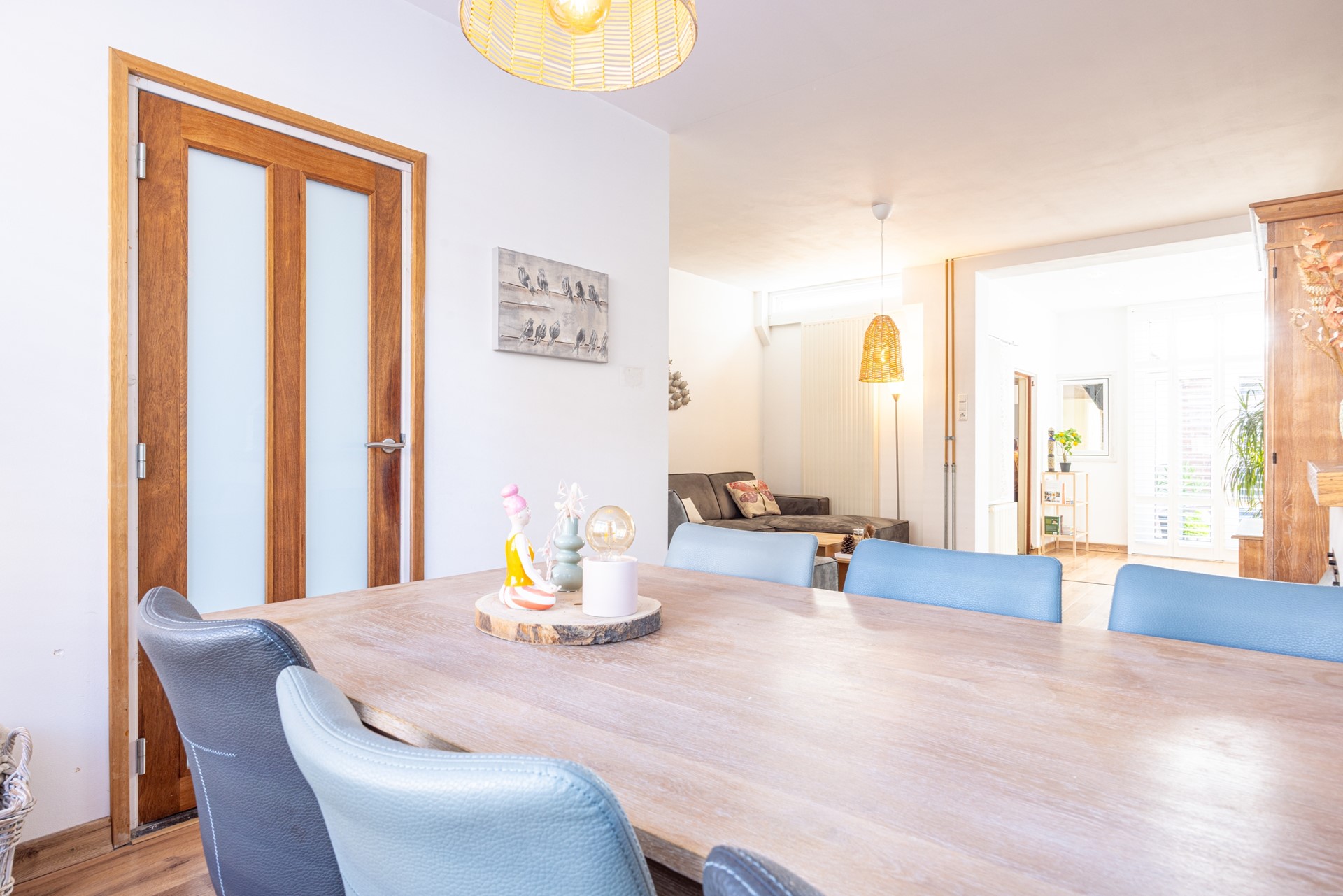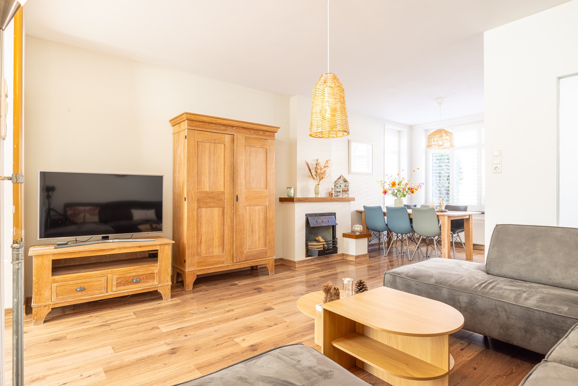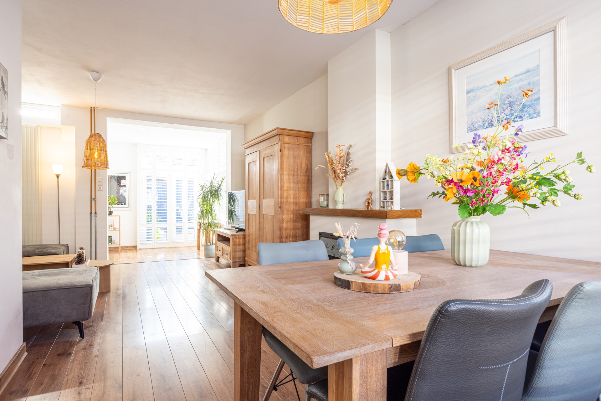 Binnen ervaar je direct een warme en lichte sfeer. De ruime woonkamer met laminaatvloer, sfeervolle shutters en openslaande deuren naar de patio vormt het hart van het huis. De woning heeft een praktische indeling met een gesloten keuken, drie slaapkamers, een ruime zolder en twee fijne buitenruimtes waar je op elk moment van de dag kunt genieten van zon of schaduw.
