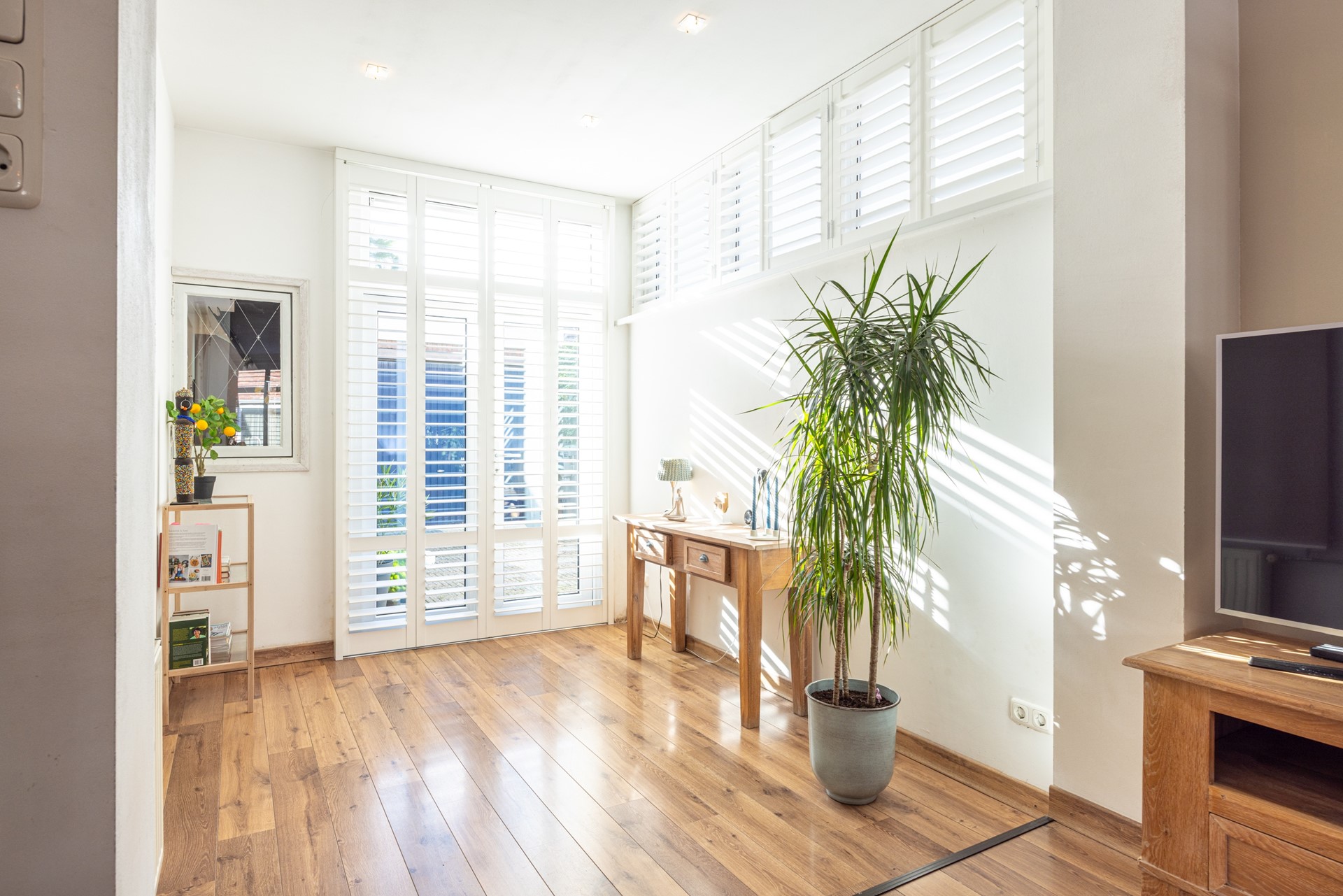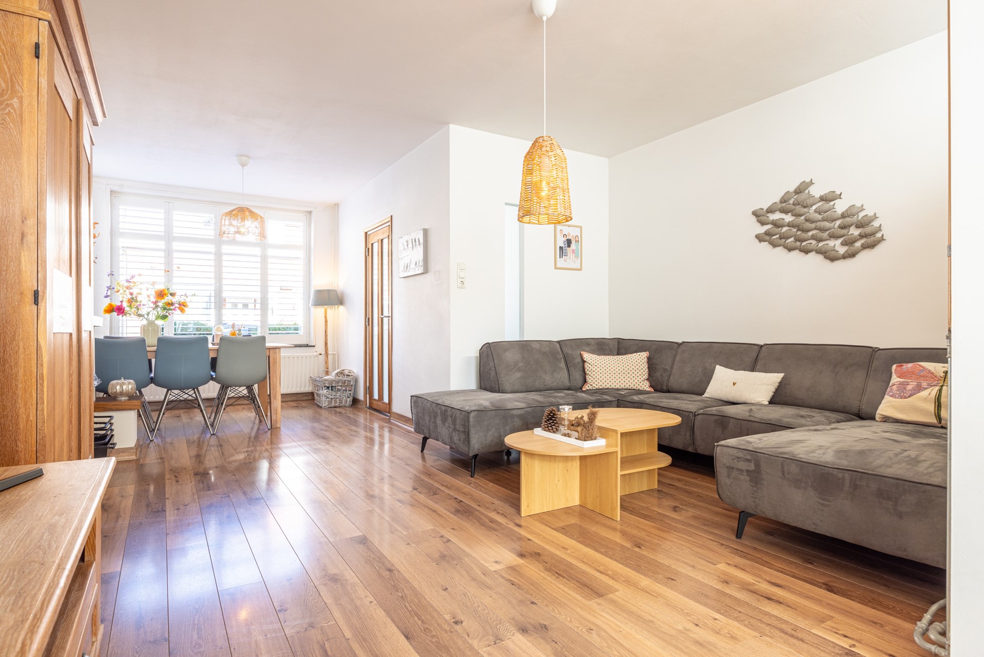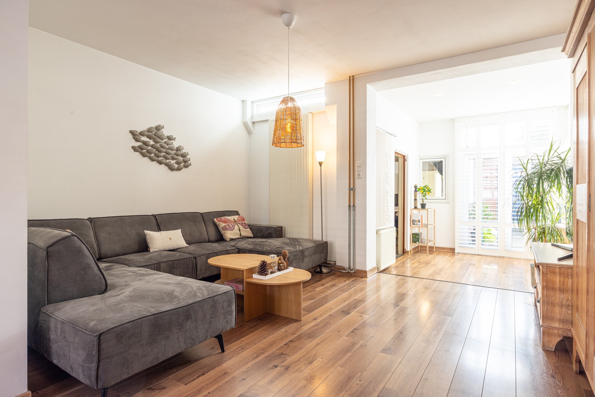 De woonkamer voelt ruim en licht aan dankzij de grote ramen met sfeervolle shutters. De warme laminaatvloer en neutrale tinten zorgen voor een prettige en huiselijke sfeer. Via de openslaande deuren stap je direct het terras op dat grenst aan de patio, waardoor binnen en buiten op een natuurlijke manier met elkaar verbonden zijn. Vanuit de woonkamer bereik je een tussenportaal met toegang tot de wasruimte met witgoed aansluitingen, het toilet en de keuken.