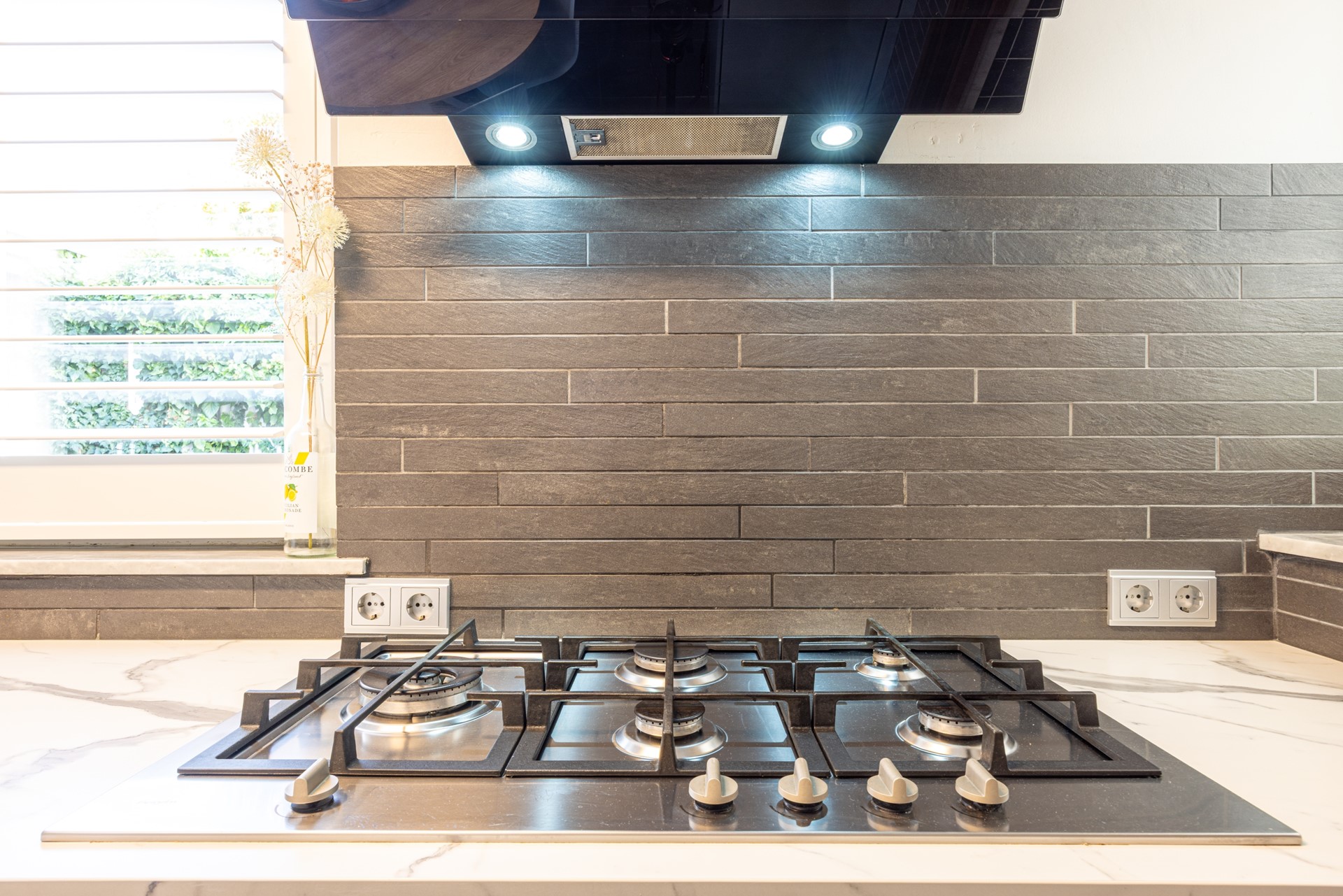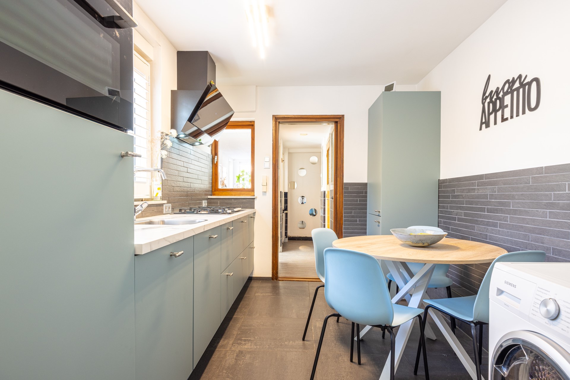 De keuken is in 2021 volledig vernieuwd en uitgevoerd in een moderne stijl met een donkergrijze tegelvloer en voldoende kastruimte. De keuken beschikt over alle gewenste inbouwapparatuur: een 5-pits gasfornuis, afzuigkap, combi-heteluchtoven, koelkast en vaatwasser. Er is genoeg ruimte voor een eettafel, perfect voor gezellige familiemomenten of een ontbijt met uitzicht op de patio. Via een tweede tussenportaal, waar zich ook de cv-installatiekast bevindt, kom je in de badkamer en heb je eveneens toegang tot de patio.