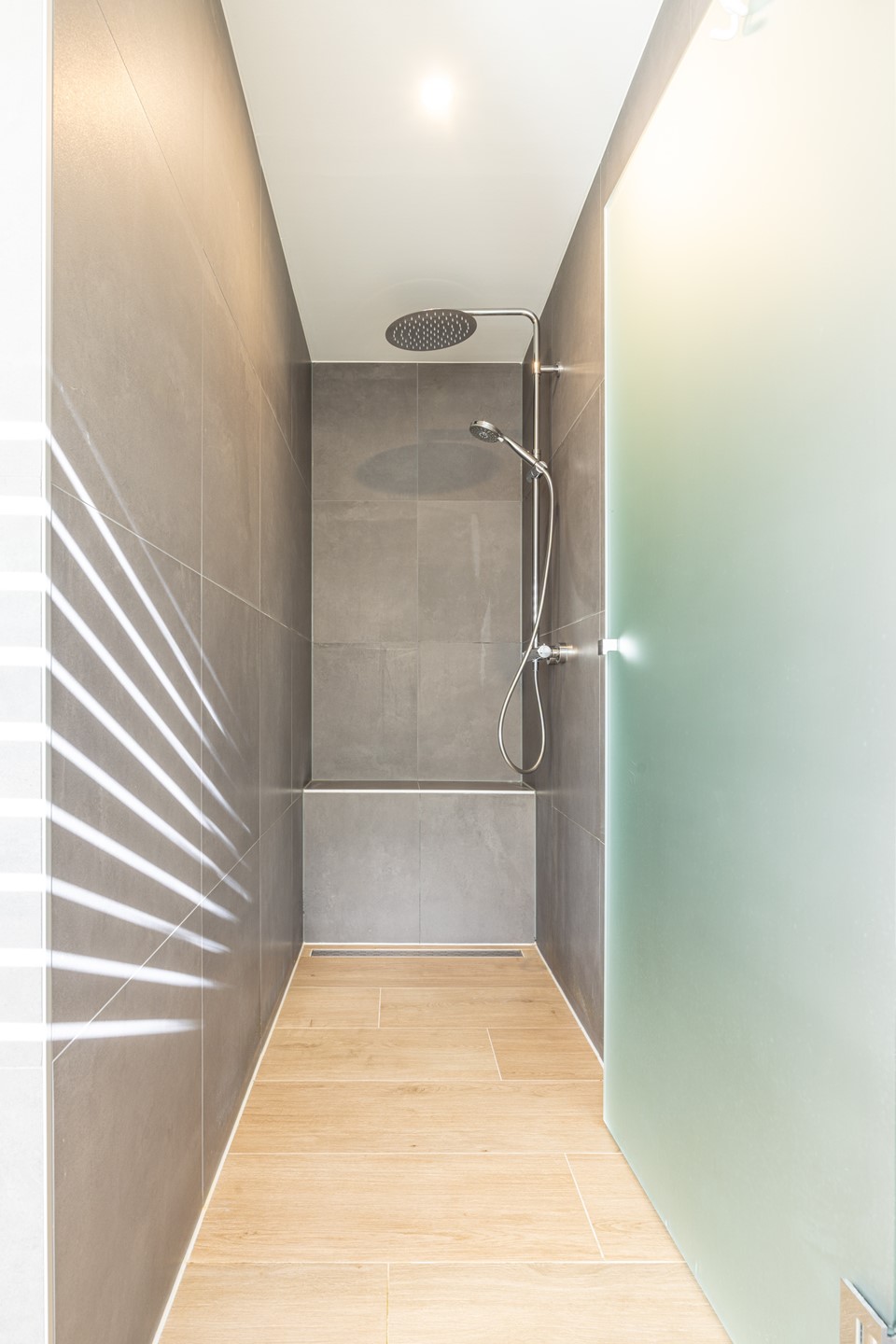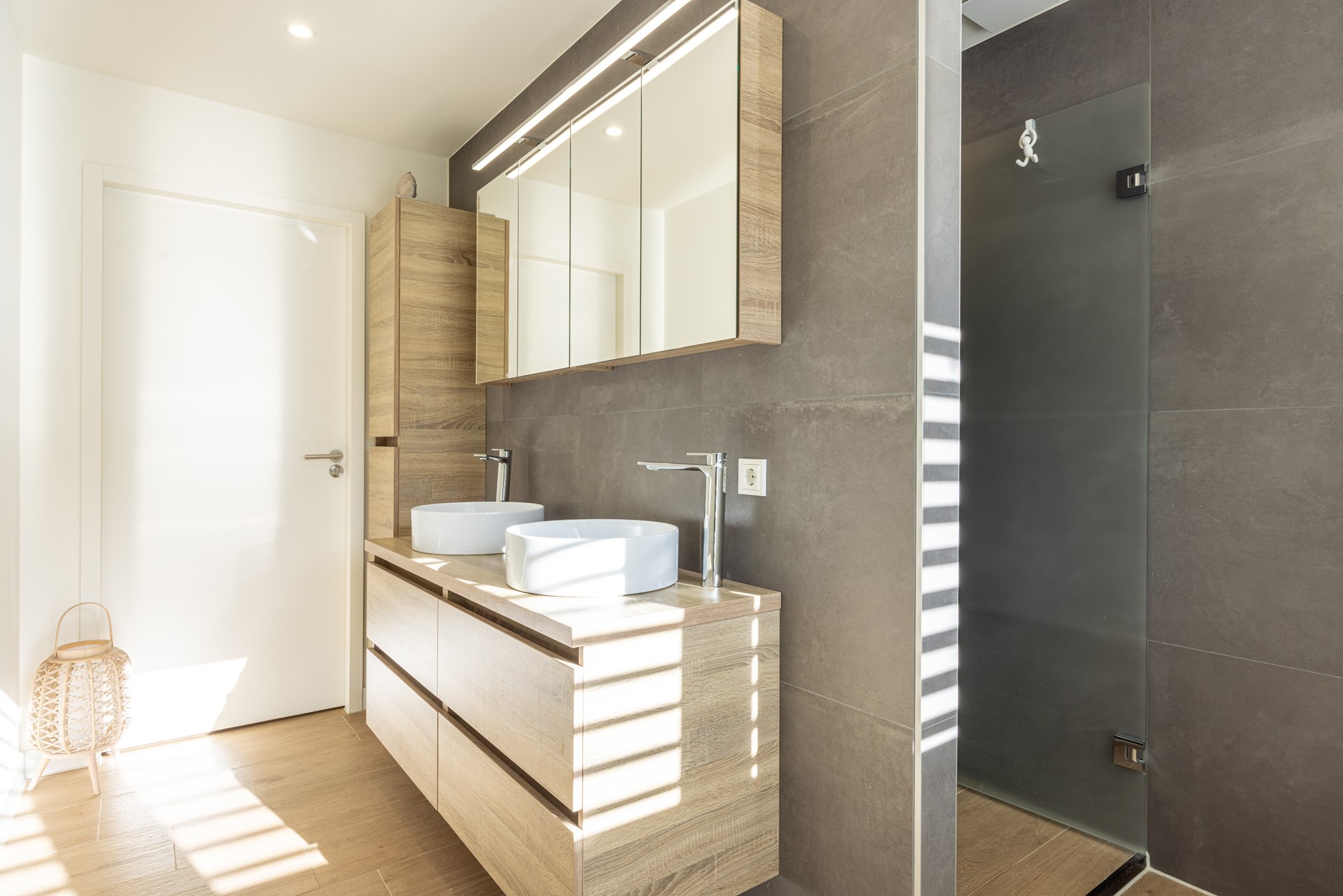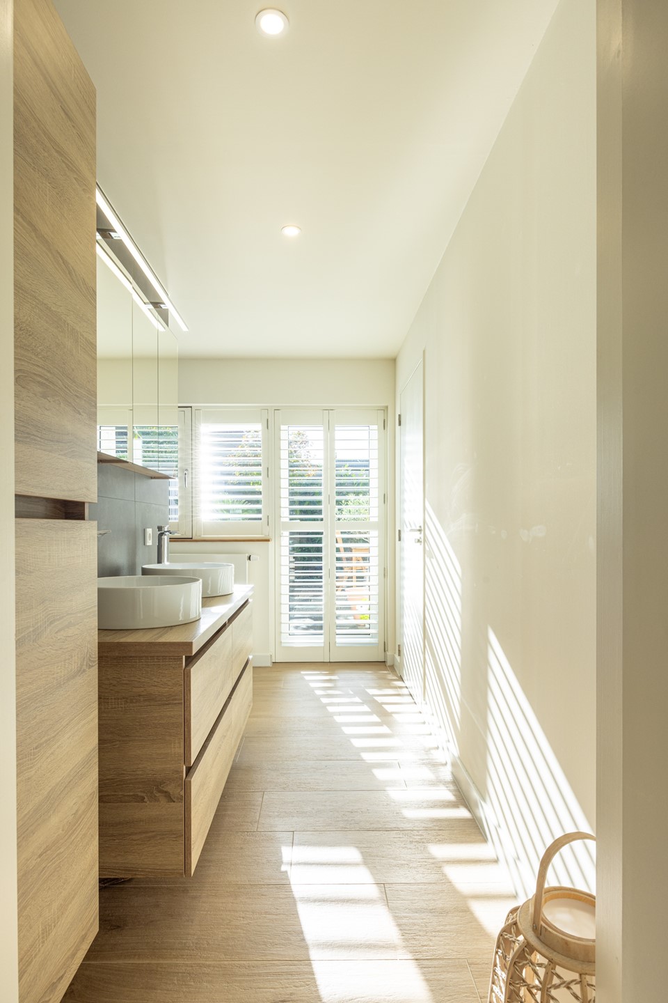 De badkamer is in 2022 volledig vernieuwd en straalt moderne luxe uit. De ruimte is voorzien van een badkamermeubel met dubbele waskom, ruime bergkasten en een inloopdouche met regendouche. Vanuit de badkamer heb je bovendien toegang tot de achtertuin en tot de inpandige garage, deze is niet geschikt voor het parkeren van een auto, maar ideaal als berging, werkplaats of hobbyruimte.