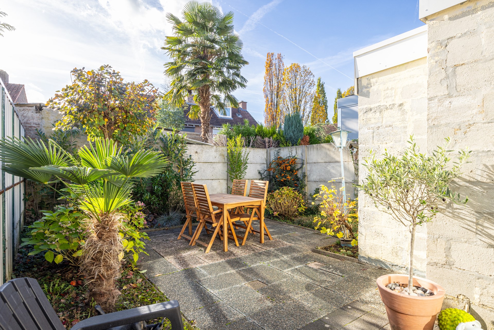 De patio is bereikbaar vanuit zowel de woonkamer als het tussenportaal achter de keuken. De ruimte is volledig betegeld en beschikt over een zij-ingang. Een heerlijke plek om beschut buiten te zitten — perfect voor een kop koffie in de ochtendzon of een gezellig zitje met vrienden. Door de ligging voelt de patio als een knusse verlenging van de woonkamer: onderhoudsvriendelijk, sfeervol en privé.