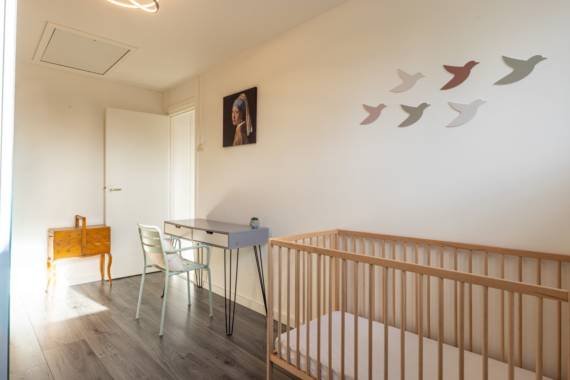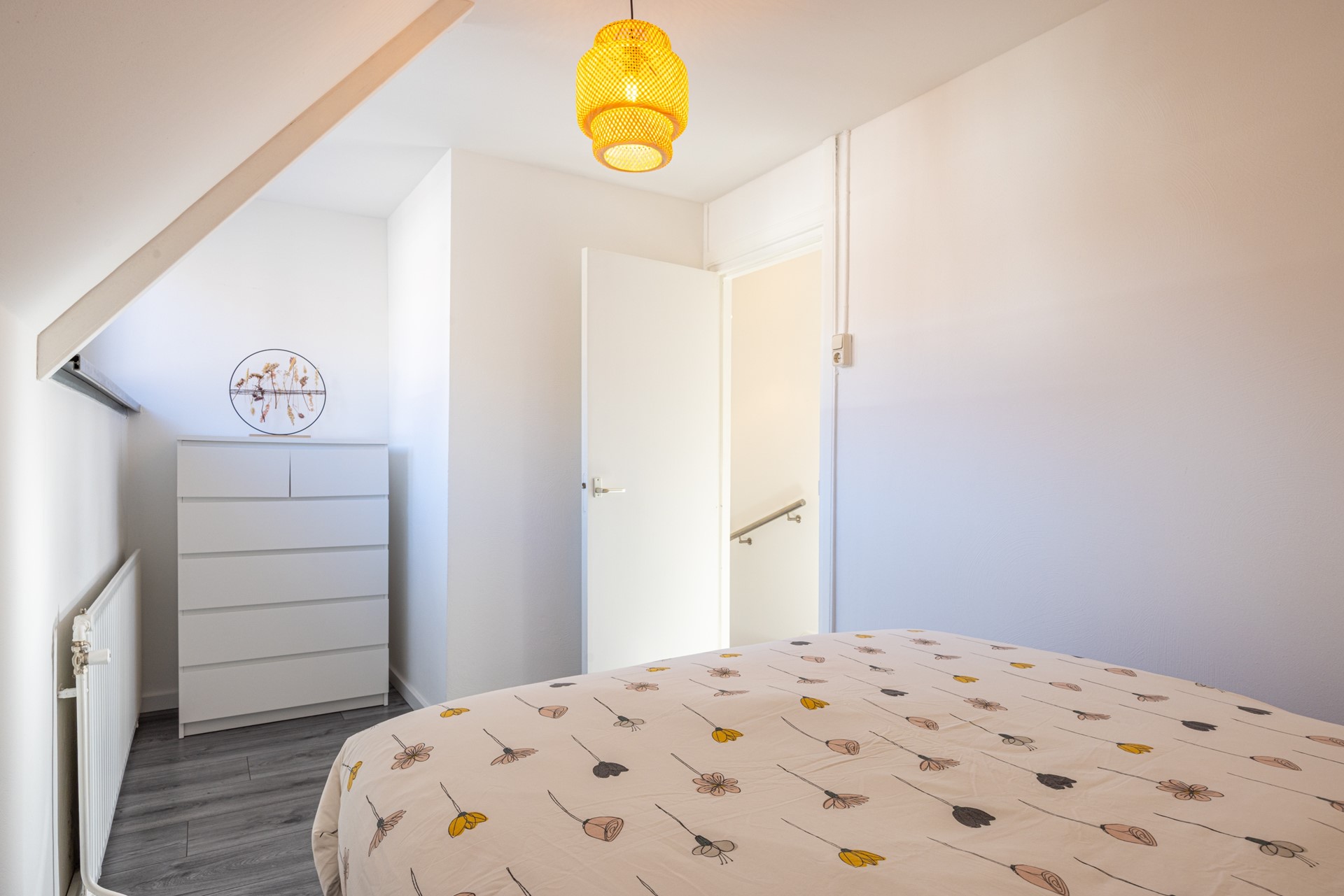 Op de eerste verdieping bevindt zich een overloop en drie keurige slaapkamers. Alle kamers zijn voorzien van een laminaatvloer, veel daglicht en rolluiken. De ruimtes voelen licht en verzorgd aan en bieden voldoende flexibiliteit, ideaal als slaapkamers, thuiswerkplek of logeerkamer. Via één van de slaapkamers bereik je met een vlizotrap de ruime zolder, die veel praktische bergruimte biedt.
