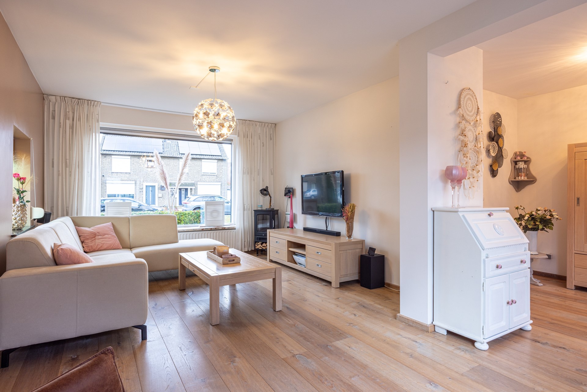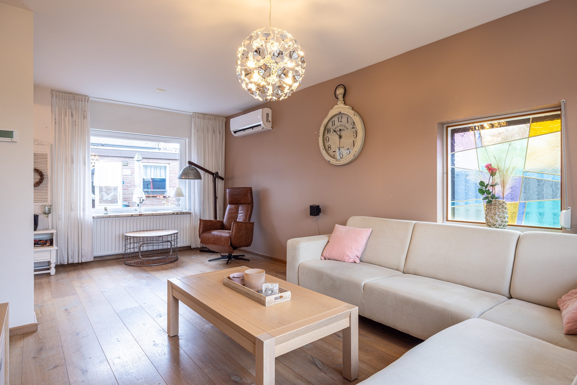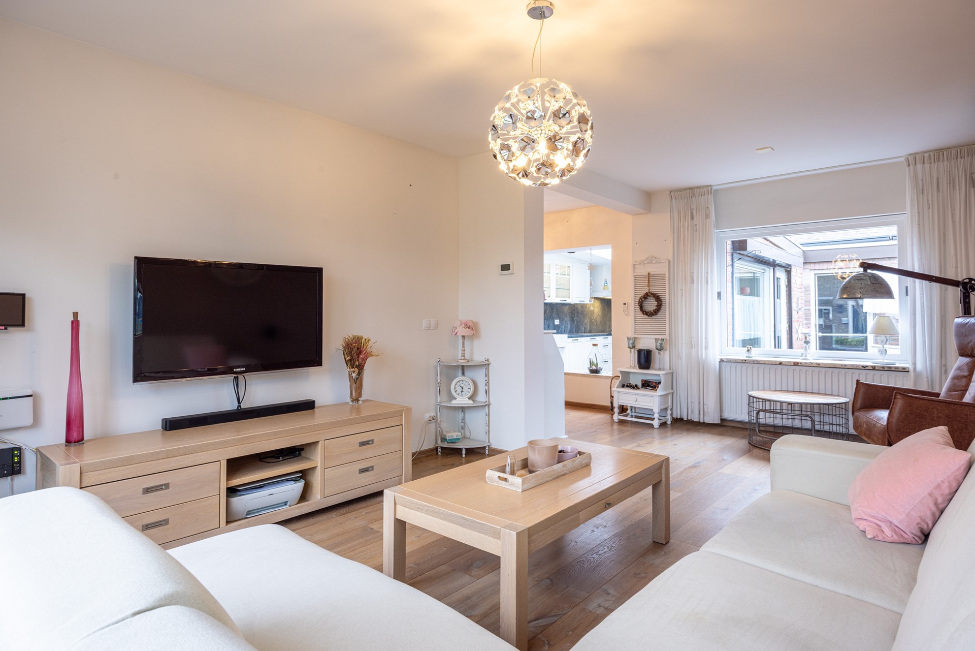 De woonkamer voelt direct prettig aan door de eikenhouten parketvloer en de hoeveelheid daglicht. Dankzij de rolluiken en de airco-unit, die zowel kan koelen als verwarmen, is het hier in elk seizoen comfortabel. De ruimte sluit mooi aan op de leefkeuken aan de achterzijde van de woning.