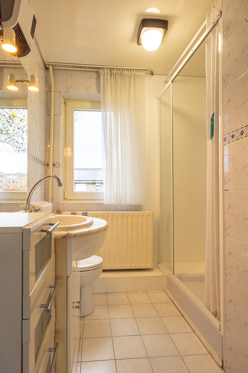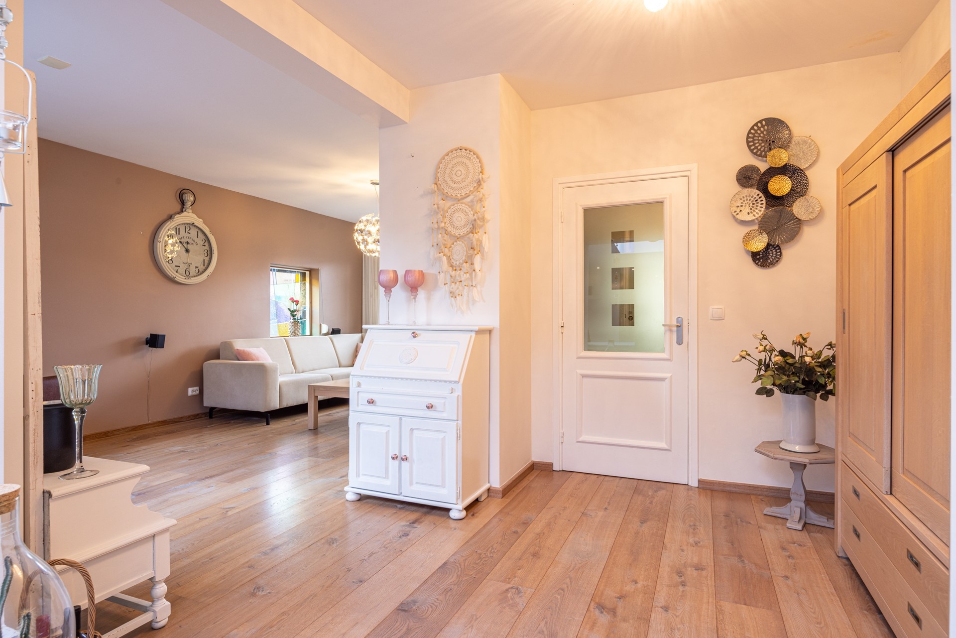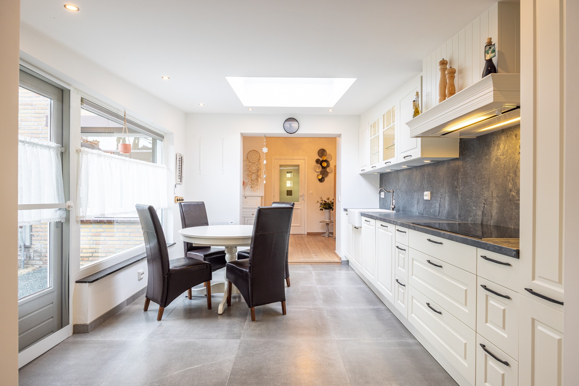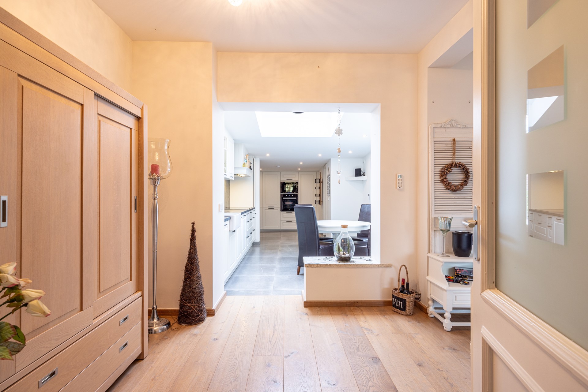 De woonkamer voelt direct prettig aan door de eikenhouten parketvloer en de hoeveelheid daglicht. Dankzij de rolluiken en de airco-unit, die zowel kan koelen als verwarmen, is het hier in elk seizoen comfortabel. De ruimte sluit mooi aan op de leefkeuken aan de achterzijde van de woning.