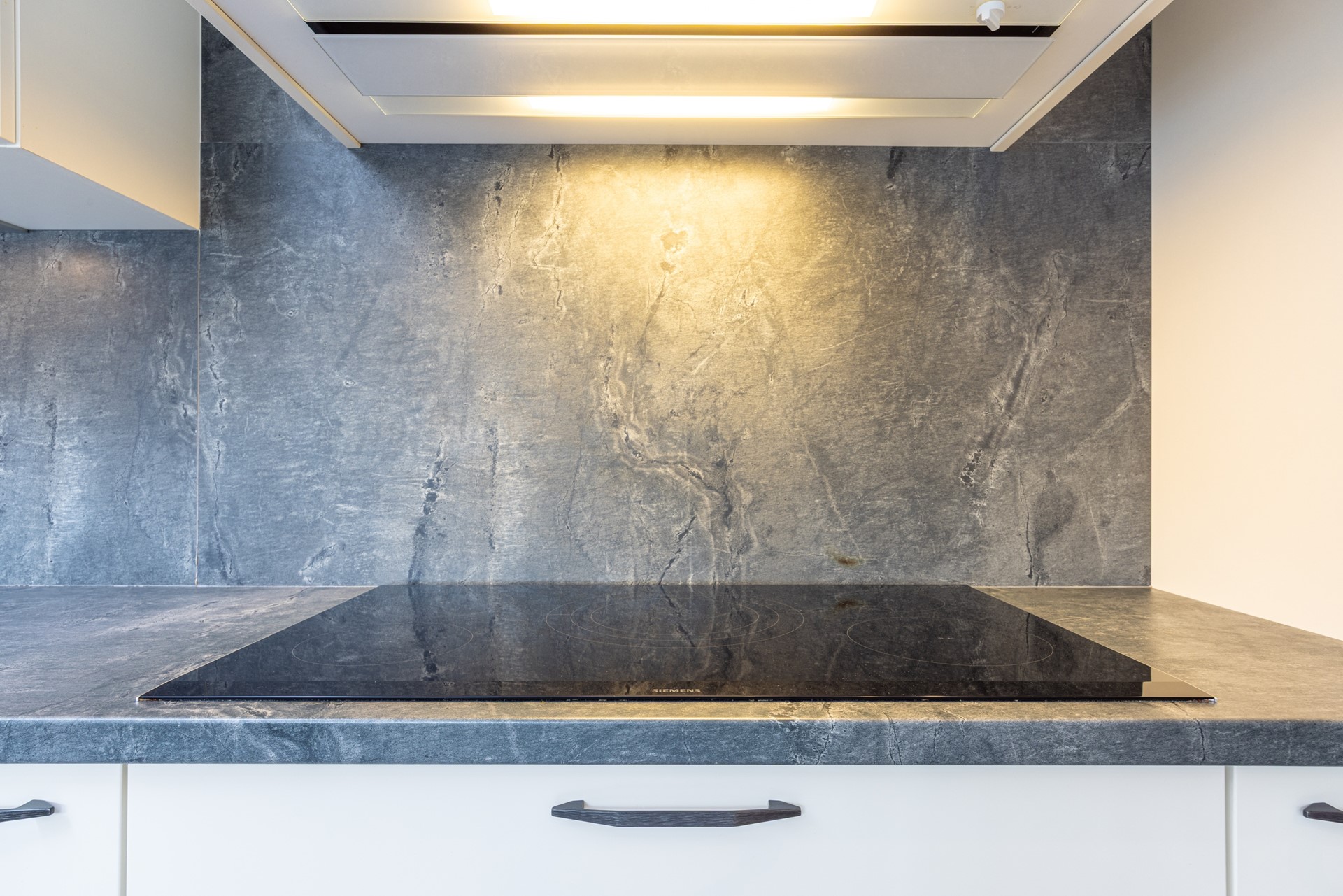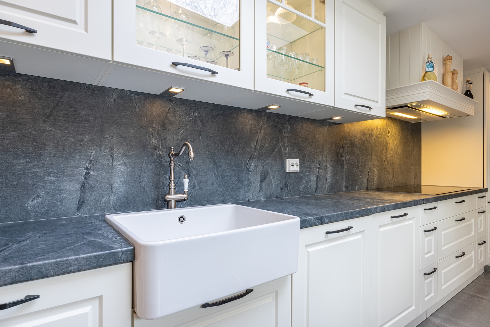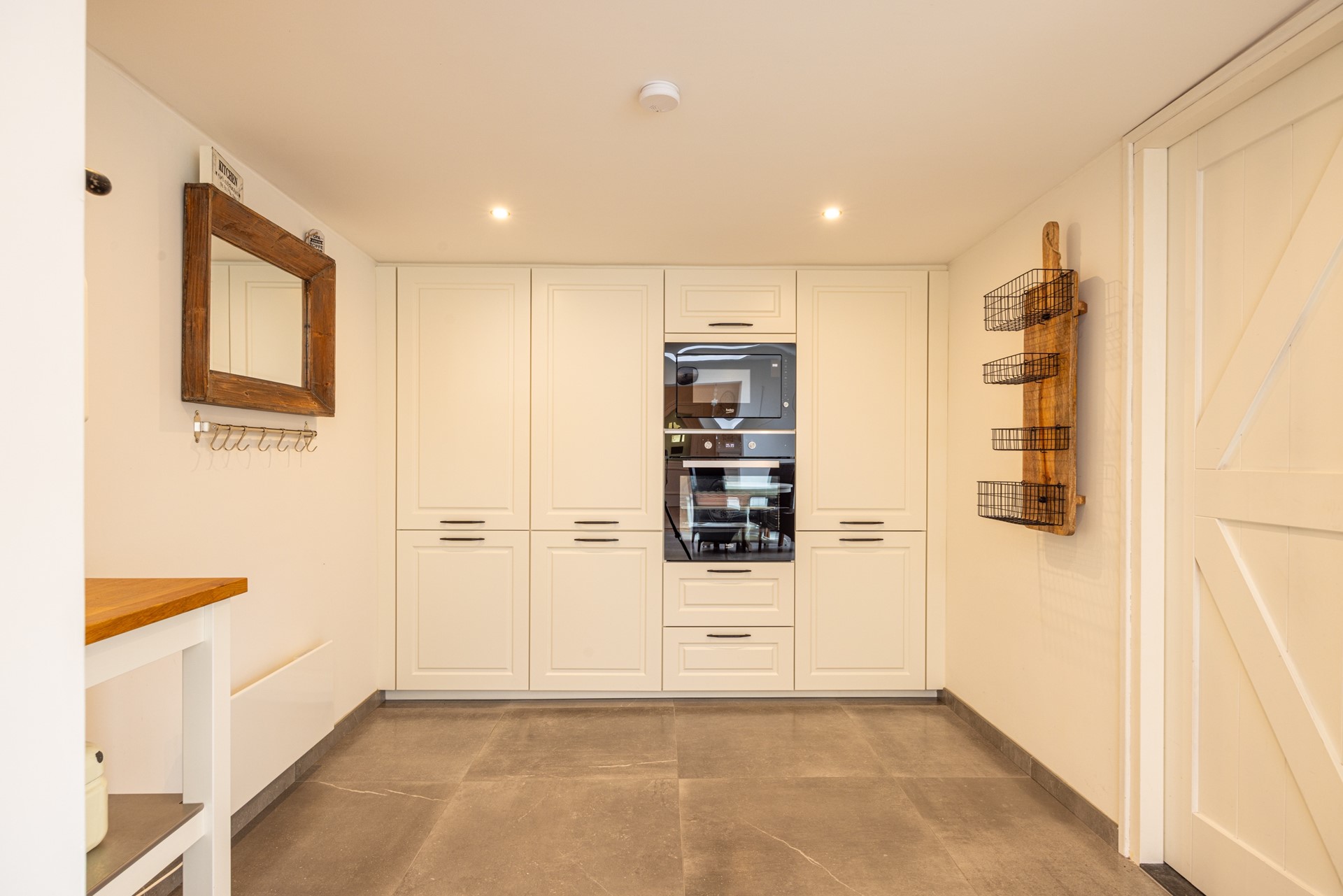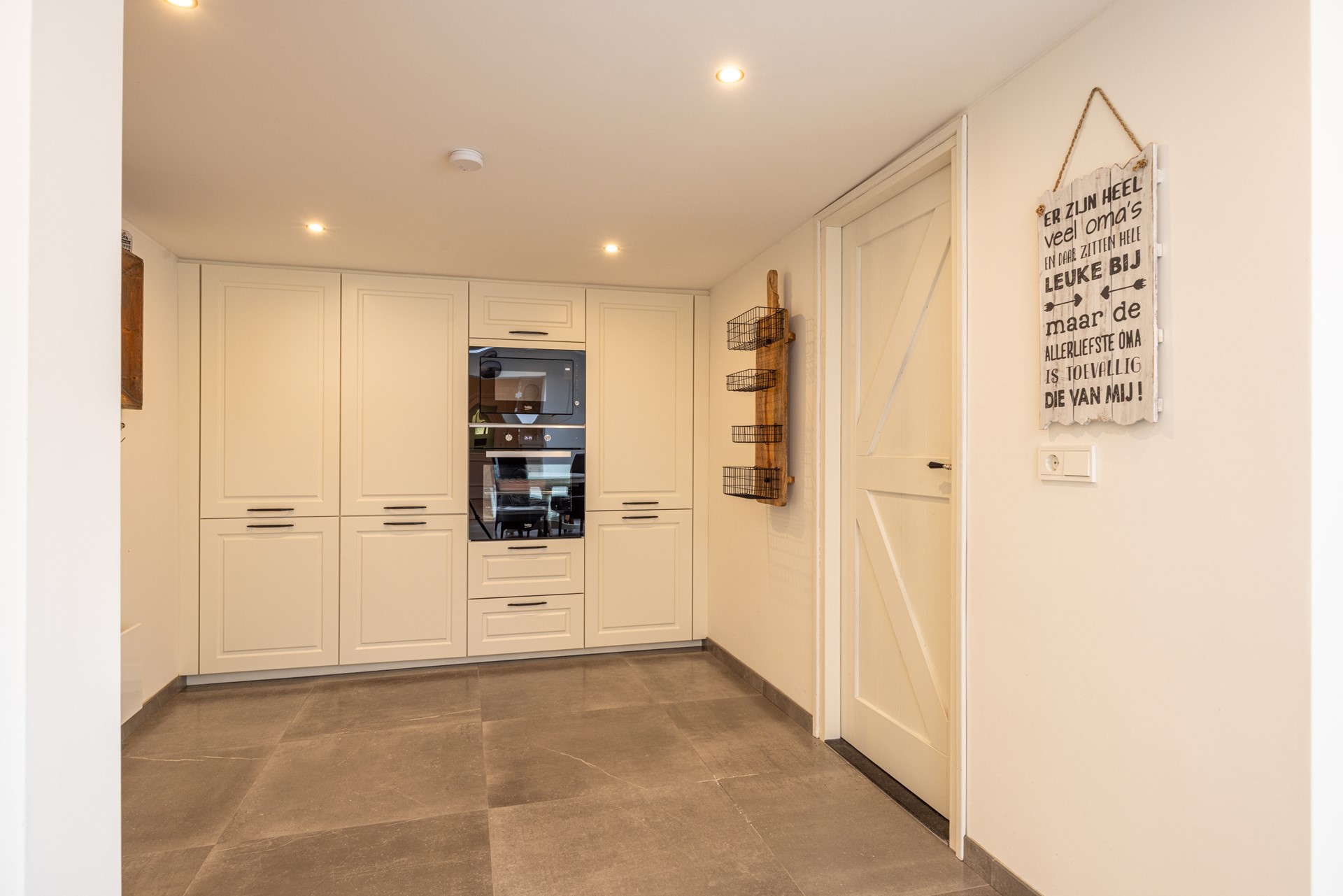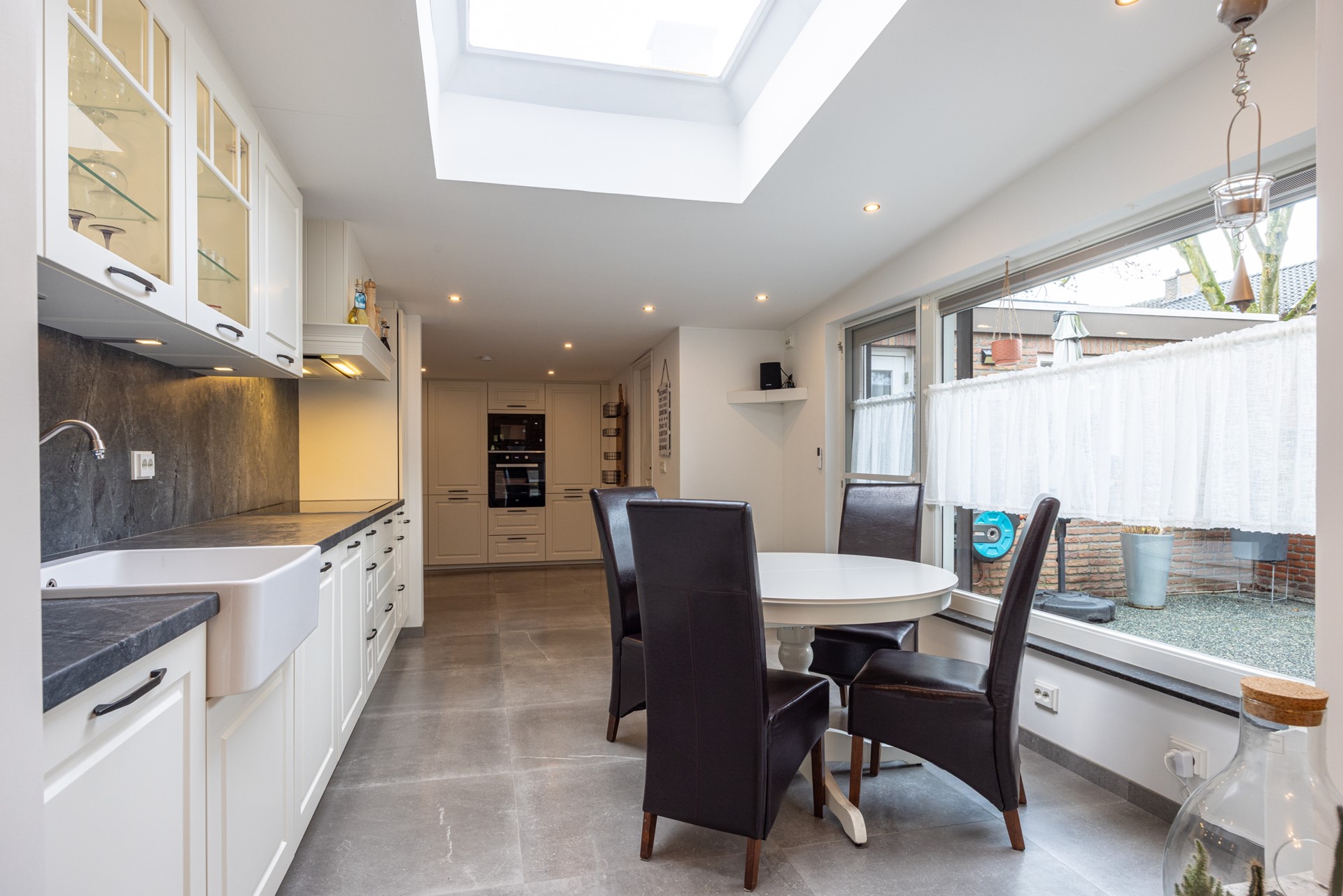 De keuken is groot en licht, mede door de brede raampartijen en de grote lichtkoepel. De keuken is ingericht met veel kastruimte, een royaal werkblad en moderne inbouwapparatuur zoals een inductiekookplaat, afzuiging, combi-heteluchtoven, magnetron, koelvriescombinatie en vaatwasser. Een elektrische boiler van tien liter zorgt voor snel warm water. In deze ruimte liggen tegels en zijn inbouwspots aanwezig. Vanuit de keuken loop je rechtstreeks de tuin in en heb je toegang tot de inpandige garage.