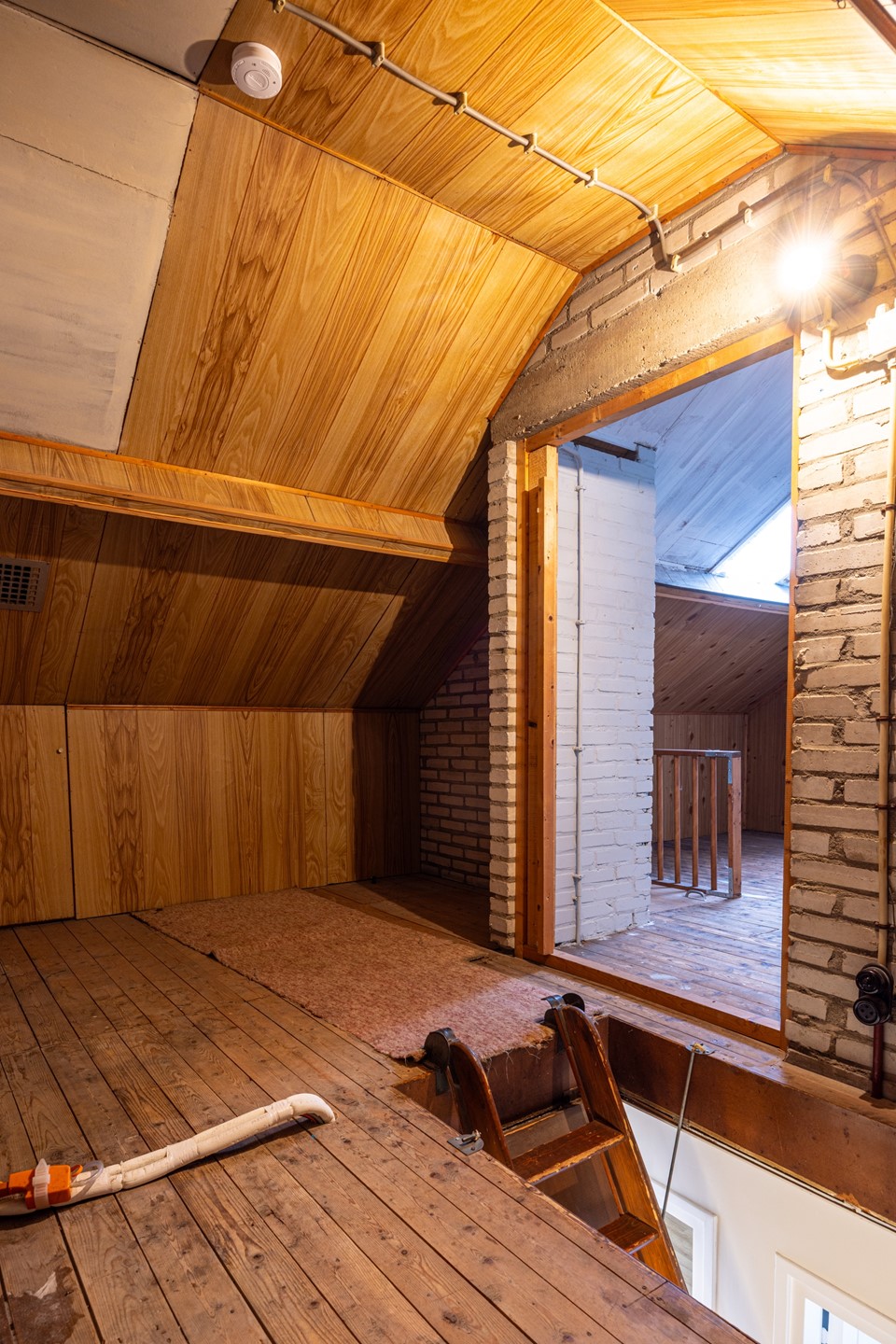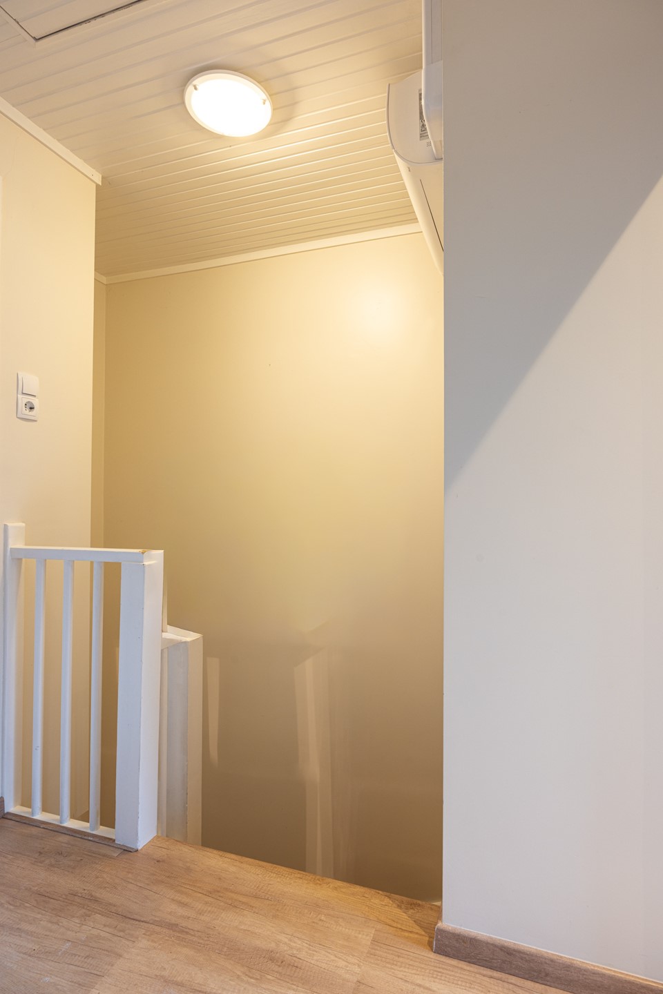 Via de trap, afgewerkt met laminaat, bereik je de eerste verdieping. Op de overloop ligt dezelfde laminaatvloer en een airco-unit zorgt hier voor verwarming en koeling van de hele verdieping. De woning heeft drie slaapkamers op deze etage. Alle kamers hebben een laminaatvloer, voldoende daglicht en rolluiken. De slaapkamer aan de achterzijde beschikt daarnaast over inbouwspots en een muurkast. De ruimtes zijn goed bruikbaar als slaapkamer, werkplek of hobbykamer. De badkamer is praktisch ingedeeld met een douchecabine, badkamermeubel met wastafel en spiegel en een toilet. Ook hier is een raam aanwezig, voorzien van een rolluik. Via de vlizotrap bereik je de ruime tweede verdieping. Hier staat de elektrische boiler van honderd liter. Deze verdieping kan, na aanpassingen, worden ingericht als extra slaapkamer of werkruimte.