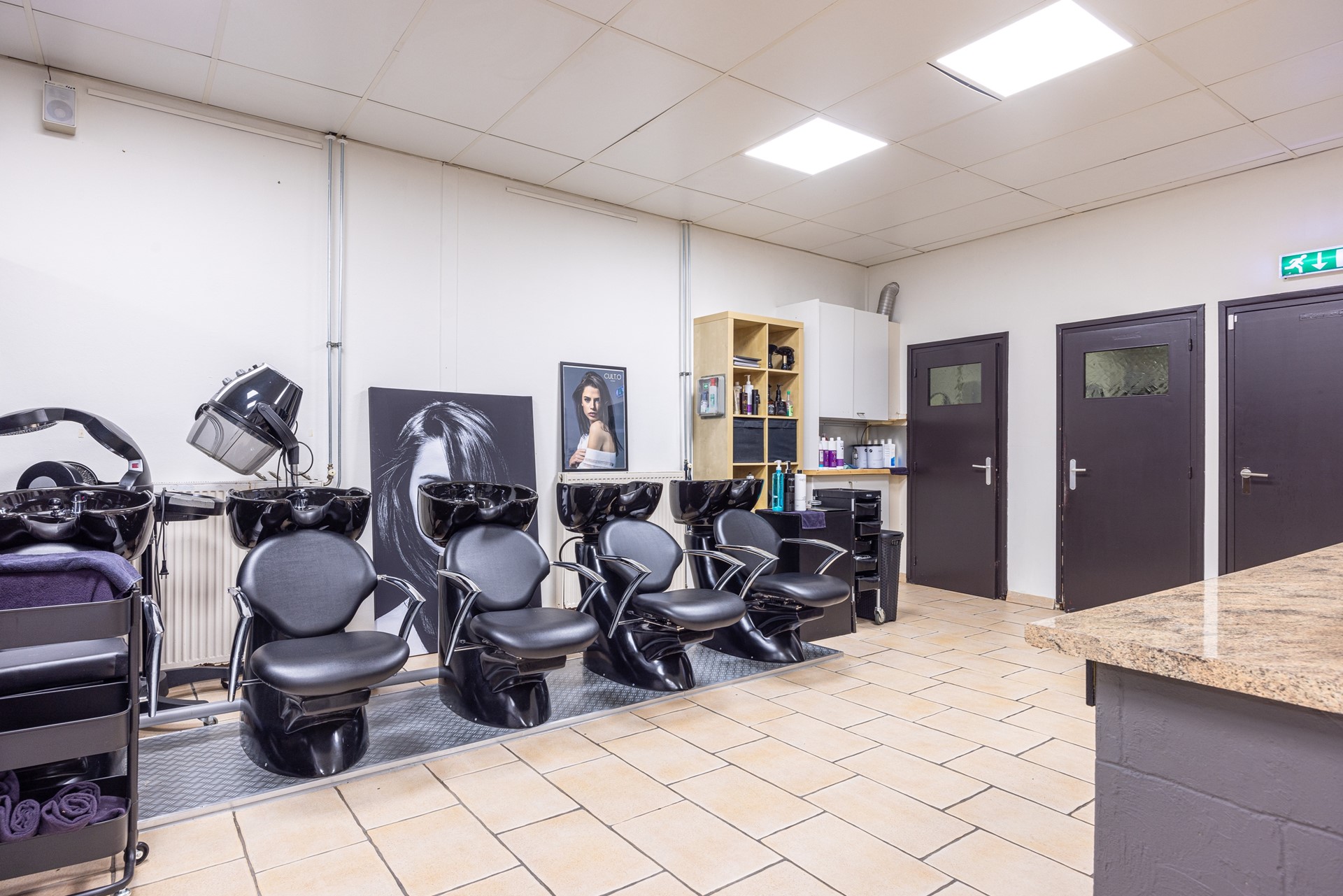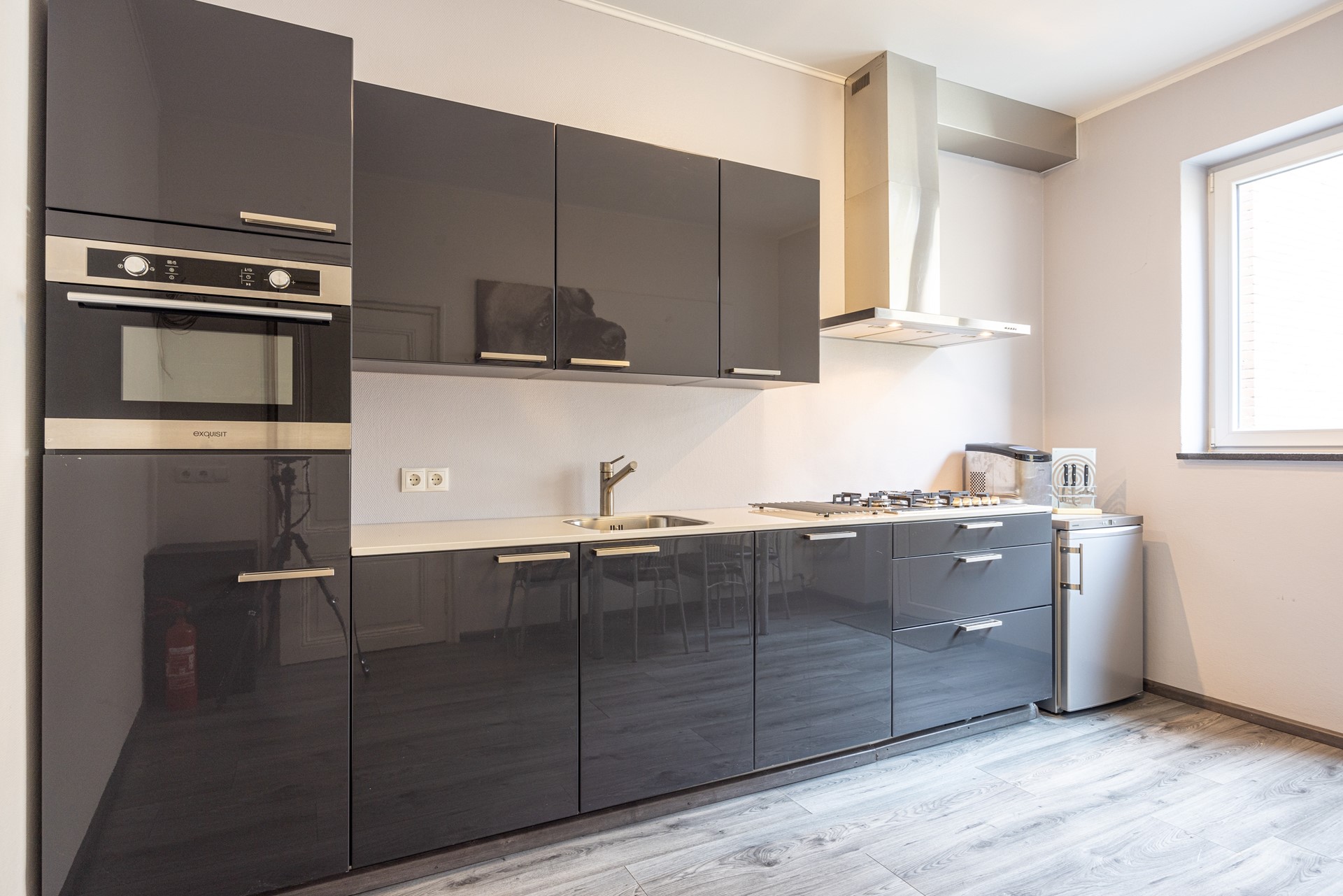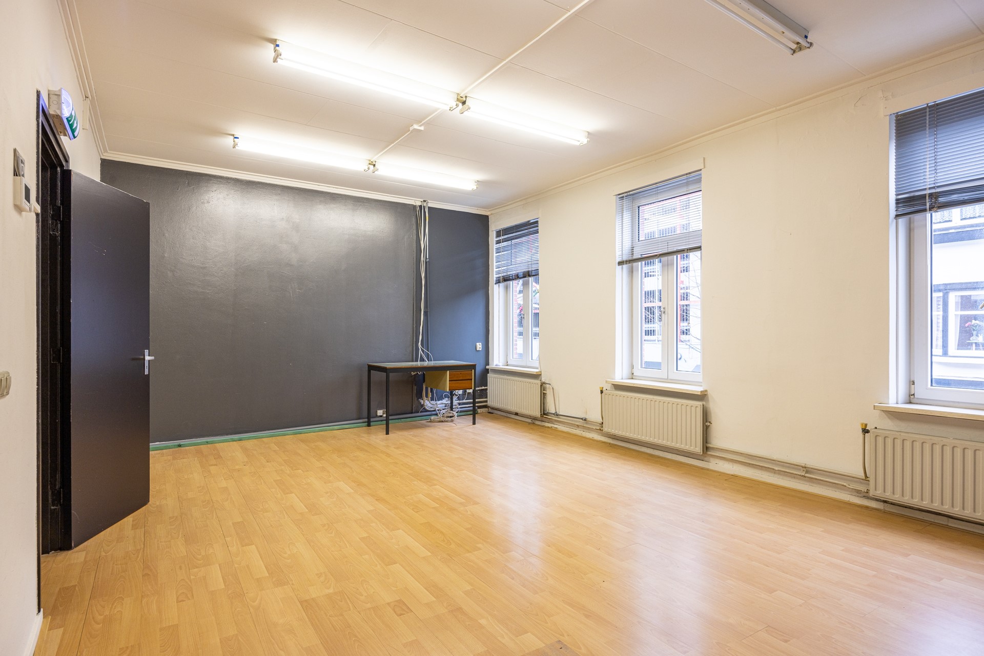 Het appartement is bereikbaar via een eigen ingang, wat zorgt voor privacy en een duidelijke scheiding tussen wonen en werken. Op de eerste verdieping kom je uit op de overloop, waar zich een toiletruimte bevindt. Vanuit hier is er toegang tot een veelzijdige ruimte die momenteel in gebruik is als klaslokaal met aangrenzende kantoorruimte. Deze ruimte leent zich uitstekend voor herinrichting en kan met beperkte aanpassingen eenvoudig worden omgevormd tot een comfortabele woonkamer of slaapkamer. Via een tussenportaal met trappenhal is de gesloten keuken bereikbaar. De keuken is praktisch ingericht en beschikt over veel kastruimte en diverse inbouwapparatuur, waaronder een halogeen kookplaat (op de foto hieronder zie je een gaskookplaat, deze is vernieuwd), afzuigkap, combi heteluchtoven, koelkast en vaatwasser.