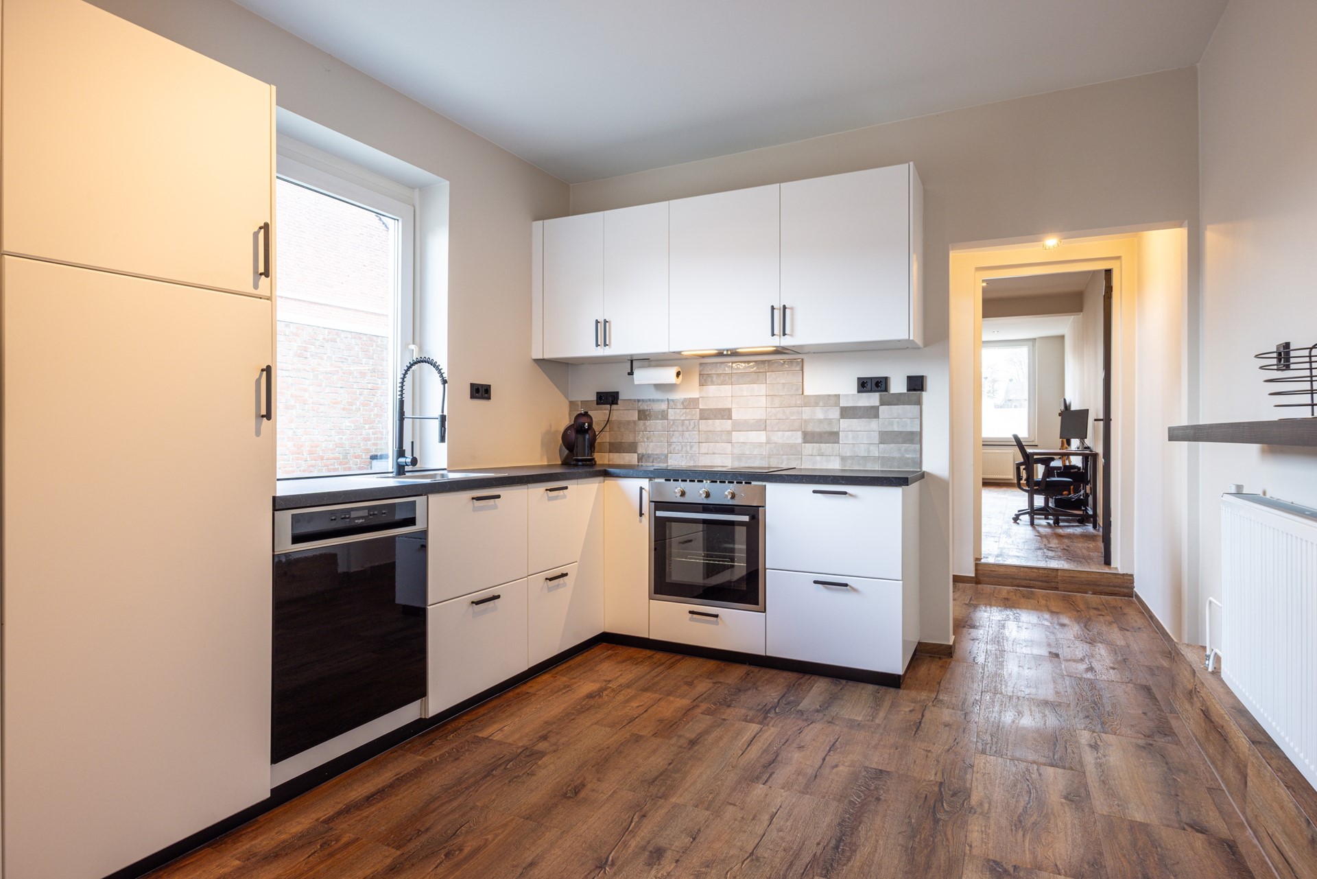 De gesloten keuken is praktisch ingericht en beschikt eveneens over een pvc vloer. De keuken is voorzien van inbouwapparatuur, waaronder een 4-pits inductiekookplaat, een onderbouw afzuigkap, een koelkast en een vaatwasser. Een functionele keuken met voldoende werk- en opbergruimte voor dagelijks gebruik.