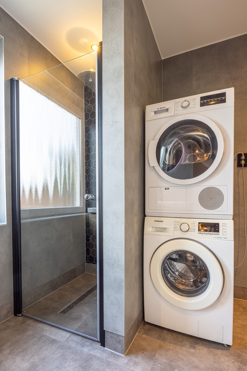 De badkamer is praktisch en netjes ingericht en beschikt over een inloopdouche en een badkamermeubel met wastafel en spiegel met verlichting. Het toilet is uitgevoerd als een zwevend toilet en voorzien van een afsluitbare deur. De ruimte is afgewerkt met een pvc-vloer en houten wandbekleding die doorloopt tot aan het plafond, wat zorgt voor een warme en verzorgde uitstraling. Tevens zijn hier de witgoedaansluitingen gesitueerd. Het raam is voorzien van gesatineerd glas, wat zorgt voor daglicht in combinatie met privacy.