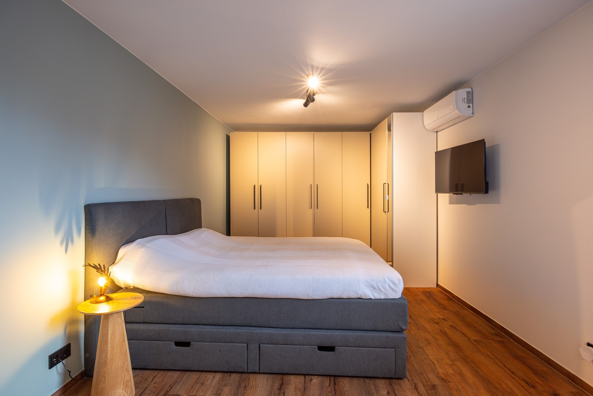 De slaapkamer is comfortabel van formaat en afgewerkt met een pvc vloer. Deze ruimte is voorzien van kunststof kozijnen met HR+ glas, een rolluik en airconditioning, wat bijdraagt aan een aangenaam binnenklimaat in alle seizoenen.