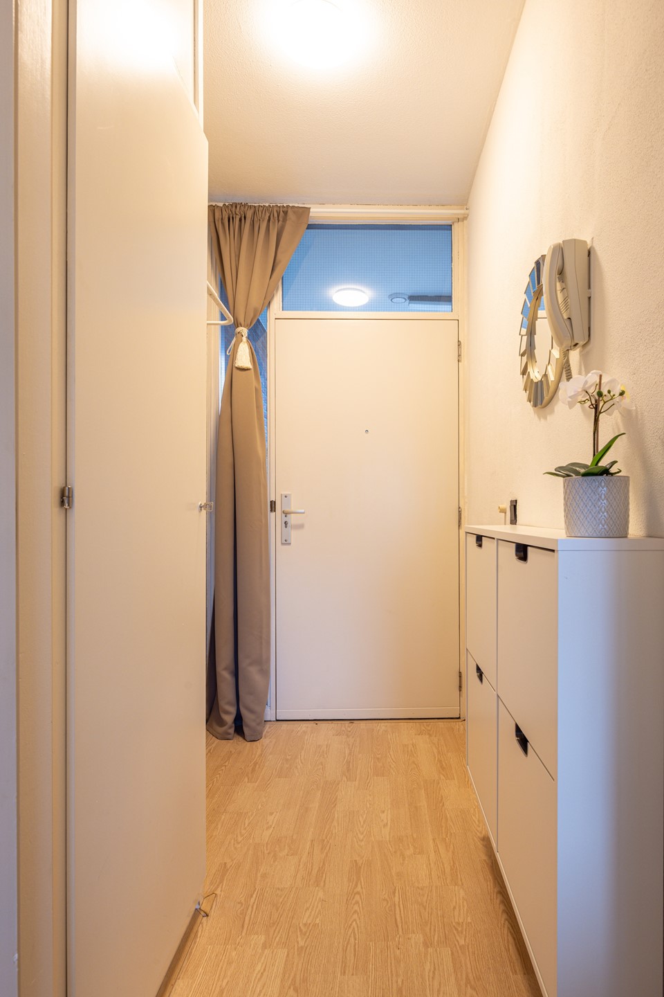 De ontvangsthal is afgewerkt met een laminaatvloer. Hier bevinden zich de garderobe en de meterkast. Vanuit de hal is er toegang tot de woonkamer.