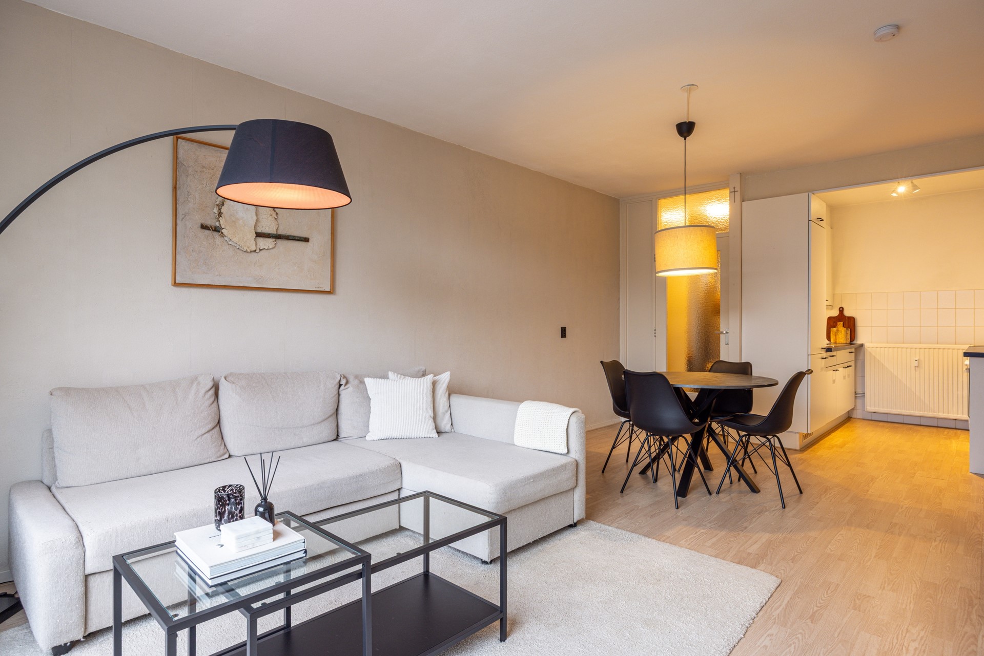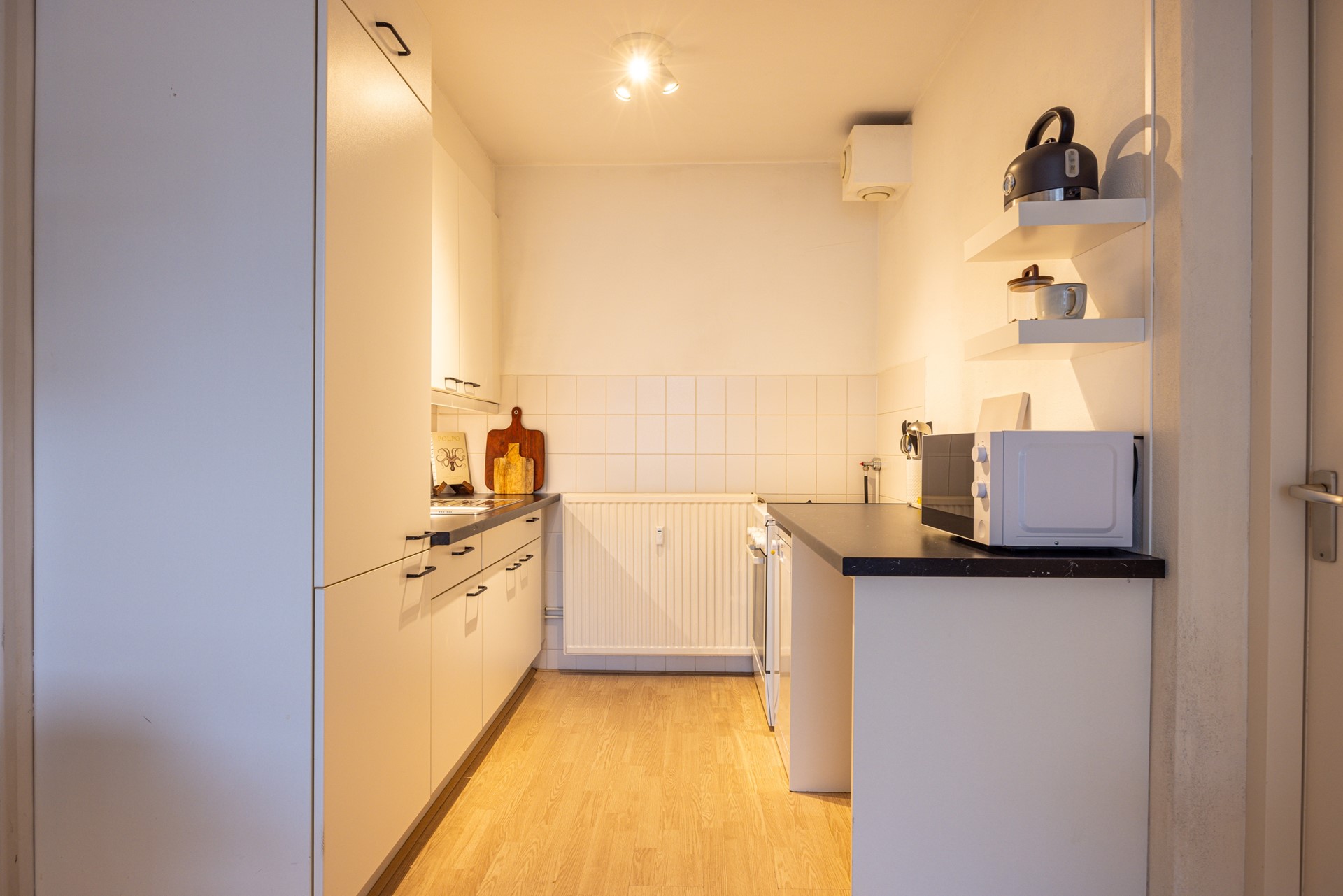 De woonkamer vormt het hart van het appartement en is een lichte en open leefruimte met veel daglichtinval. De laminaatvloer zorgt voor een rustige en verzorgde uitstraling. Er is voldoende ruimte voor zowel een comfortabele zithoek als een eethoek. Vanuit de woonkamer is er directe toegang tot het balkon (gelegen op Zuidwesten), waar je prettig buiten kunt zitten. Het balkon is voorzien van een zonnescherm, waardoor je ook op zonnige dagen beschut kunt genieten. De open keuken sluit aan op de woonkamer en is praktisch ingericht met keukenblokken aan twee zijden. Hierdoor is er veel werk- en kastruimte beschikbaar. De keuken is uitgerust met een koelkast, vriezer, gasfornuis, oven en vaatwasser.