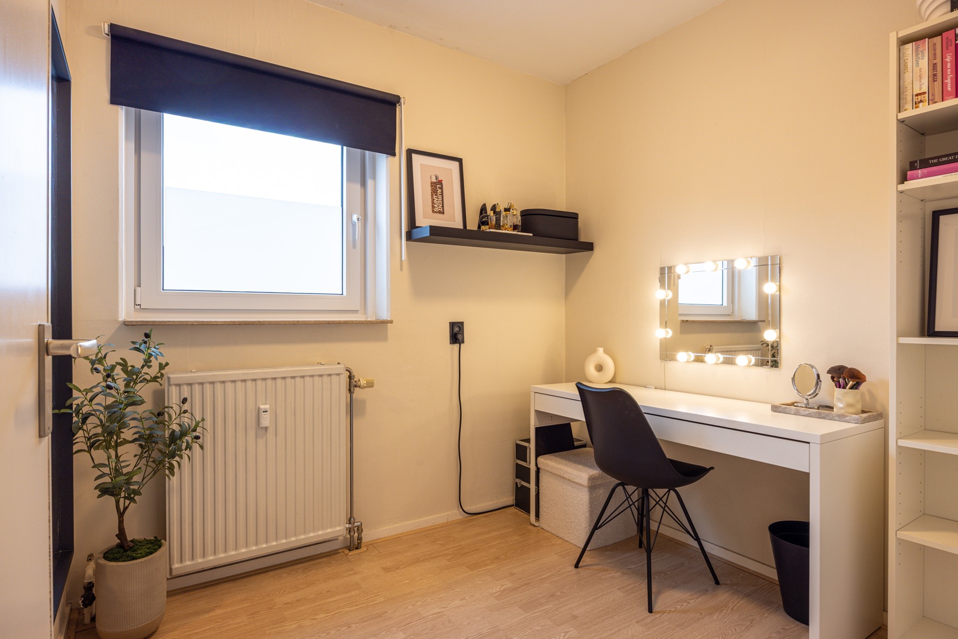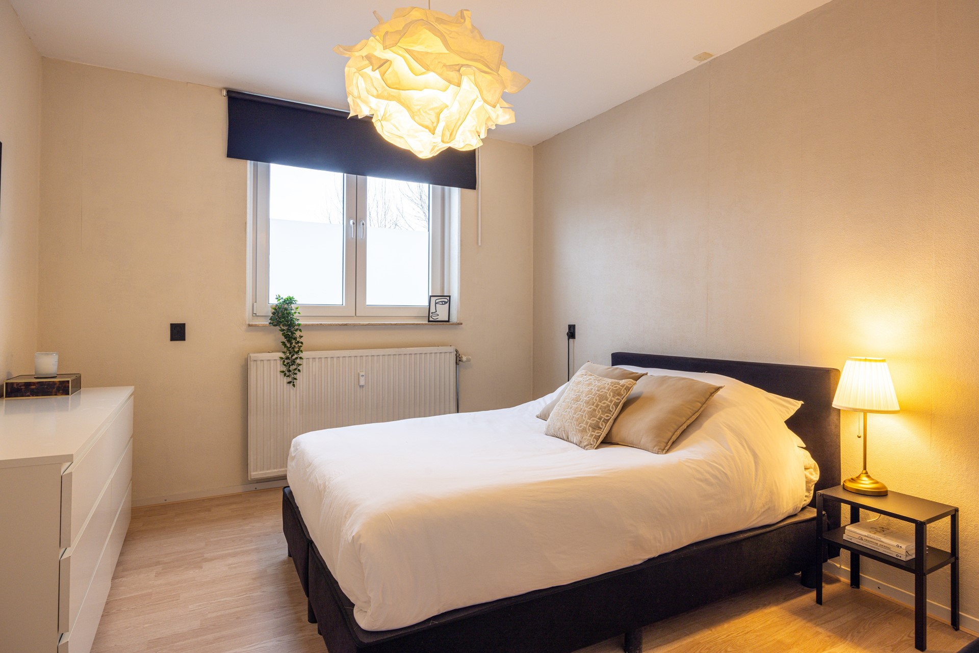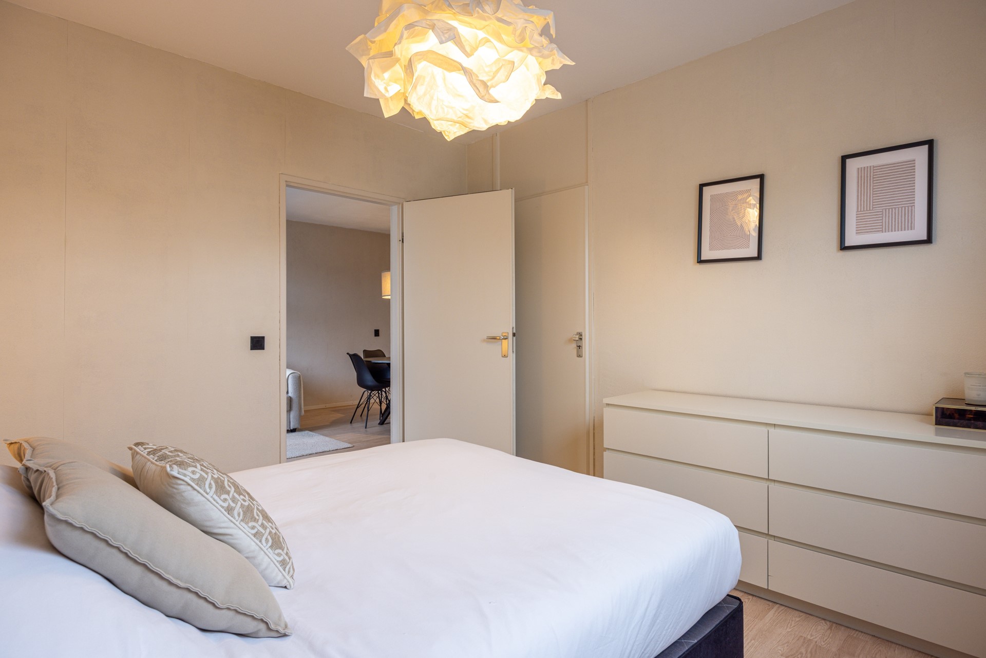 Via de woonkamer is de master bedroom bereikbaar. Deze slaapkamer is afgewerkt met een laminaatvloer en beschikt over prettig daglicht. Daarnaast is er een vaste muurkast, wat zorgt voor extra bergruimte. Vanuit de woonkamer is een tussenportaal bereikbaar. Dit portaal biedt toegang tot de tweede slaapkamer, muurkast, de badkamer en het separate toilet. De tweede slaapkamer is voorzien van dezelfde laminaatvloer en beschikt over prettig daglicht. De ruimte is geschikt als slaapkamer, maar ook uitstekend te gebruiken als werkkamer of hobbyruimte.