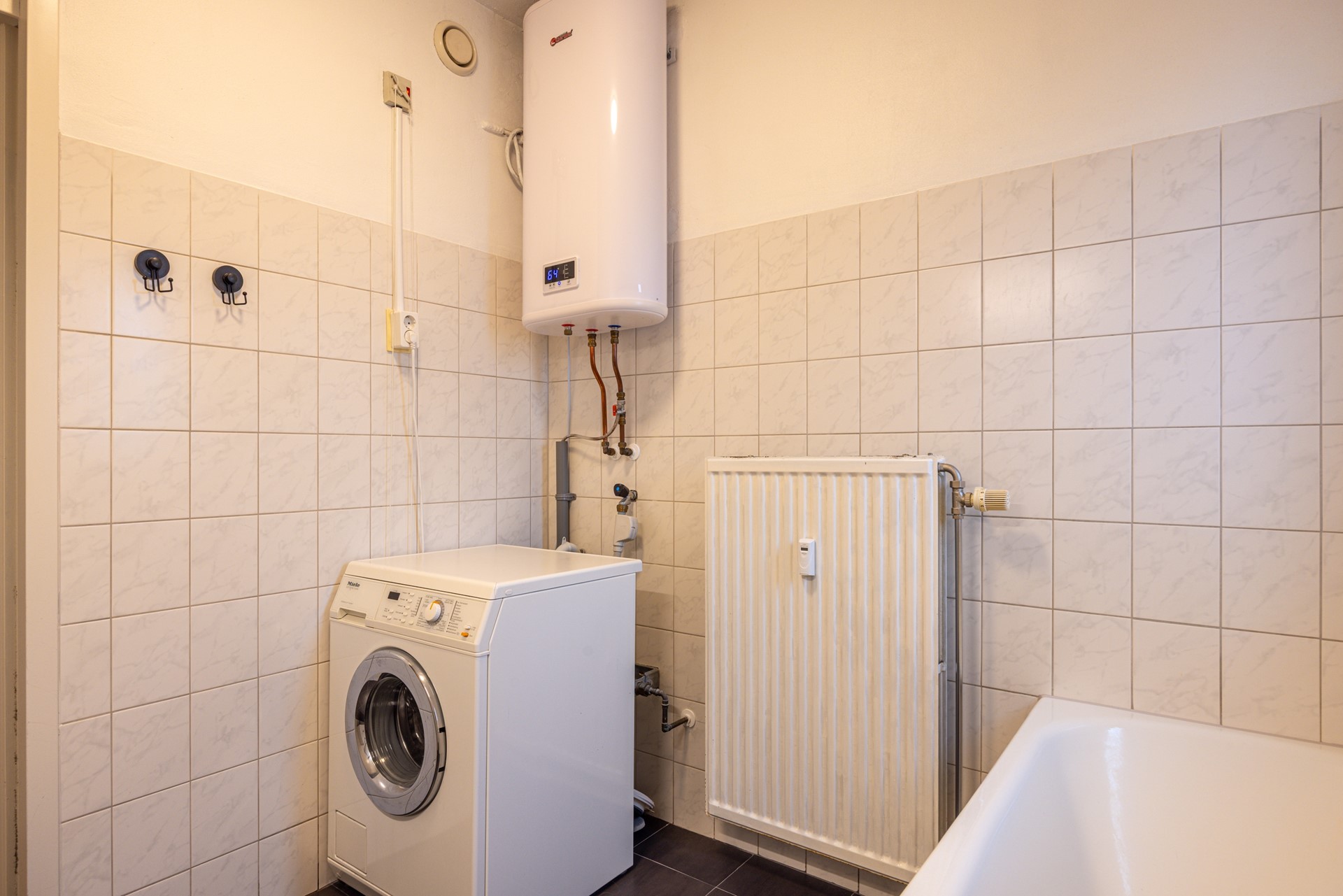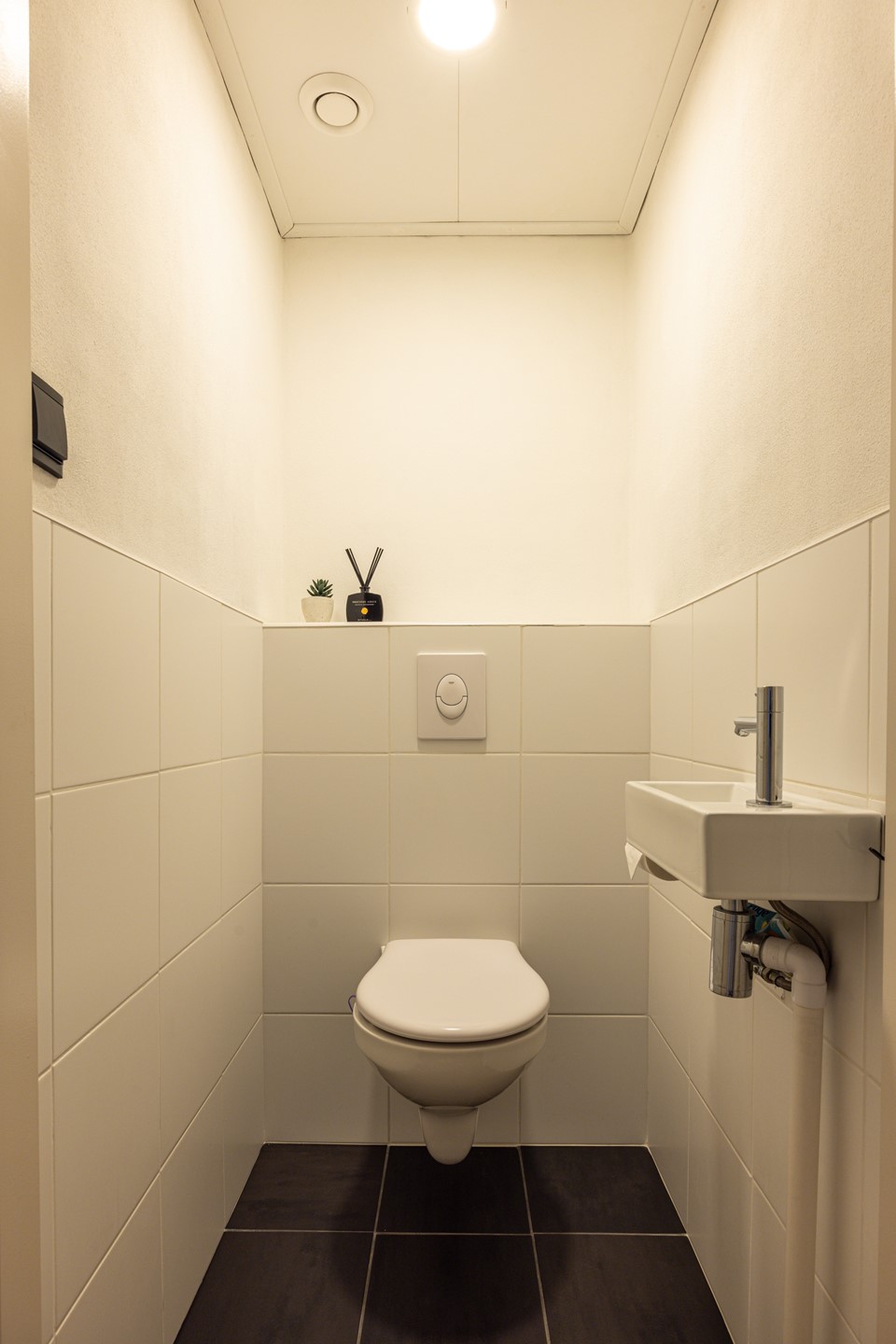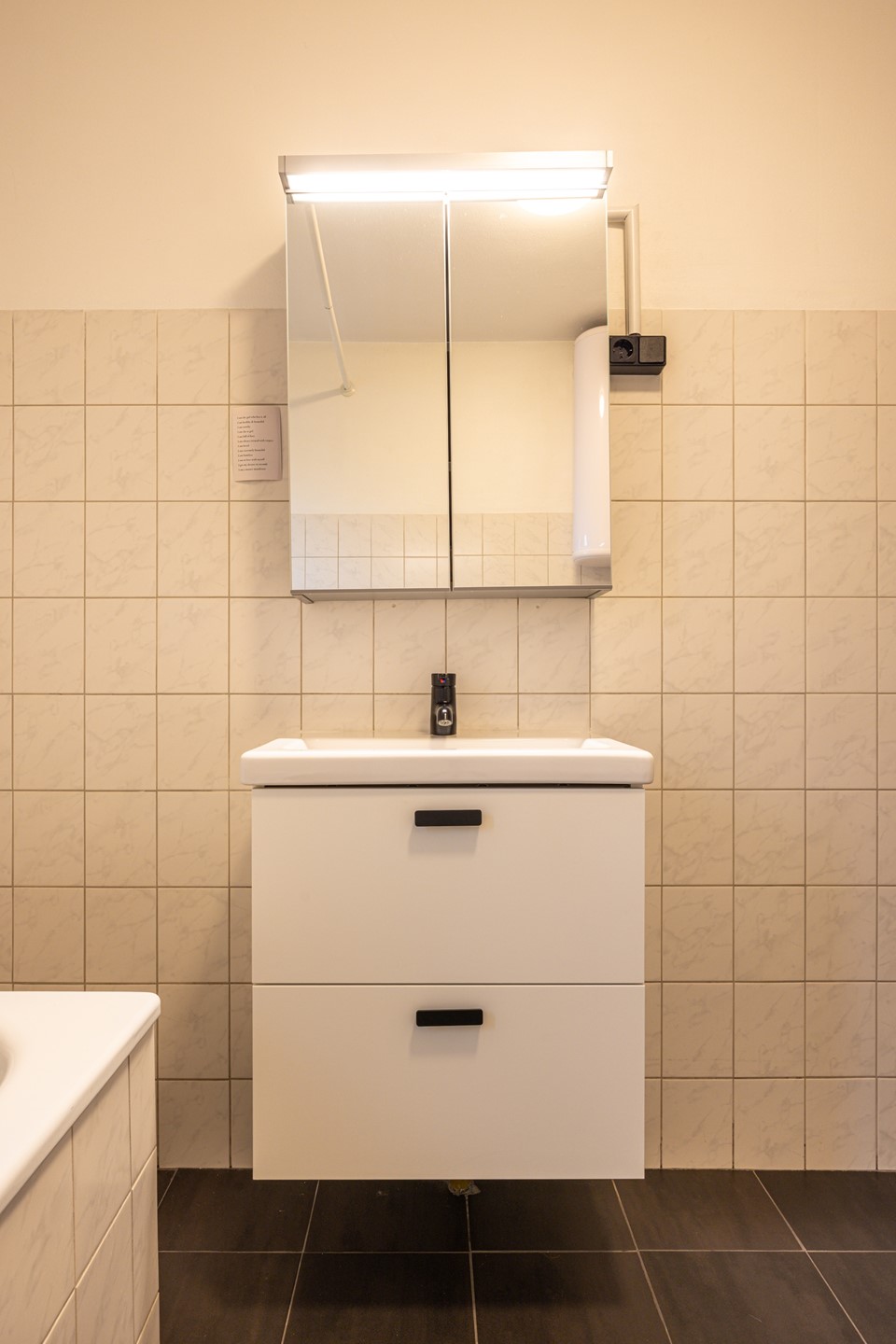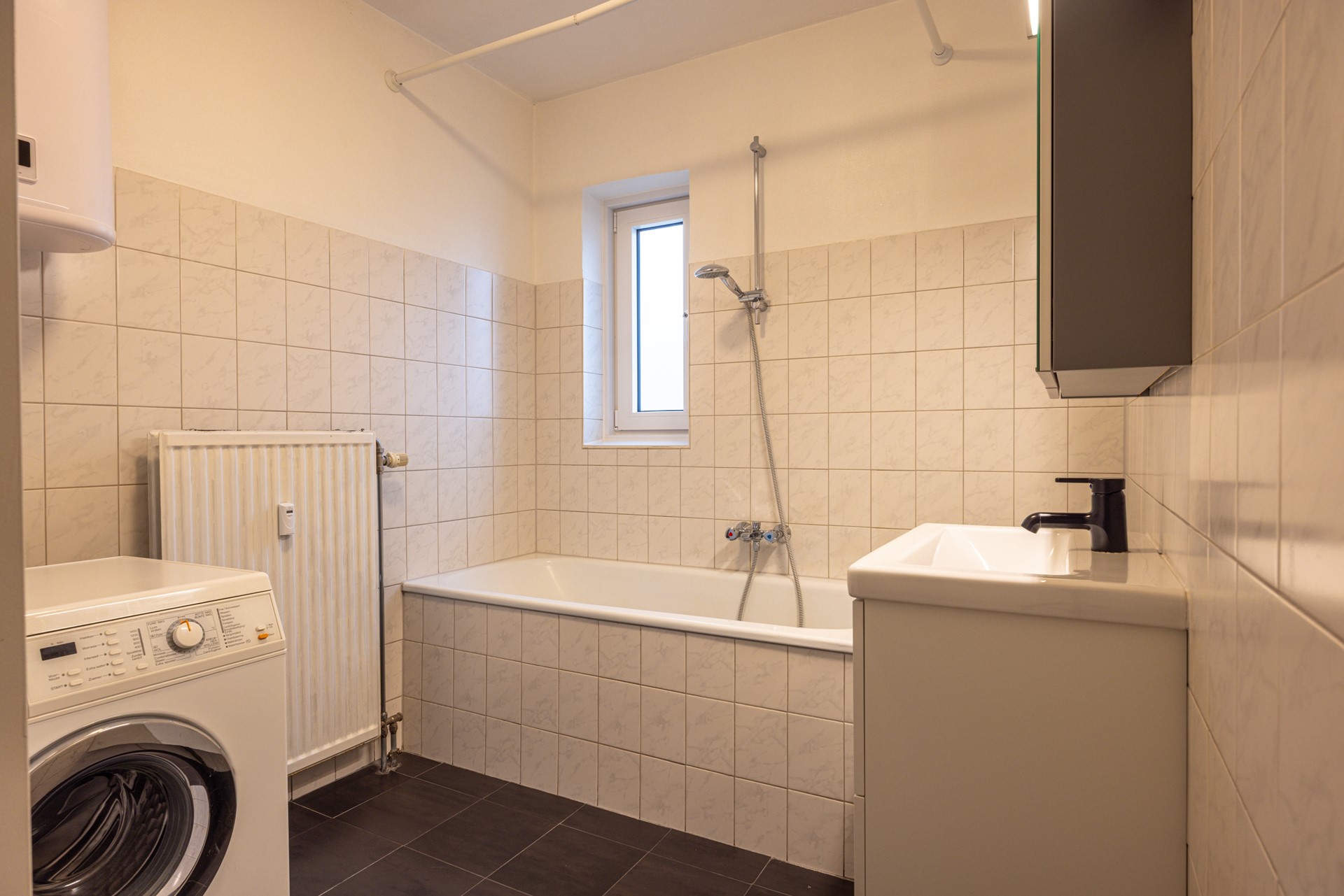 De badkamer is functioneel ingericht en voorzien van een ligbad met douche, een zwevend badkamermeubel met bijbehorende spiegel, de witgoedaansluitingen en een warmwaterboiler. Een complete en praktische ruimte voor dagelijks gebruik. Het separate toilet is netjes uitgevoerd met een zwevend closet en een fonteintje.