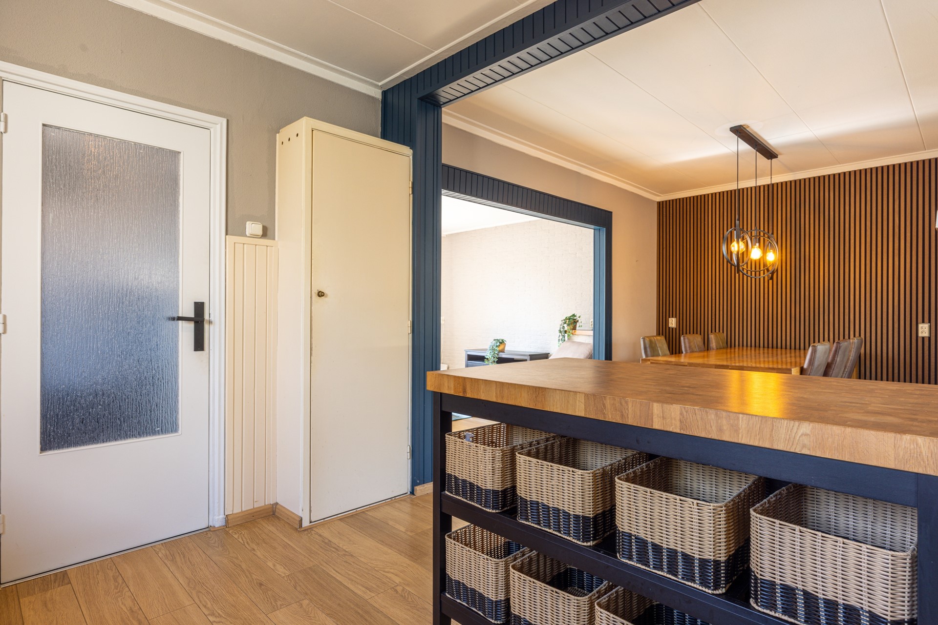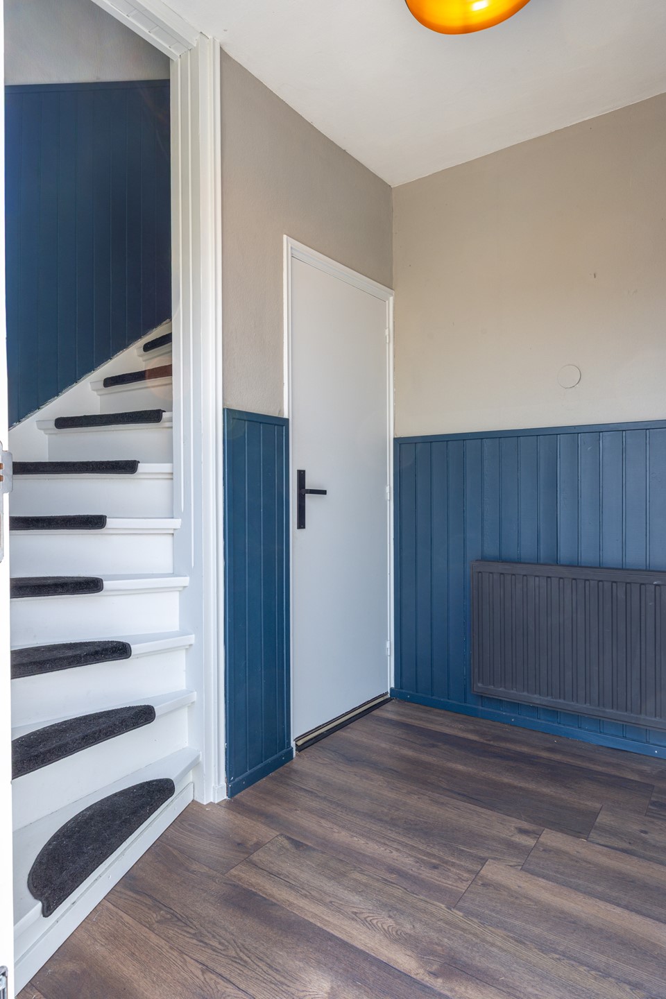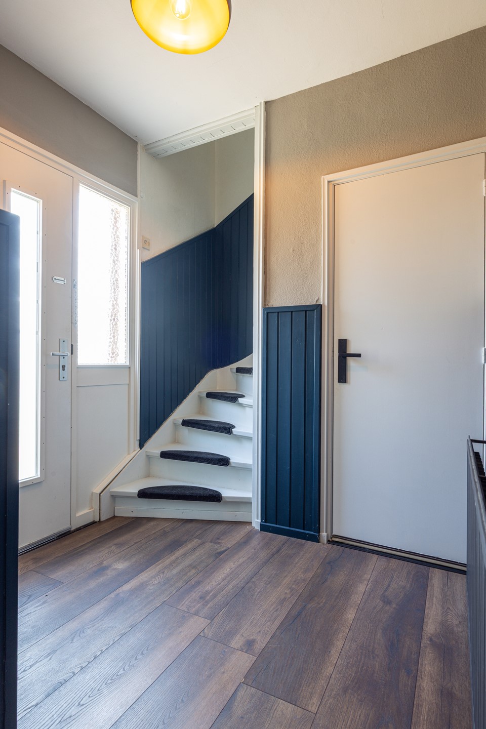 Bij binnenkomst kom je in de ontvangsthal, afgewerkt met een laminaatvloer. Hier bevinden zich de garderobe, meterkast, het toilet en de toegang tot de provisiekelder, ideaal voor extra bergruimte.