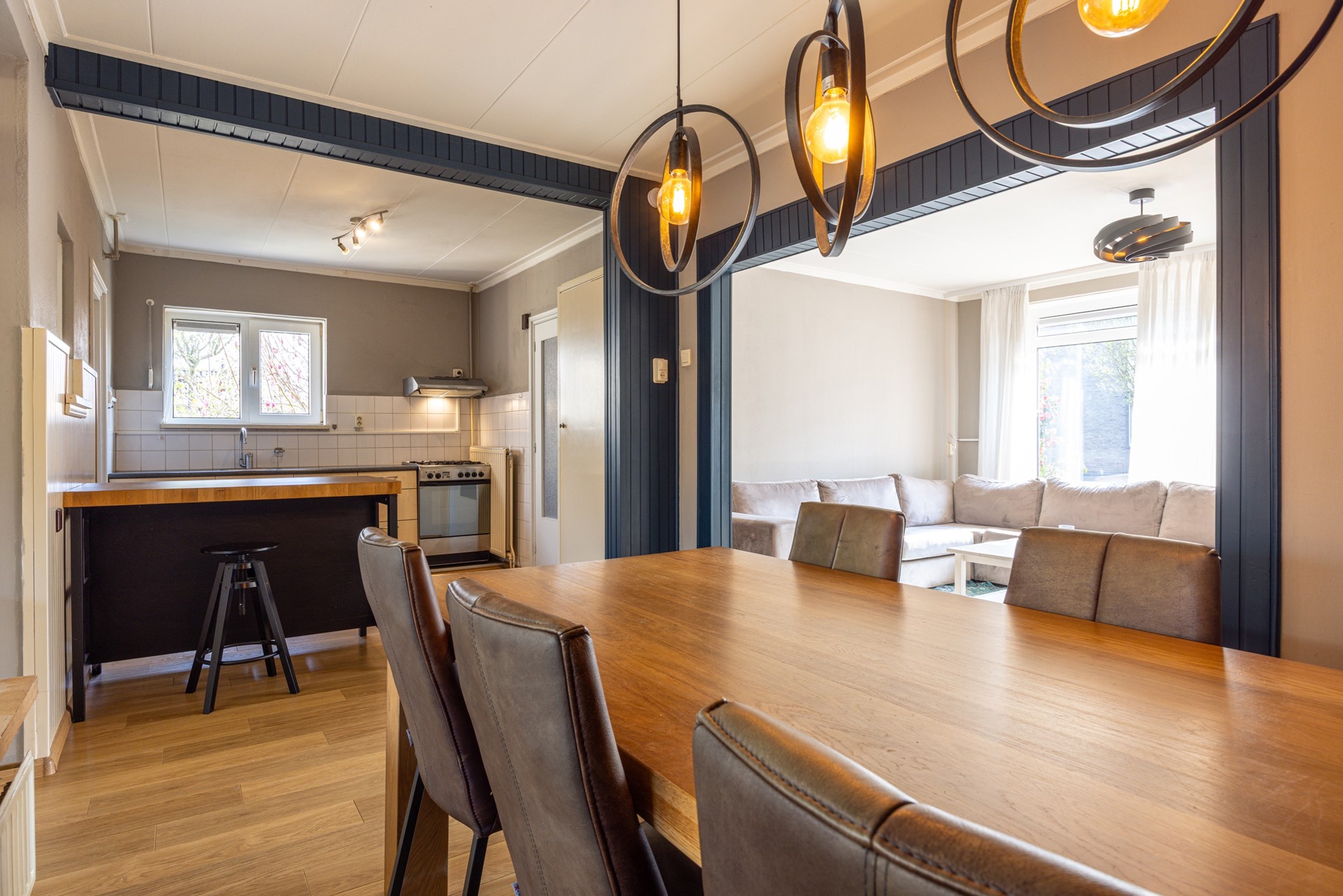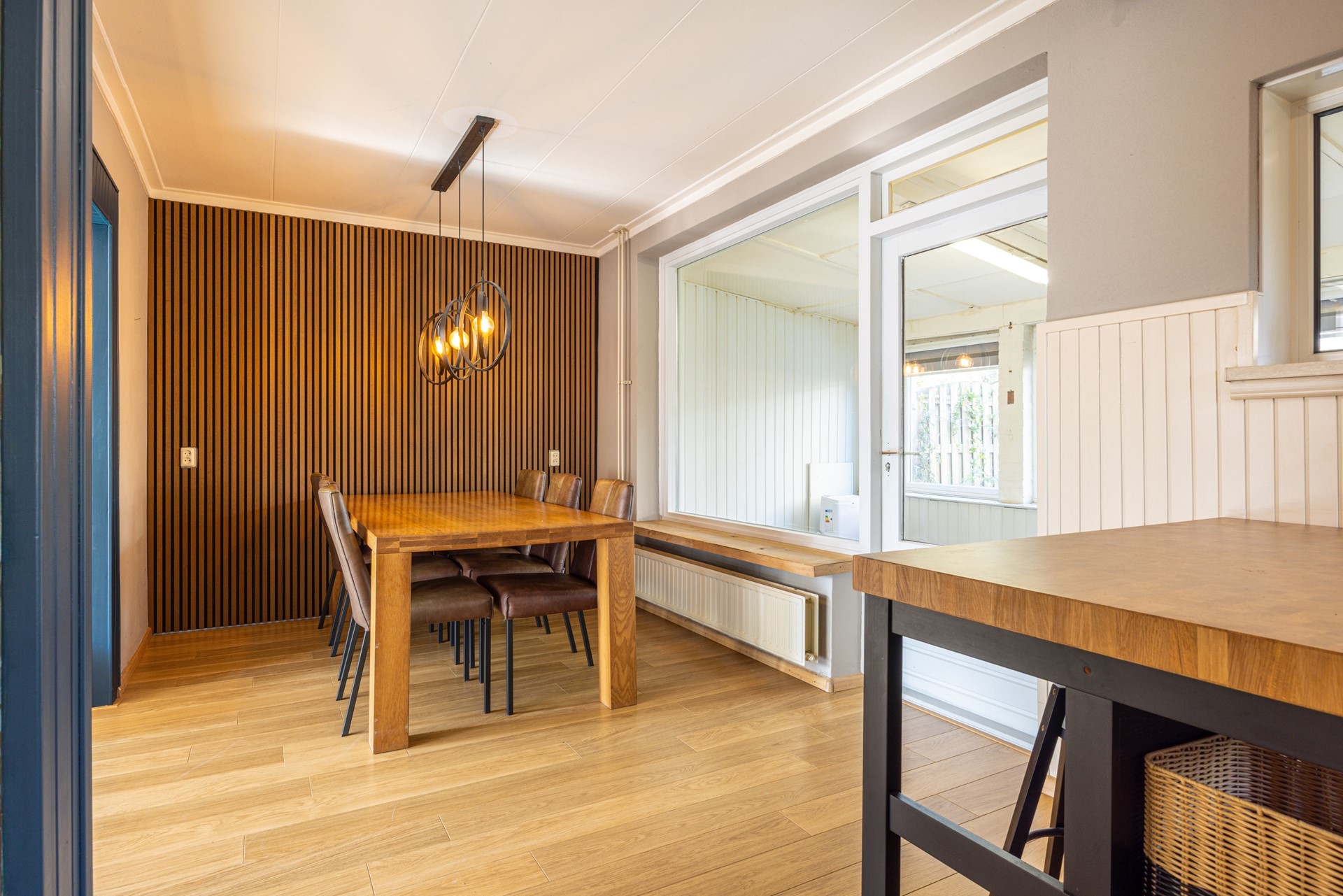 Vanuit zowel de woonkamer als de bijkeuken is de tuinkamer bereikbaar. Deze ruimte vormt een prettige overgang tussen binnen en buiten, waar je beschut kunt zitten met uitzicht op de tuin.