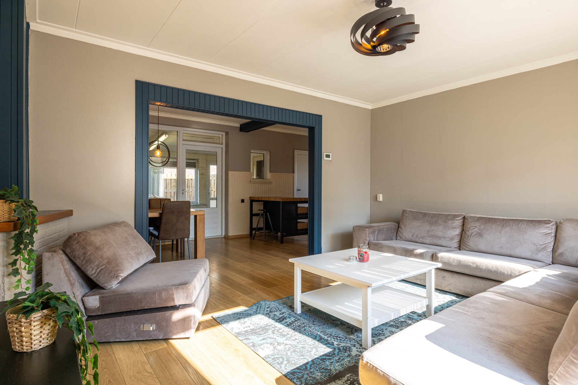 De woonkamer is voorzien van een warme parketvloer en geniet van veel daglicht dankzij de grote raampartijen. Aan de voorzijde is een rolluik aanwezig, wat zorgt voor extra comfort. De ruimte biedt voldoende plaats voor een zit- en eethoek en staat in open verbinding met de keuken.
