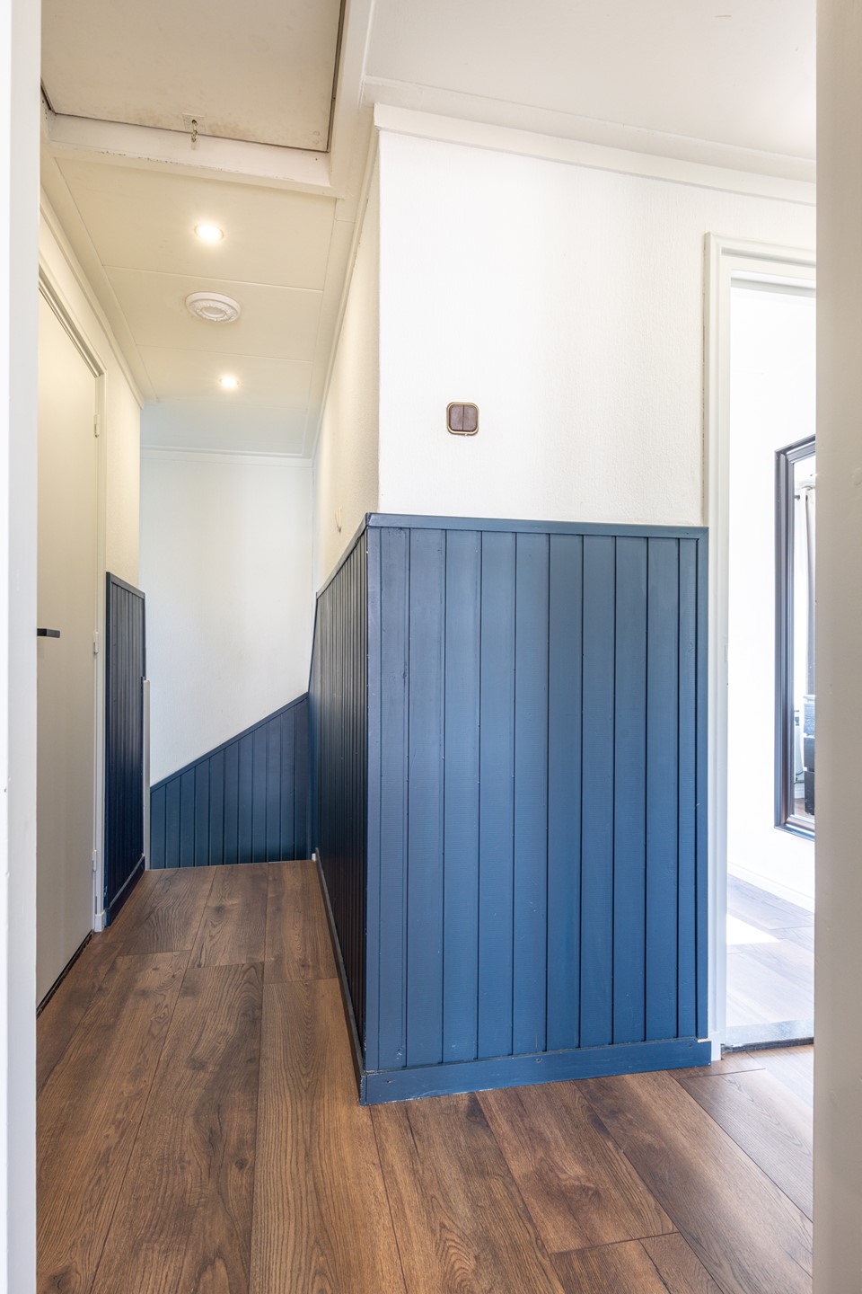 De overloop, afgewerkt met een laminaatvloer, geeft toegang tot vier slaapkamers en de badkamer. De slaapkamers zijn van goed formaat en voorzien van een laminaatvloer en inbouwspots. Dankzij de raampartijen komt er veel daglicht binnen en zijn de kamers prettig in gebruik. Daarnaast zijn de slaapkamers voorzien van rolluiken, waarbij de grootste slaapkamer aan de achterzijde beschikt over een elektrisch rolluik. De vierde kamer is ook geschikt als werk- of hobbyruimte, afhankelijk van de woonwensen. De badkamer is volledig betegeld en ingericht met een douchecabine met glazen wand en een wastafel. Het aanwezige raam zorgt voor natuurlijke ventilatie en daglicht.