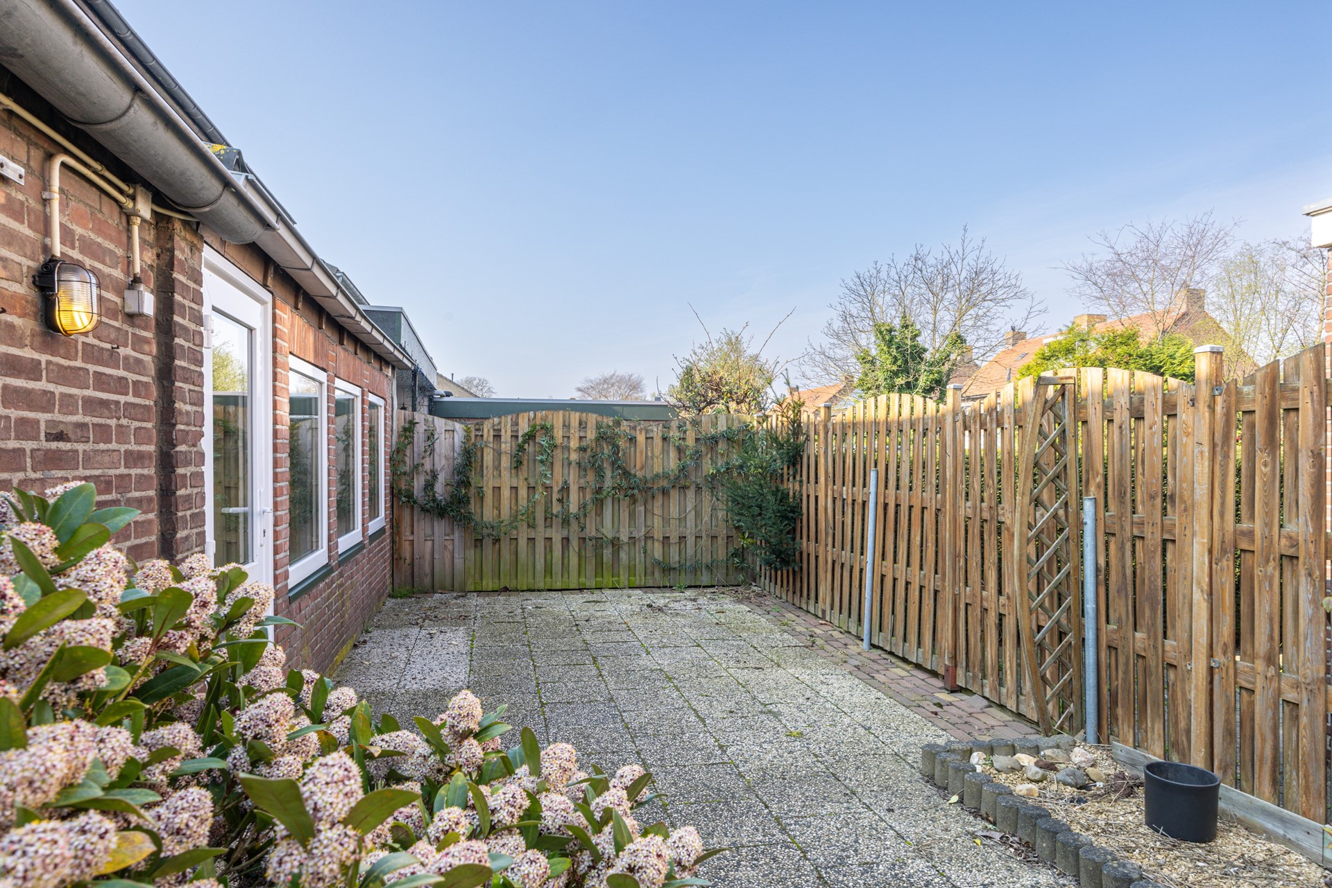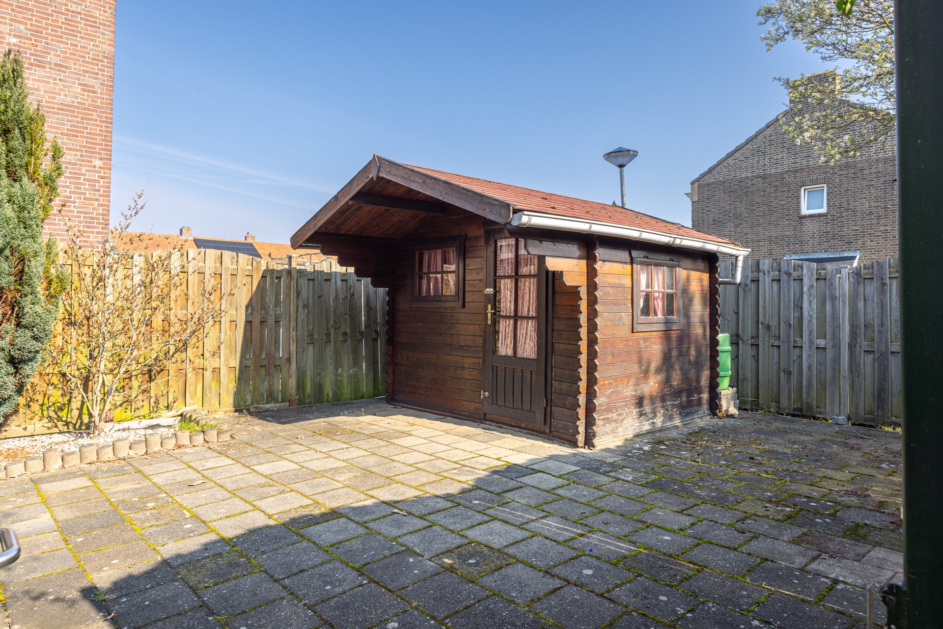De tuin biedt veel meer mogelijkheden dan je op het eerste gezicht zou verwachten. In de huidige situatie is de buitenruimte onderhoudsvriendelijk aangelegd met bestrating en borders met beplanting, waardoor je hier direct gebruik van kunt maken. Wat deze woning echter echt bijzonder maakt, is de royale zijtuin. Deze ruimte biedt volop potentie om de tuin aanzienlijk te vergroten. Door het verplaatsen van de schutting kan de zijtuin eenvoudig bij de achtertuin worden betrokken, waardoor een breed en diep perceel ontstaat. Hierdoor is er ruimte voor het realiseren van een garage, een ruime overkapping of juist een groene tuin met meerdere zitplekken. De aanwezige tuinkamer vormt een fijne overgang tussen binnen en buiten, waardoor je al vroeg in het seizoen beschut kunt genieten van de tuin. Achter in de tuin bevindt zich daarnaast een tuinhuis met verlichting, ideaal voor extra bergruimte.