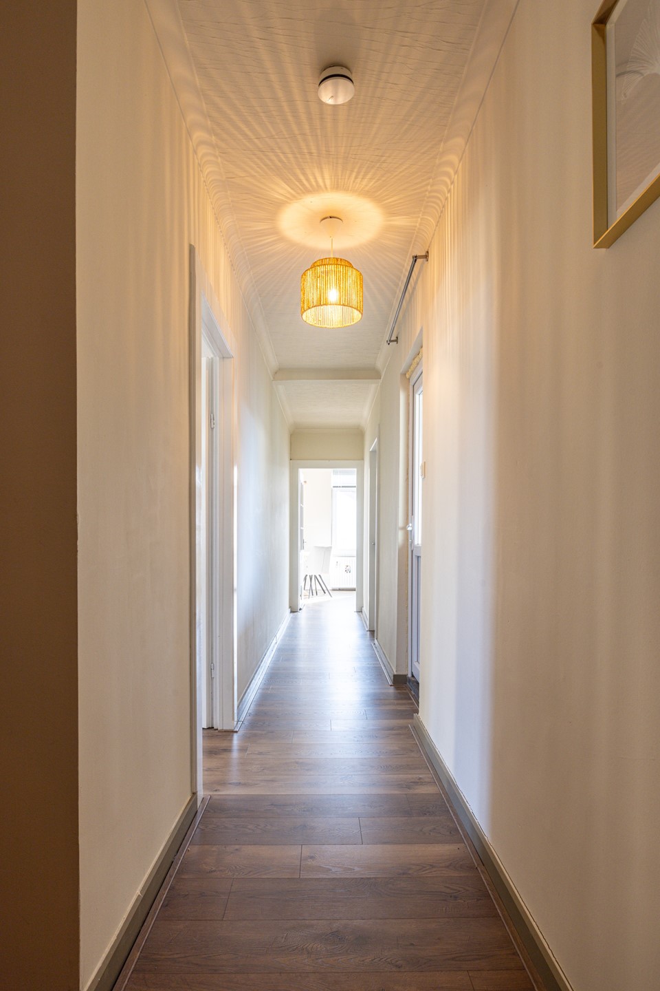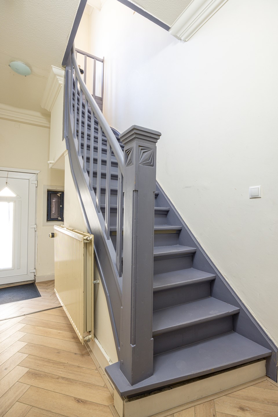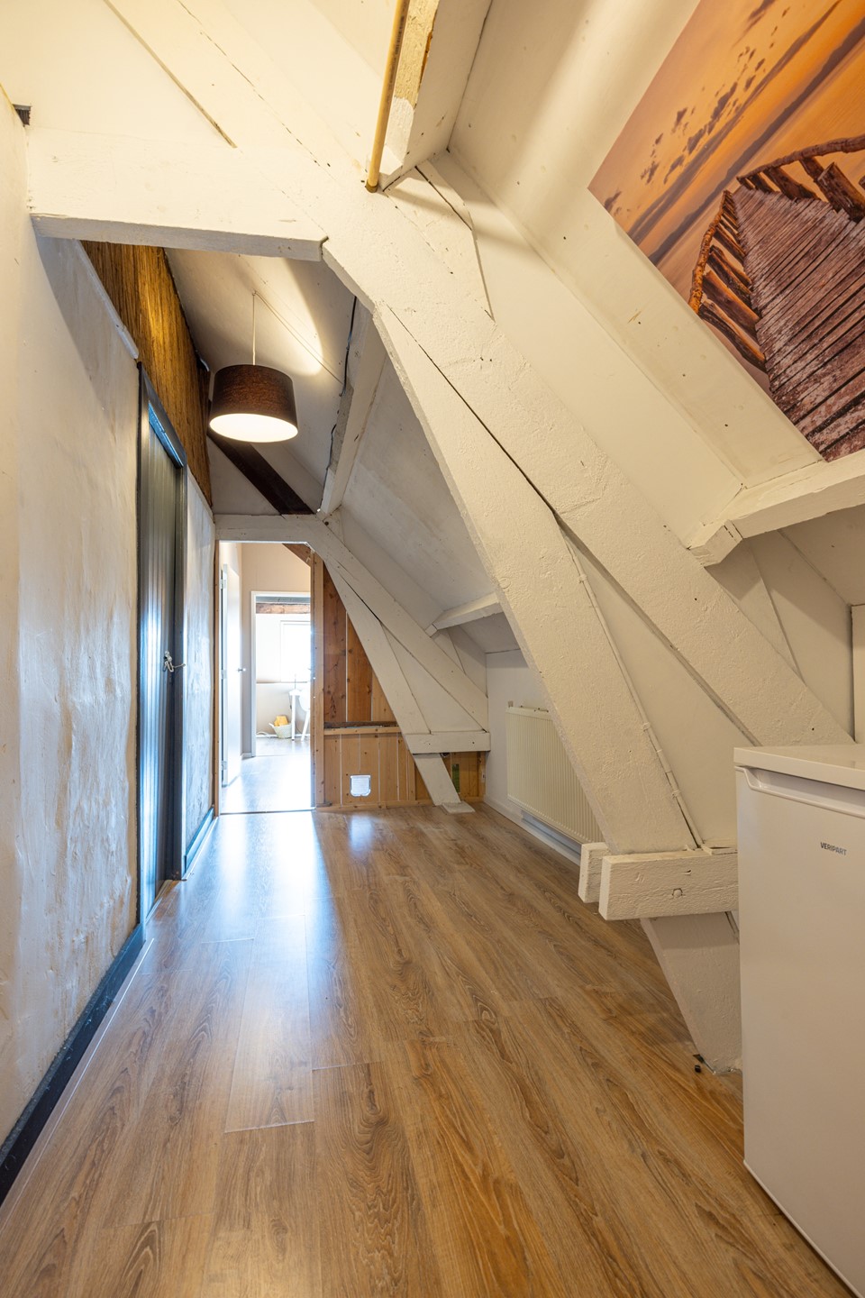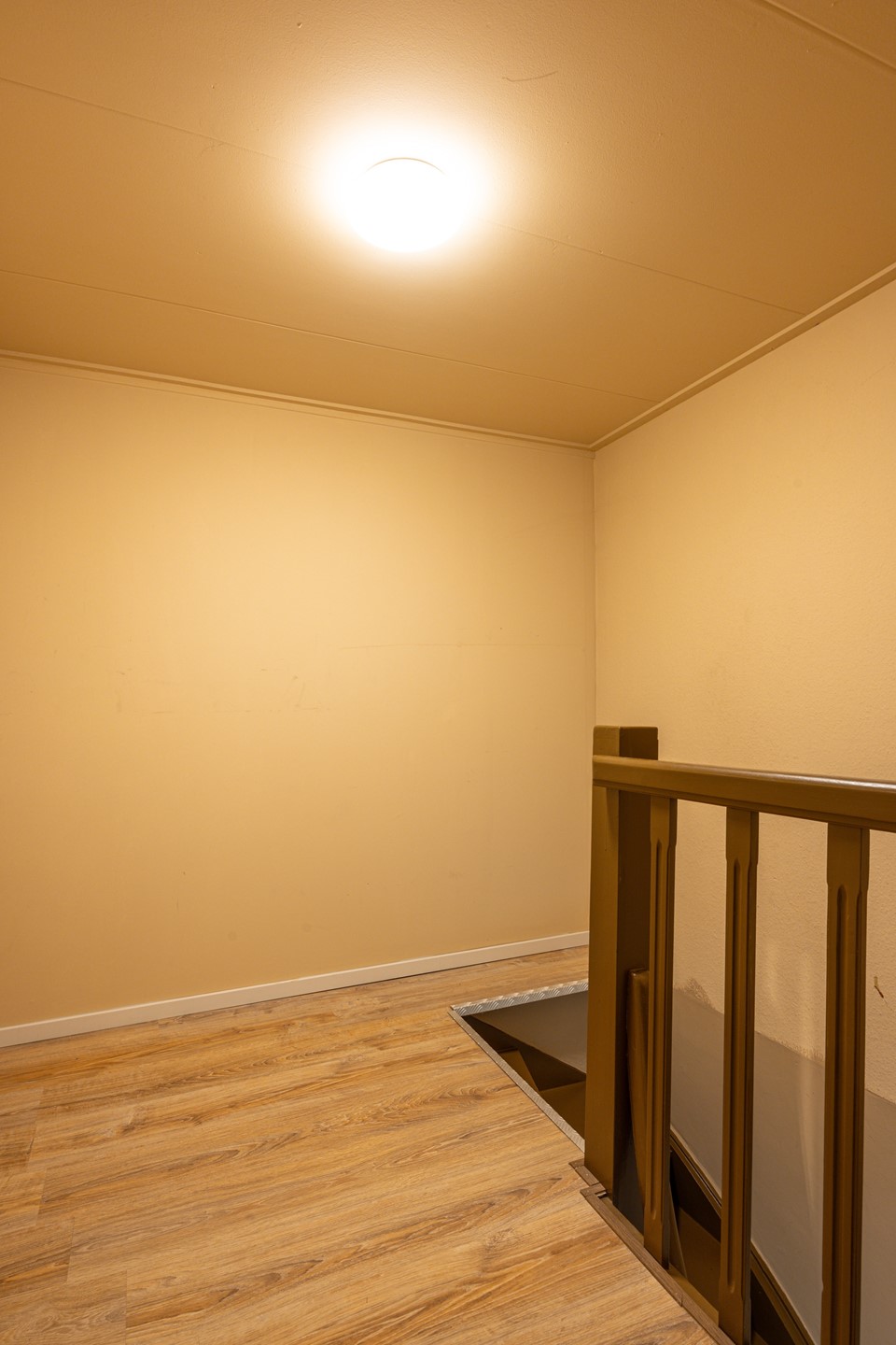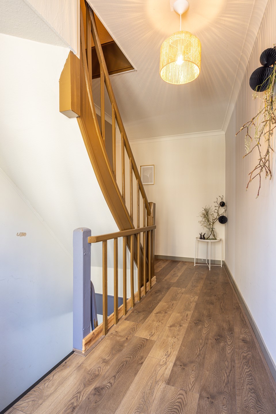 Via de eigen entree op de begane grond kom je binnen in de ontvangsthal, waar zich de meterkast bevindt. Via de trap bereik je de eerste verdieping. De overloop is afgewerkt met een pvc-vloer en geeft toegang tot de woonkamer, een slaapkamer en de badkamer..
