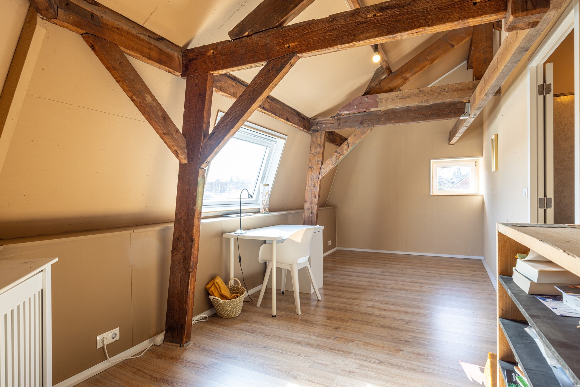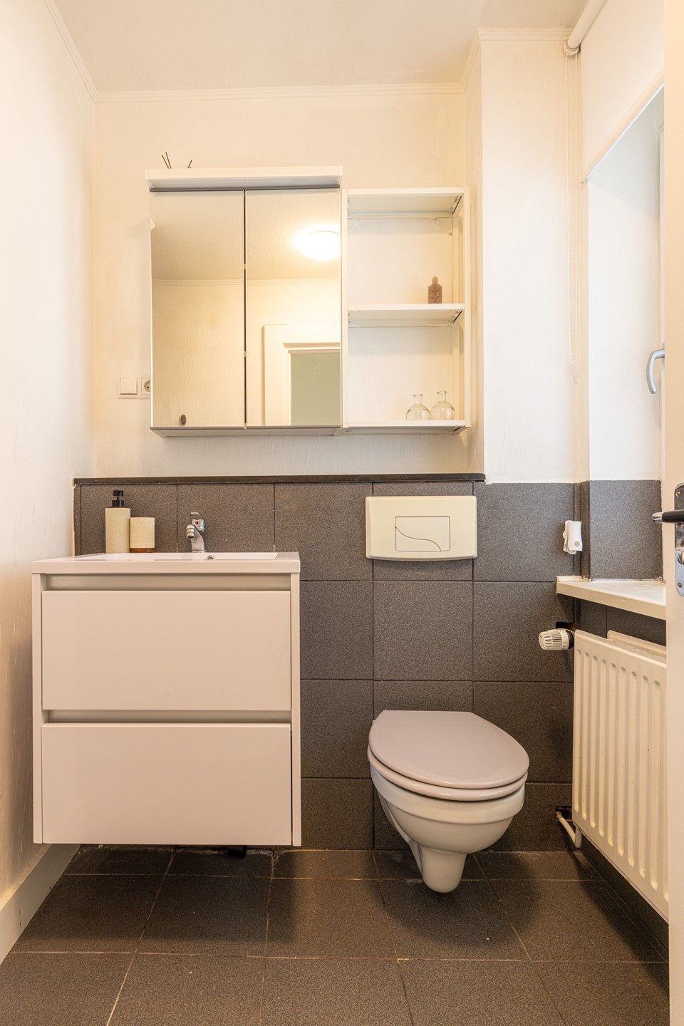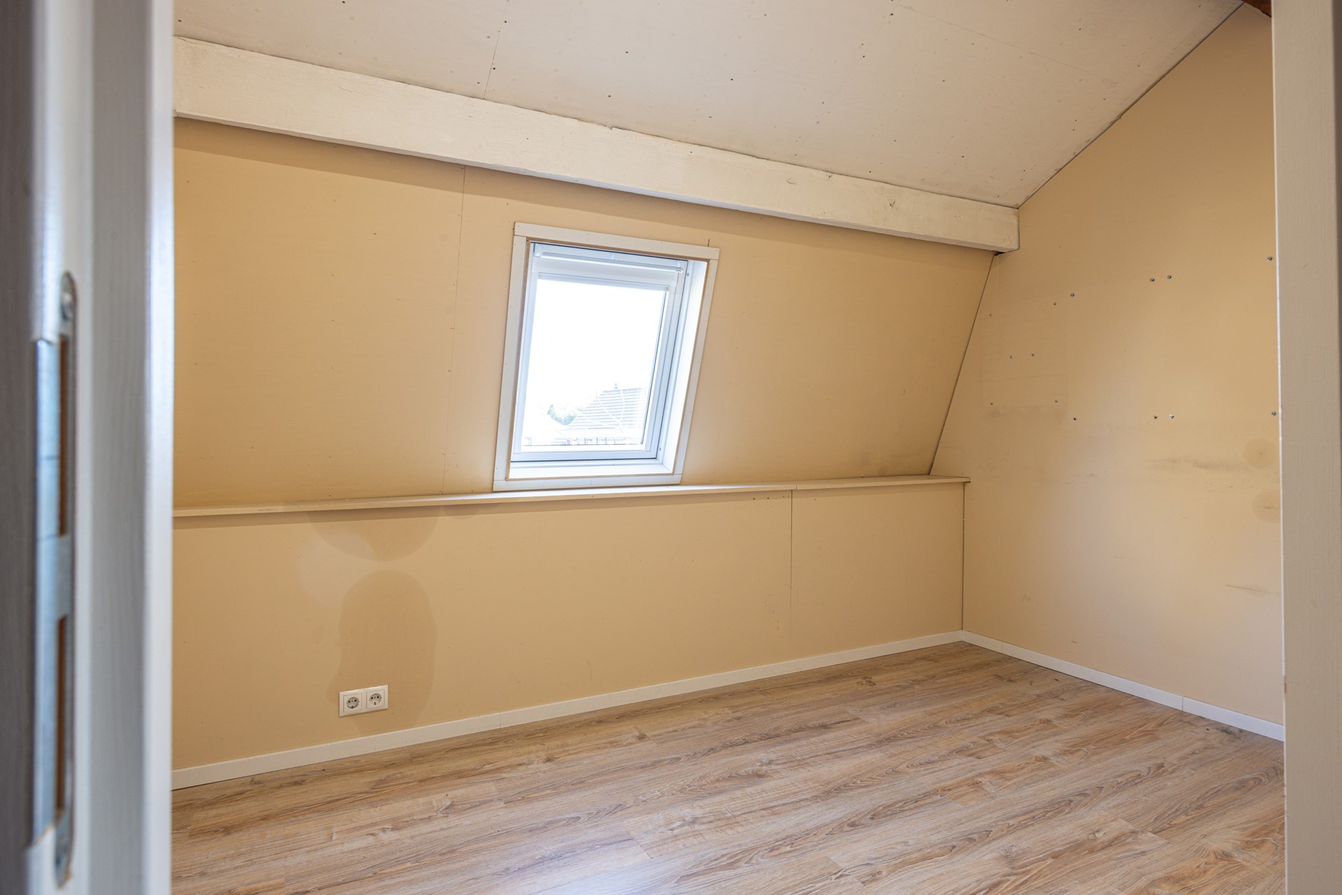 De slaapkamer op deze verdieping is van goed formaat en afgewerkt met een laminaatvloer. Ook hier zorgen de kunststof kozijnen met HR++ beglazing voor een aangenaam wooncomfort. De badkamer is praktisch ingericht met een tegelvloer, een douche, een zwevend toilet en een badkamermeubel met wastafel en spiegel.