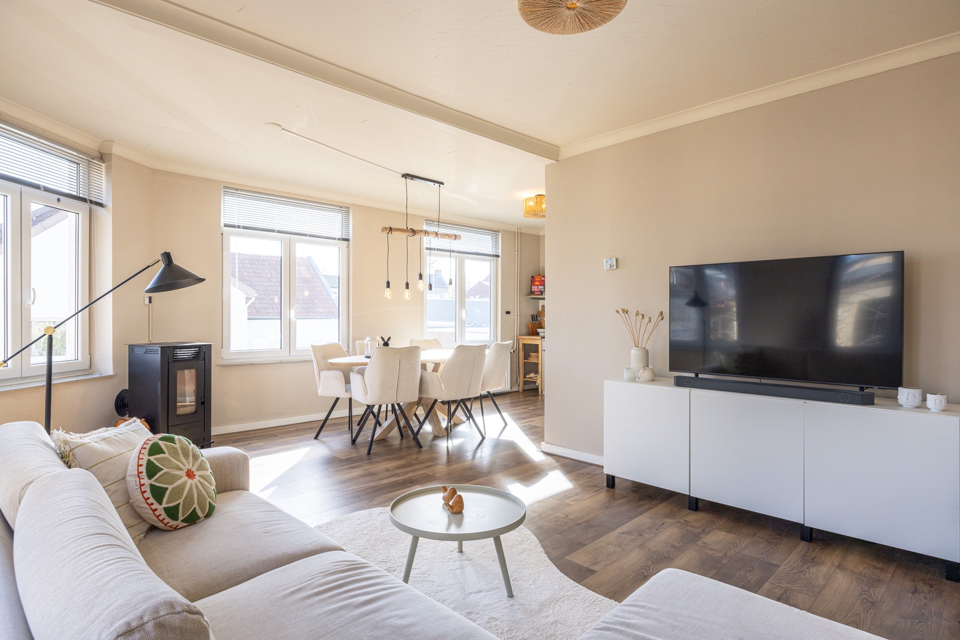 De woonkamer vormt het centrale leefgedeelte van de woning en is ruim van opzet. Dankzij de grote raampartijen komt er veel daglicht binnen, wat zorgt voor een aangename en open sfeer. De ruimte biedt voldoende plek voor zowel een comfortabele zithoek als een eethoek, waardoor het een fijne plek is om te verblijven. De afwerking met een laminaatvloer en de aanwezigheid van kunststof kozijnen met HR++ beglazing dragen bij aan het wooncomfort. Daarnaast is de woonkamer voorzien van een pelletkachel, die zorgt voor extra warmte en een aangename sfeer in de ruimte.