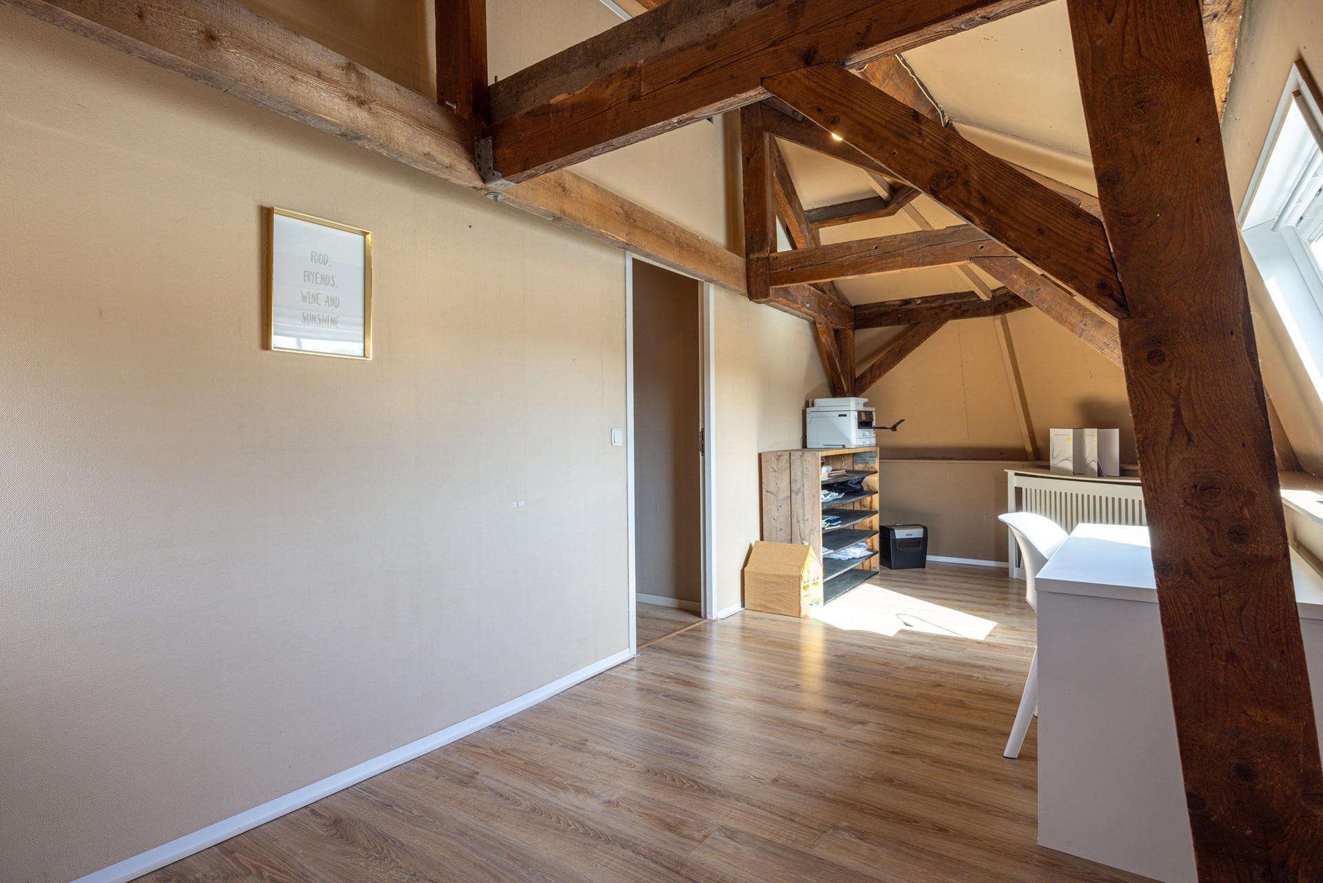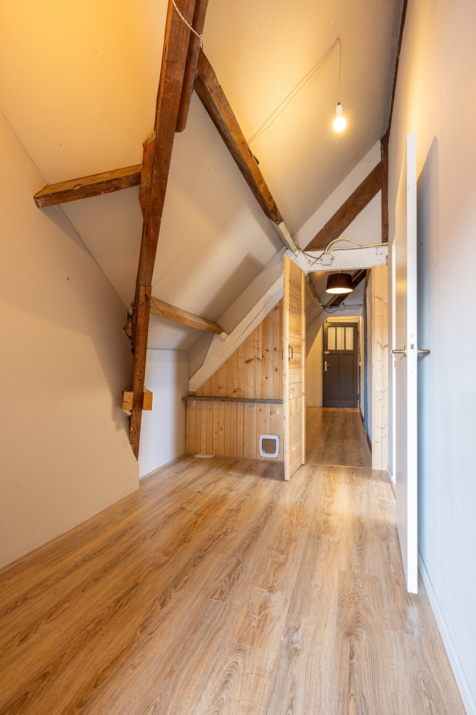 Via een houten trap bereik je de tweede verdieping. De overloop vormt een centrale verbinding en geeft toegang tot twee slaapkamers, een separate opslagruimte en de technische ruimte.