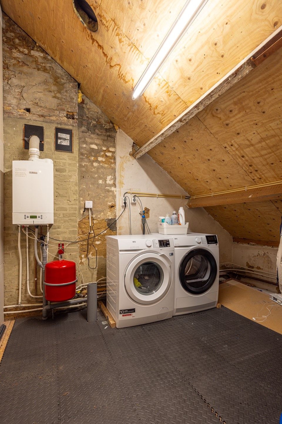 De technische ruimte is praktisch ingericht en biedt naast de opstelling van de cv-installatie ook plaats voor de witgoedaansluitingen. De separate opslagruimte zorgt voor extra bergruimte, ideaal voor het opbergen van seizoensspullen en andere huishoudelijke zaken.