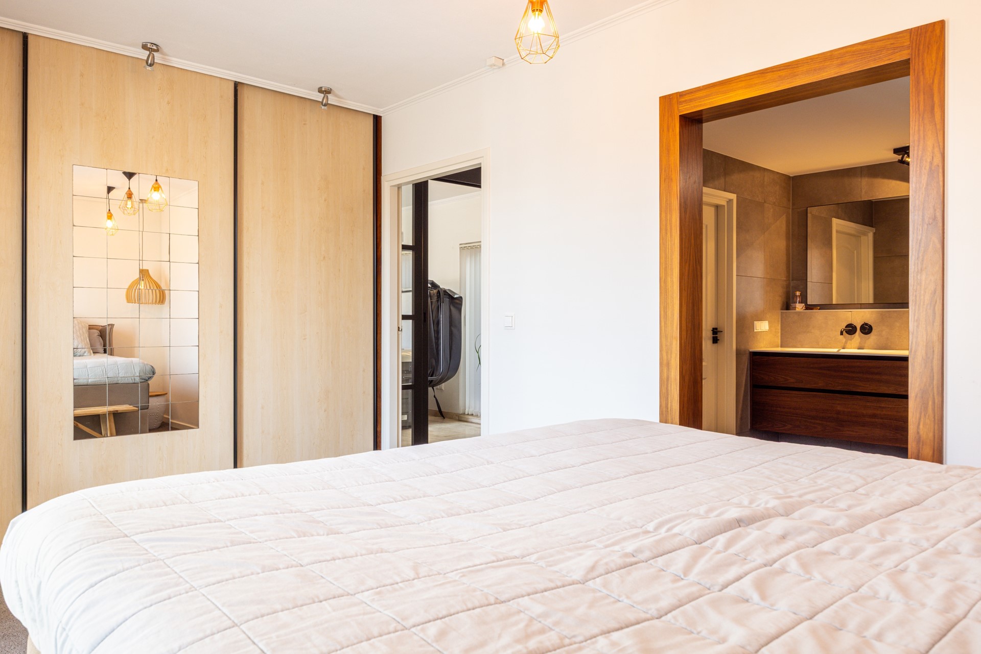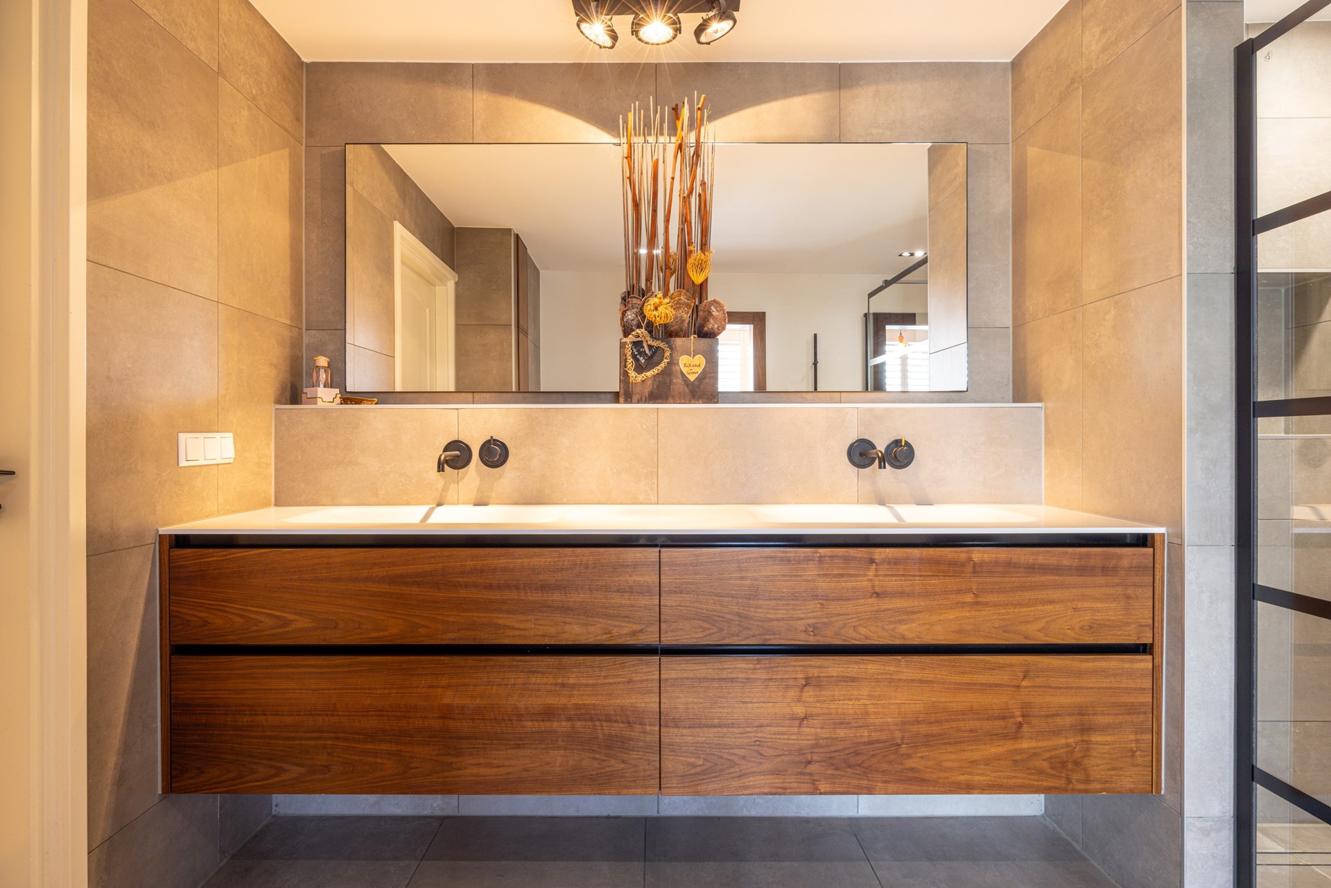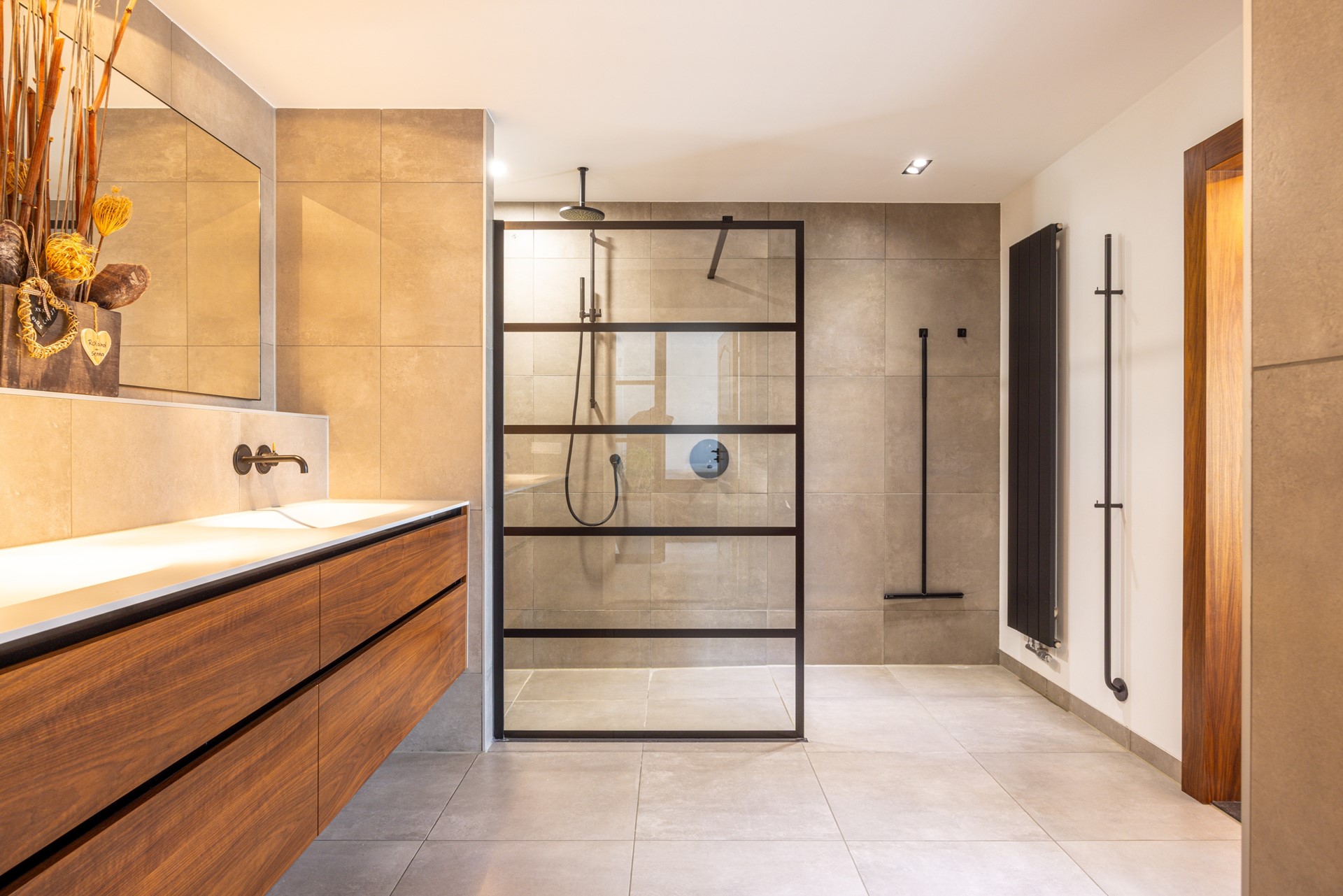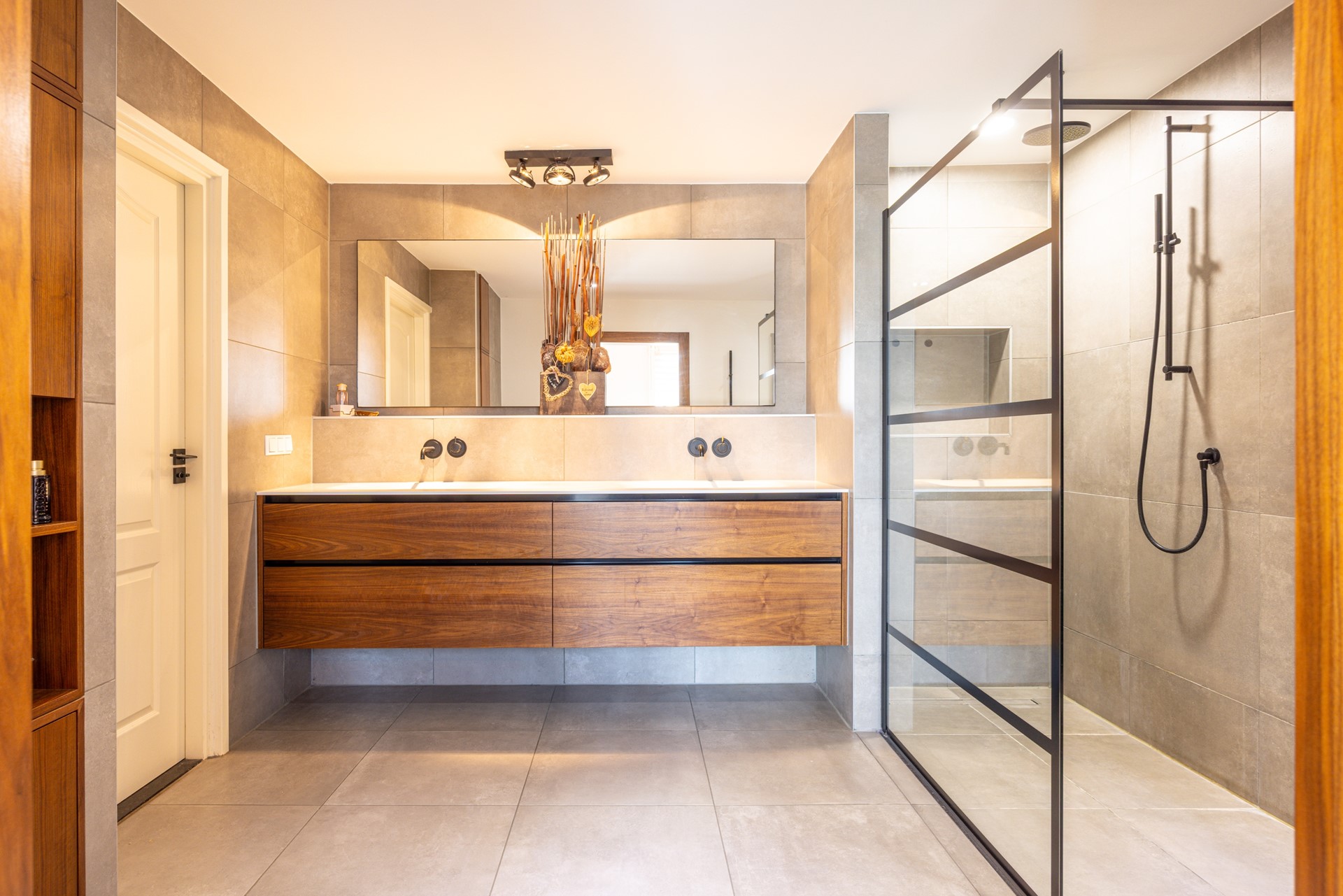De badkamer (2018) is modern en volledig betegeld, ingericht met een inloopdouche met glazen wand, dubbele wastafel met meubel en spiegel, een tweede toilet en een designradiator. Een complete en verzorgde ruimte die perfect aansluit op de slaapkamer.