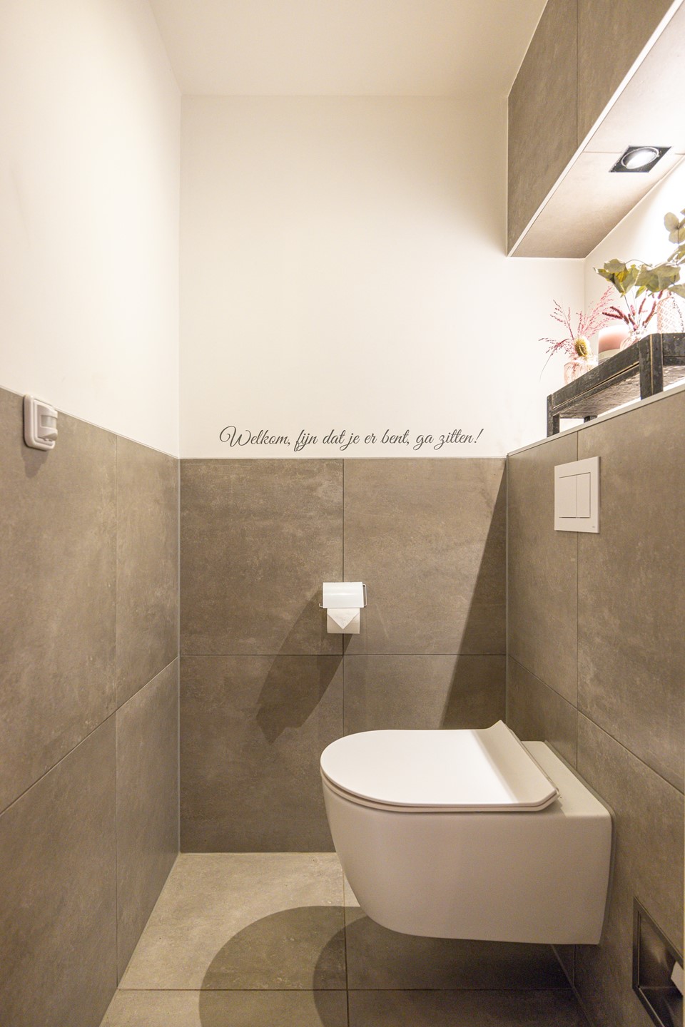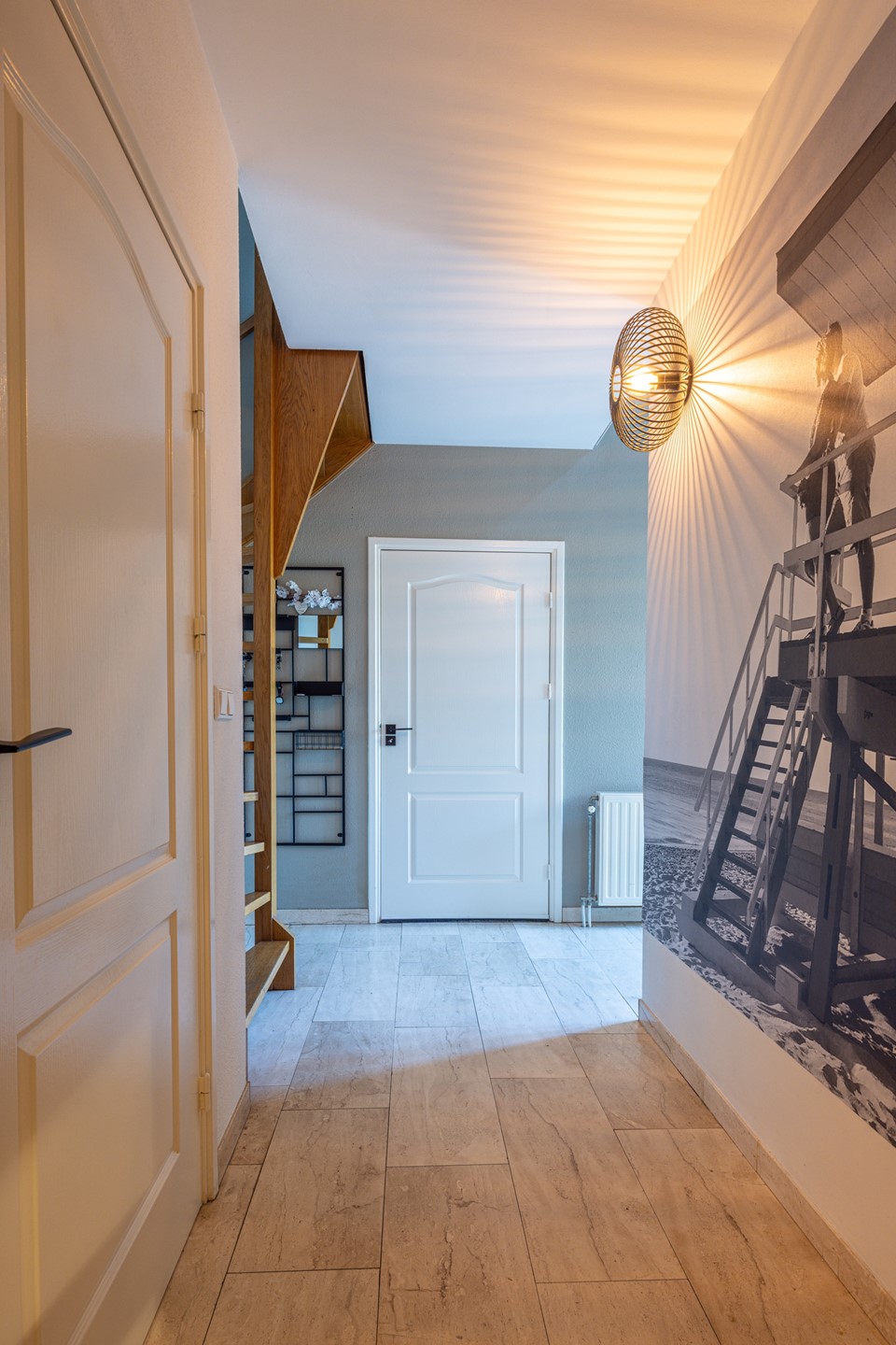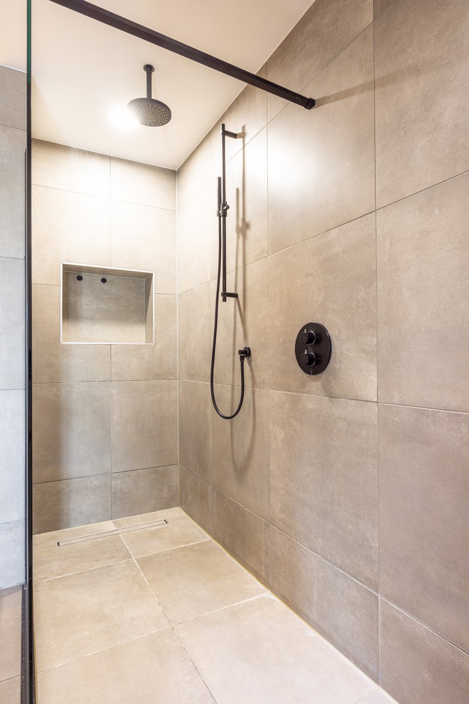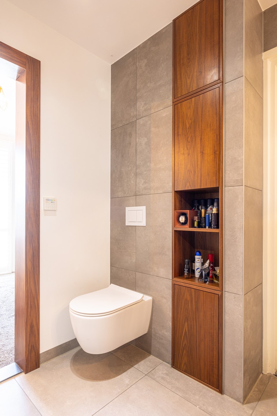 De badkamer (2018) is modern en volledig betegeld, ingericht met een inloopdouche met glazen wand, dubbele wastafel met meubel en spiegel, een tweede toilet en een designradiator. Een complete en verzorgde ruimte die perfect aansluit op de slaapkamer.