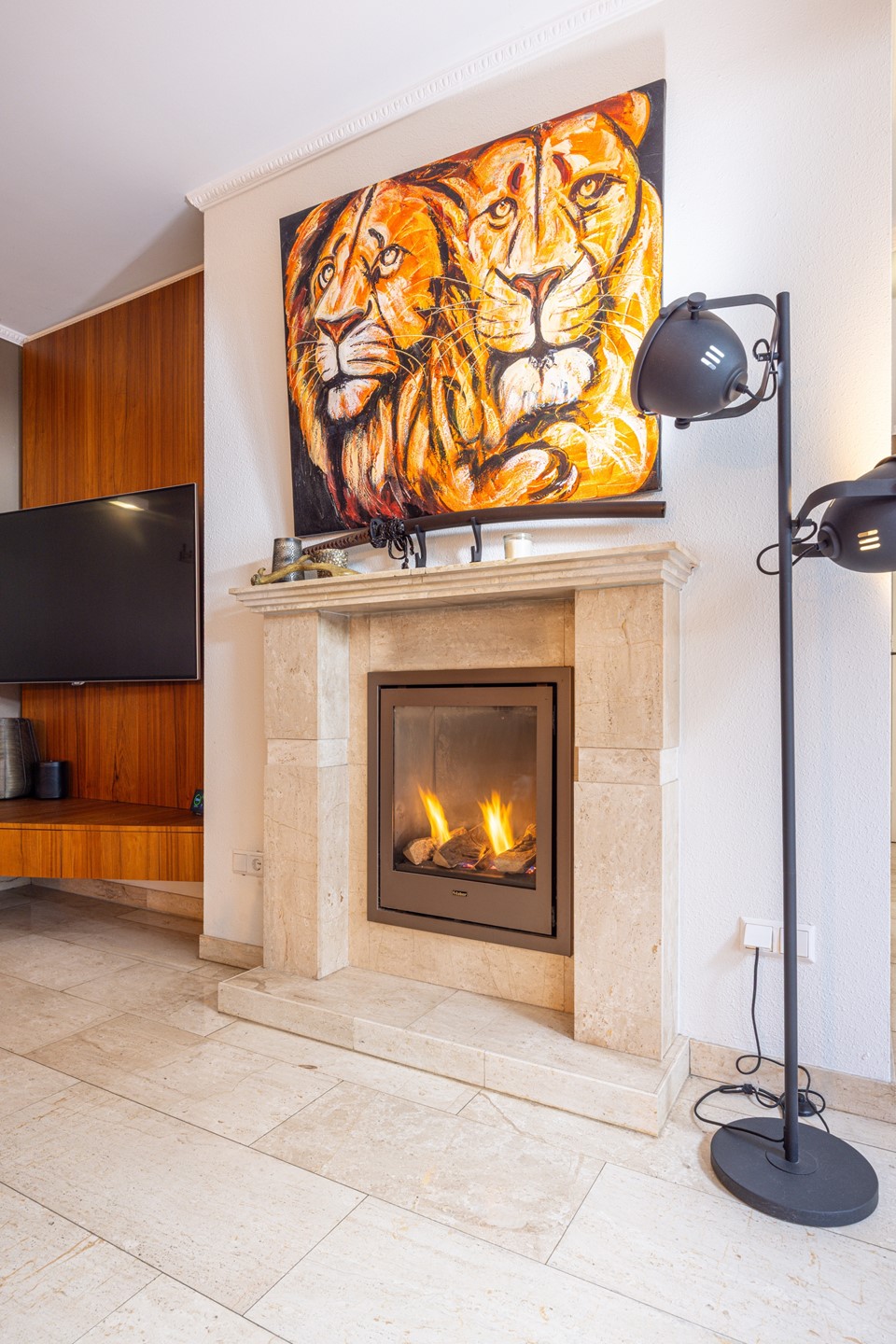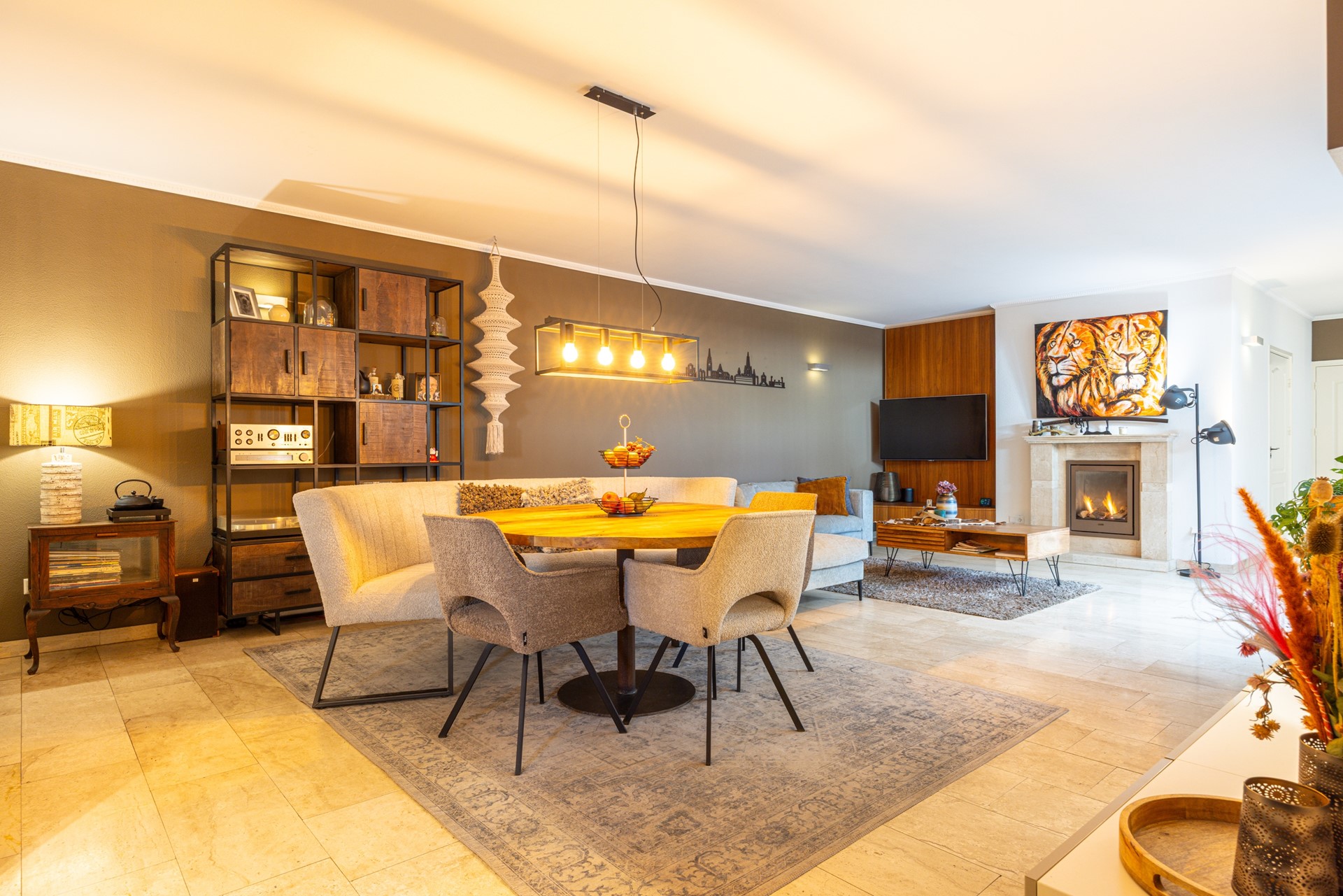 De woonkamer is ruim en licht dankzij de grote raampartijen en afgewerkt met een travertinvloer met vloerverwarming. De hardhouten kozijnen zijn grotendeels voorzien van HR++ beglazing. Via schuifdeuren sta je in directe verbinding met de aangrenzende kantoorruimte en de wellnessruimte. De wellnessruimte is in dezelfde hoogwaardige stijl uitgevoerd met een travertinvloer met vloerverwarming en hardhouten kozijnen met HR++ beglazing en staat via een trap in verbinding met de bovenliggende woonlaag. De kantoorruimte vormt een volwaardige werkruimte en wordt verwarmd middels een pelletkachel en een warmtepomp airco.