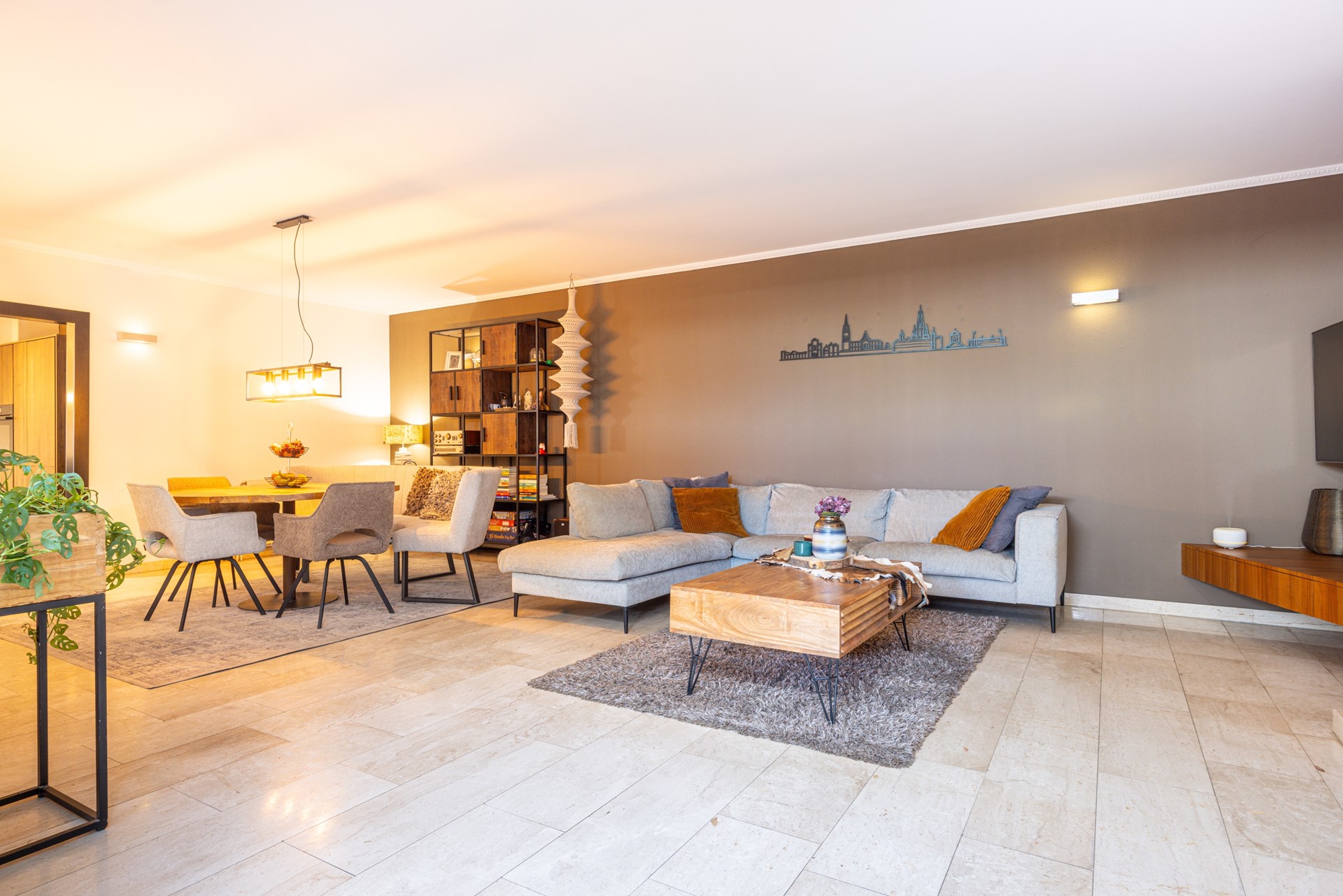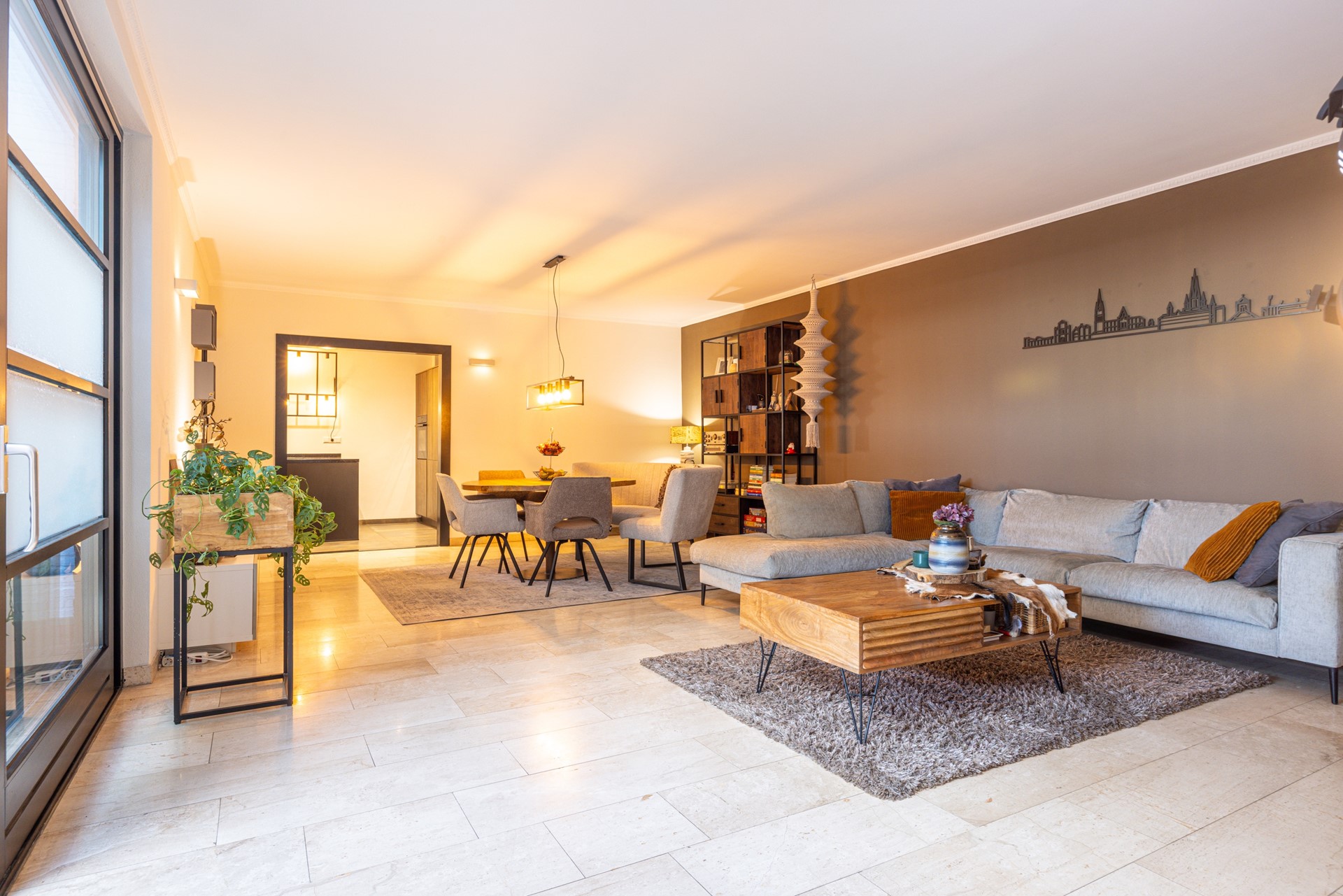 De woonkamer en keuken vormen samen een open en ruim geheel, afgewerkt met een laminaatvloer. De woonkamer is licht en voorzien van ramen met shutters, biedt ruimte voor een zit- en eethoek en beschikt over een airco-installatie (koelen en verwarmen). Indien gewenst is deze ruimte op te splitsen in twee slaapkamers.