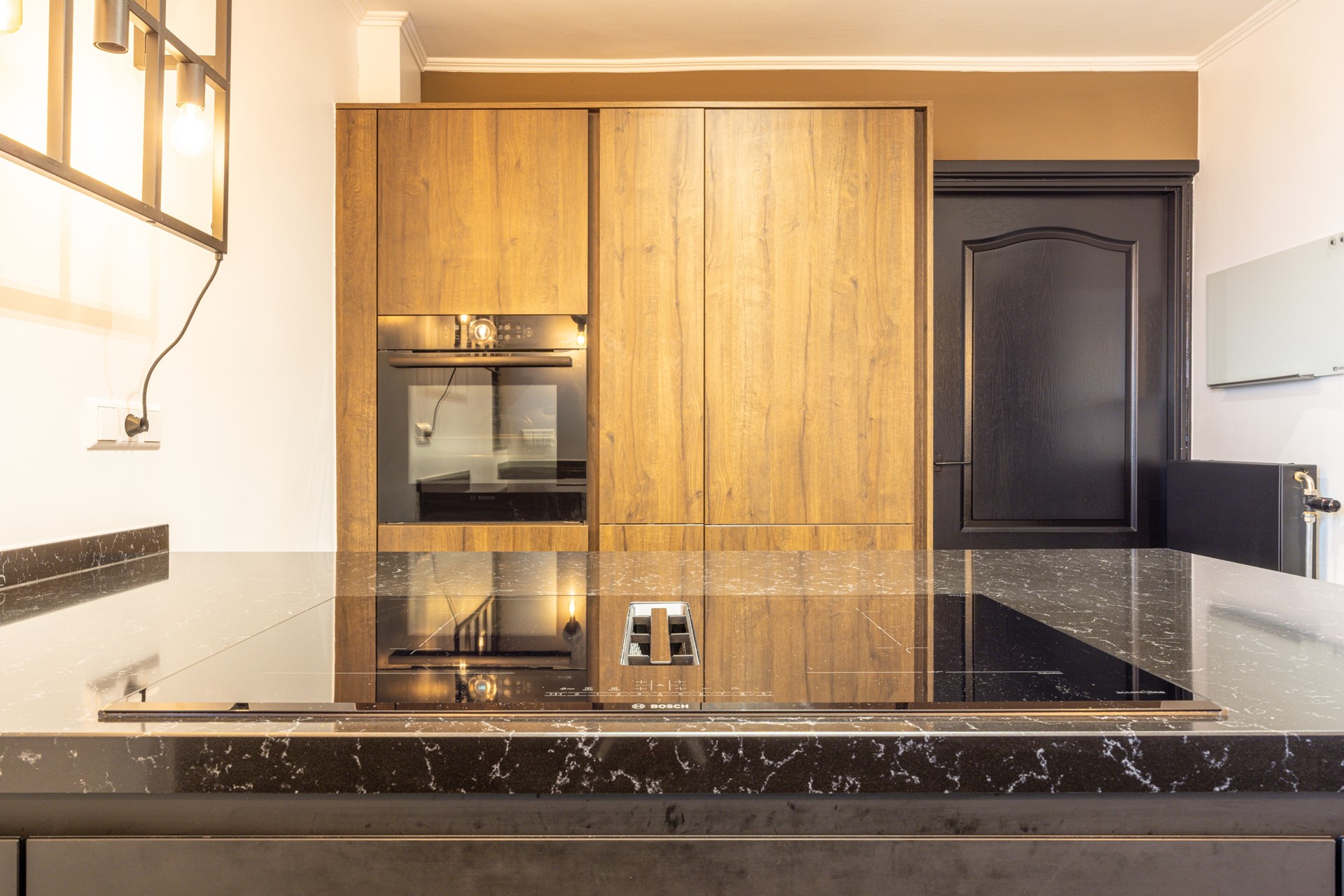 De open keuken (2021) sluit hier naadloos op aan en is uitgevoerd met een tegelvloer, hardhouten kozijnen met HR++ beglazing en hor, en beschikt over volop kast- en werkruimte. De keuken is compleet uitgerust met onder andere een 4-pits inductiekookplaat met geïntegreerde afzuiging, heteluchtoven, koelkast en vaatwasser. Aansluitend ligt de bijkeuken met witgoedaansluitingen en extra bergruimte.
