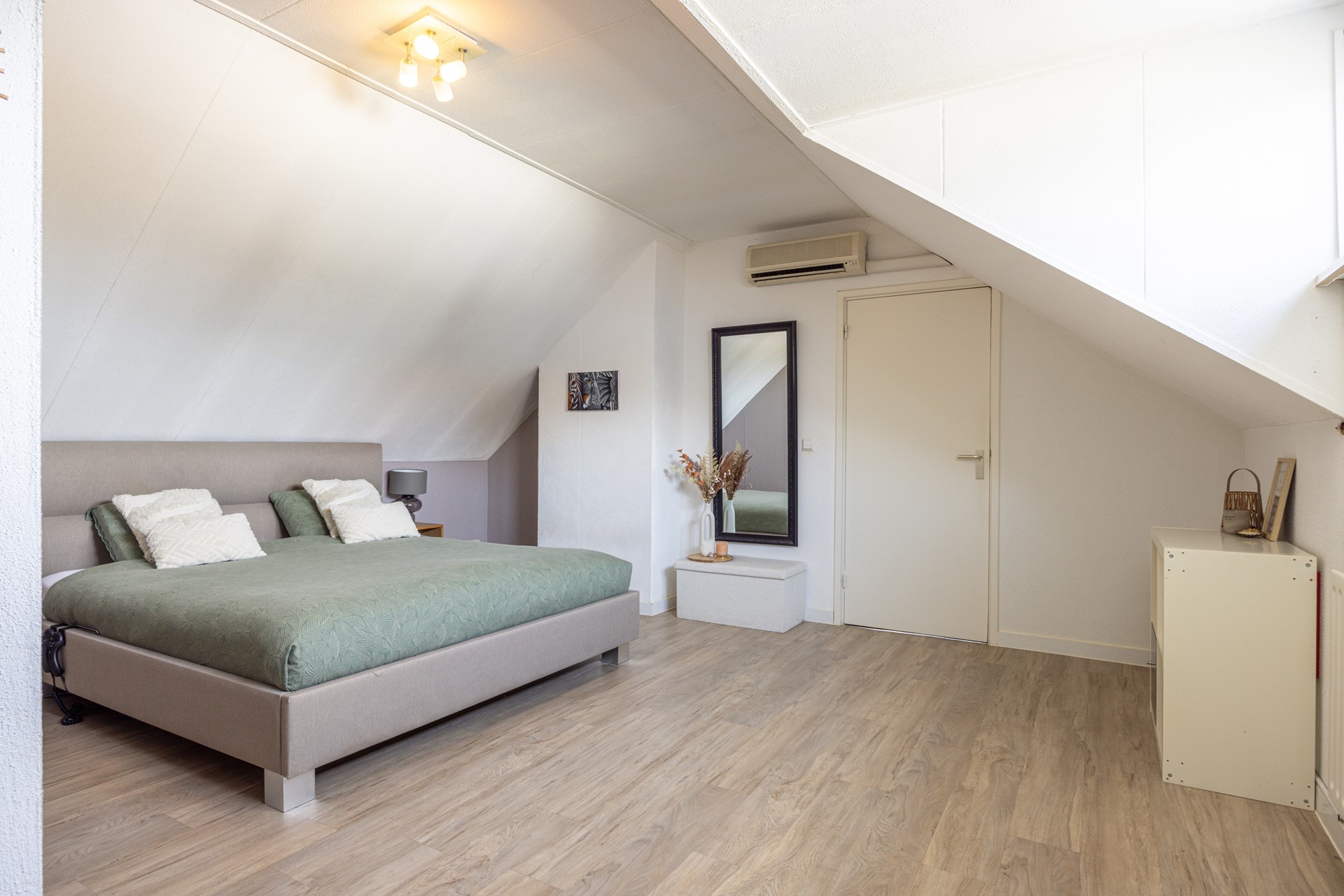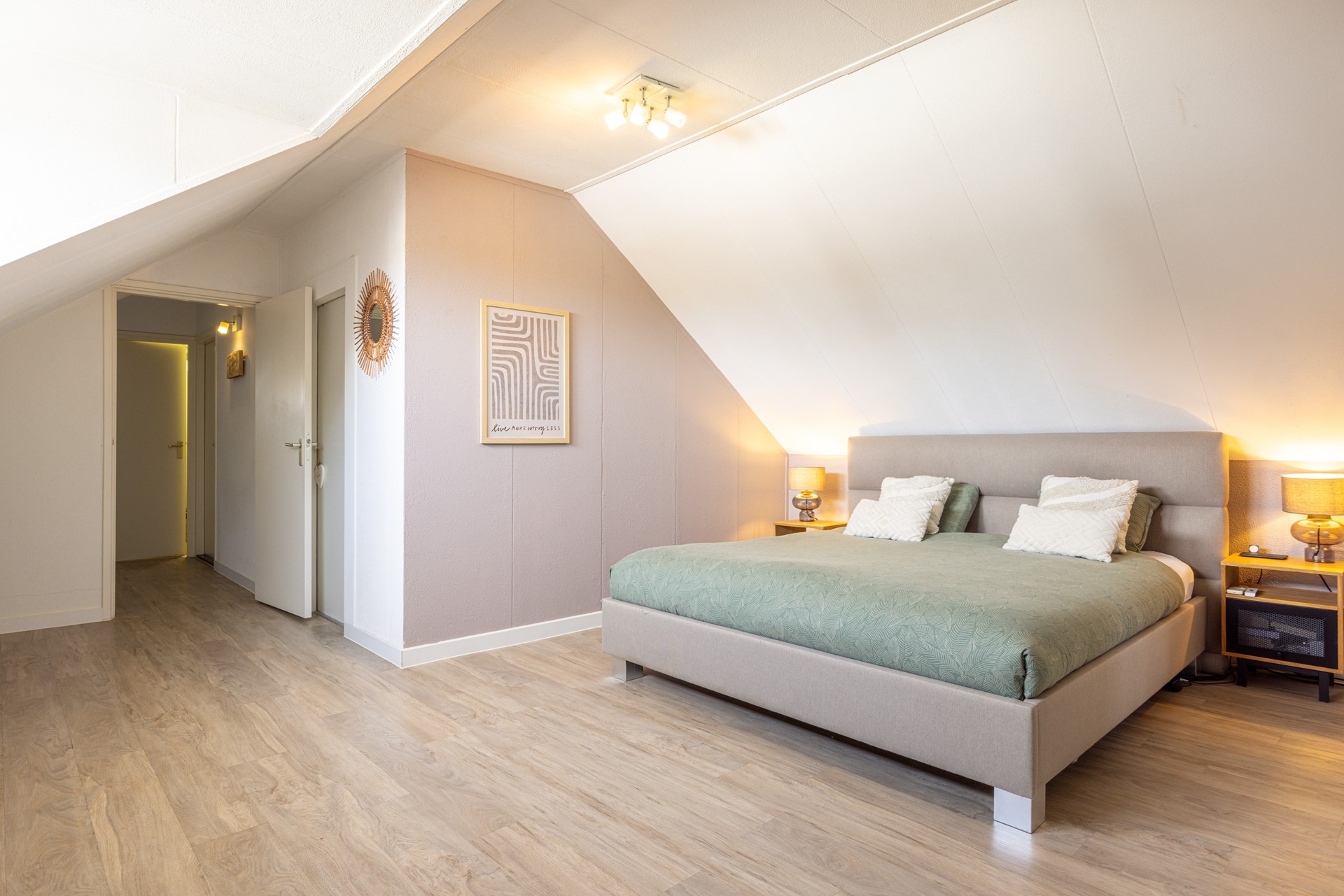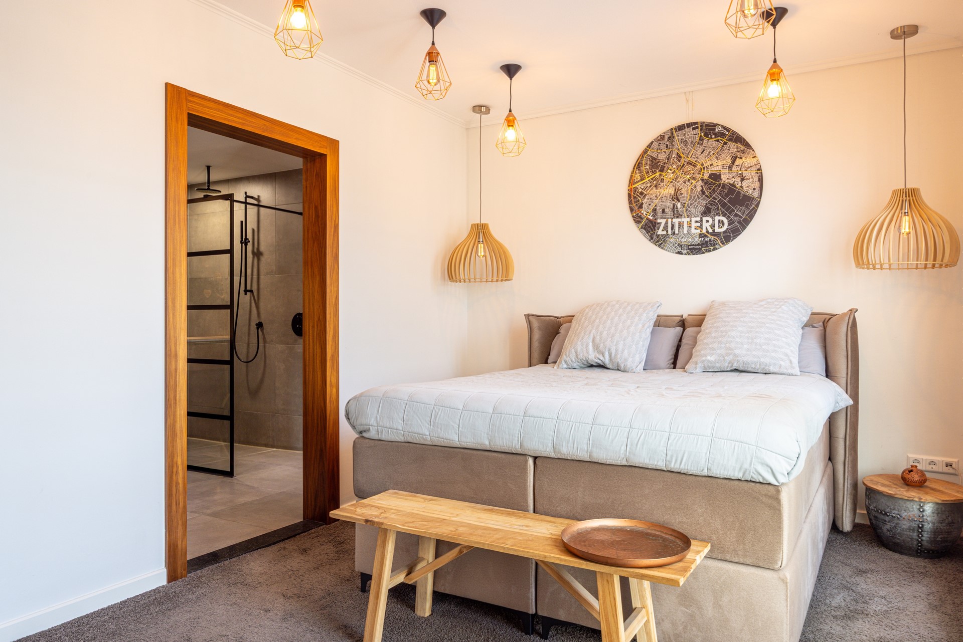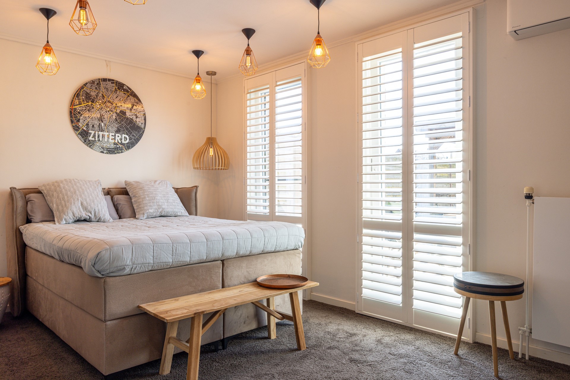 Via de woonkamer bereik je een royale slaapkamer met directe toegang tot de badkamer, samen een comfortabel en logisch geheel met uitzicht op de tuin. De slaapkamer is ruim en licht, afgewerkt met tapijt en voorzien van hardhouten kozijnen met HR++ beglazing en op maat gemaakte shutters. Daarnaast beschikt de kamer over twee elektrische rolluiken, een hor, een airco (koelen en verwarmen) en een praktische inbouwkast.