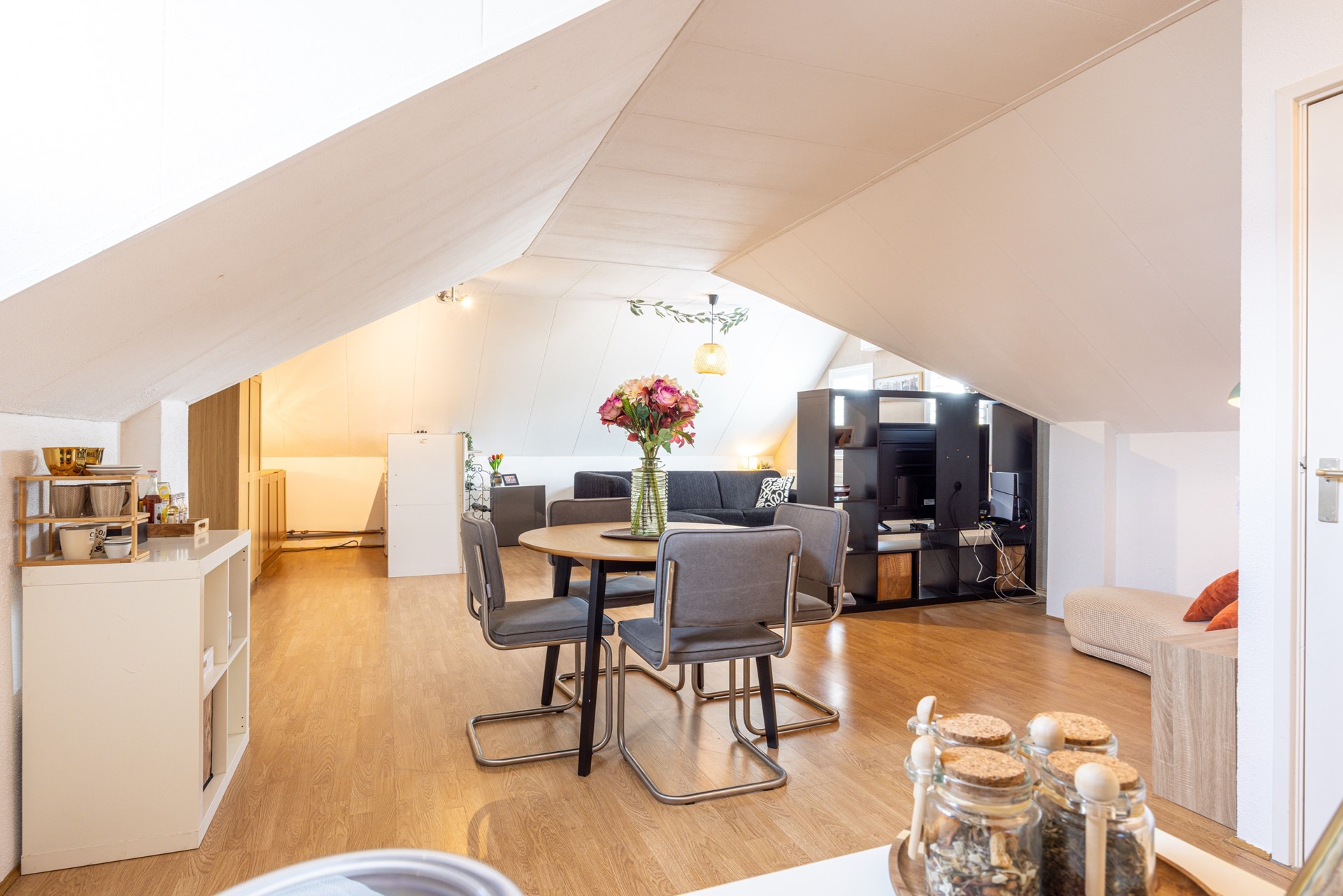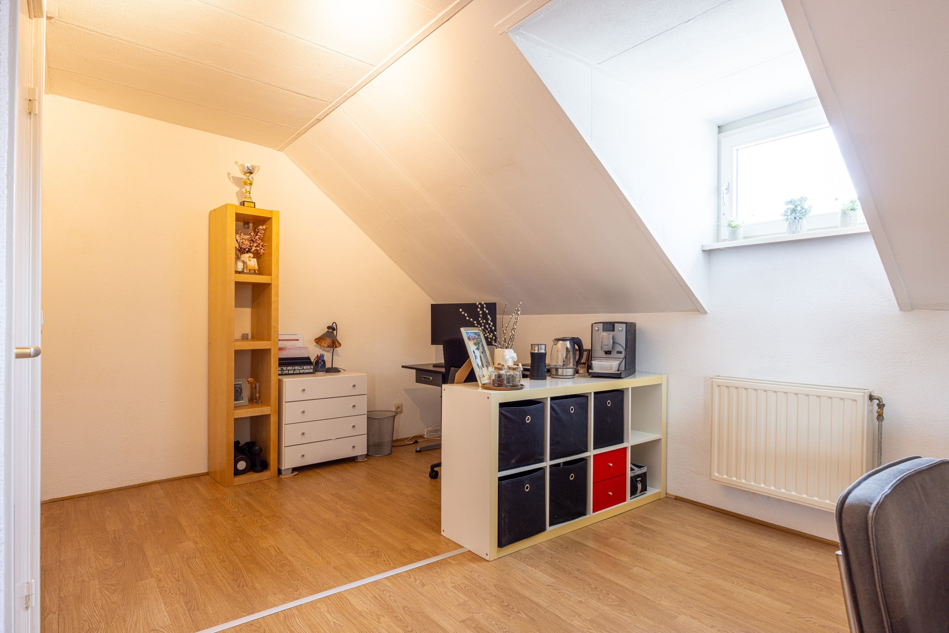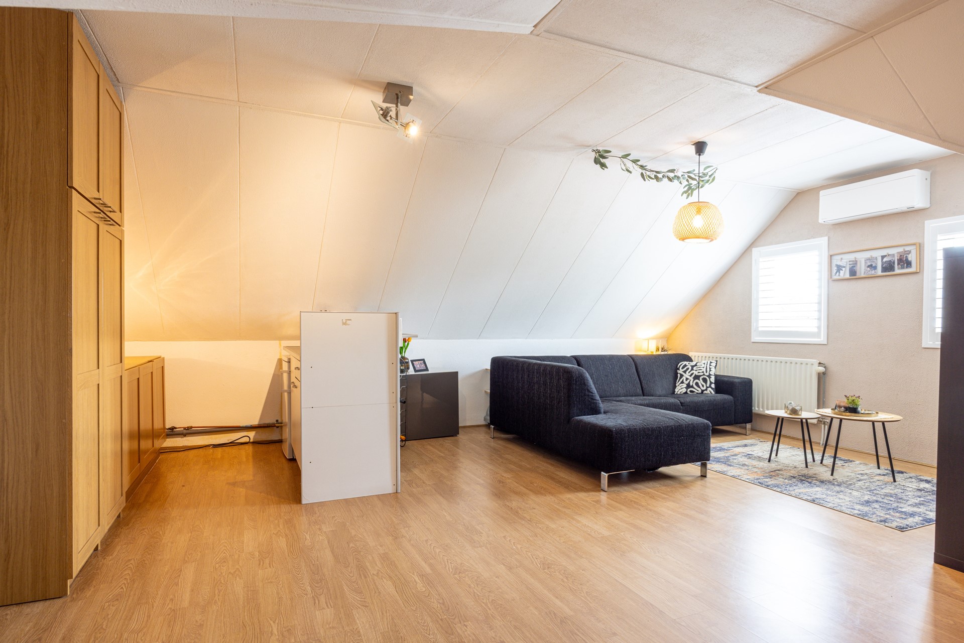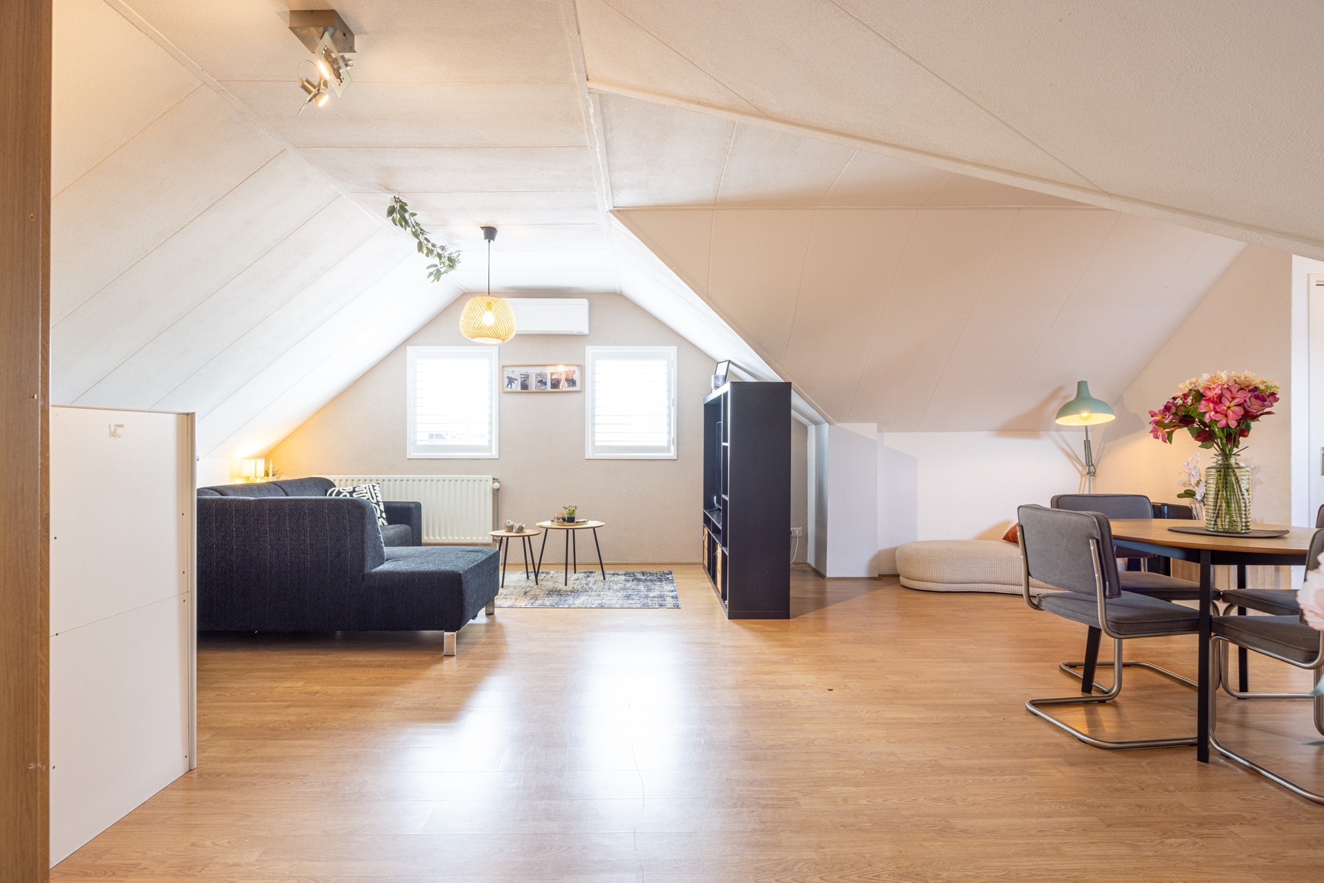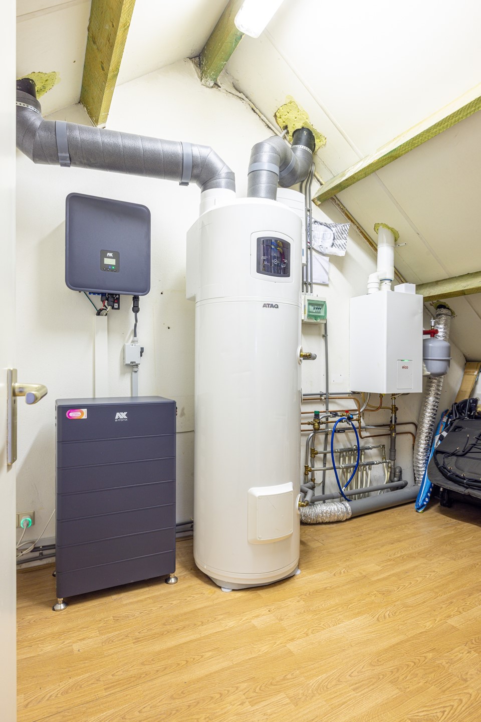 Deze verdieping maakt de woning extra veelzijdig en is ideaal voor dubbele bewoning, een inwonend gezinslid of een separate leefruimte. Via de houten trap bereik je de ruime overloop. Hier heb je toegang tot een ruime zolderkamer die eenvoudig is in te richten als extra slaapkamer, de badkamer, de hoofdslaapkamer, en de technische ruimte met cv-installatie, warmteboiler en thuisbatterij. De overloop is afgewerkt met een pvc-vloer en voorzien van een raam met hardhouten kozijnen, dubbel glas en hor.